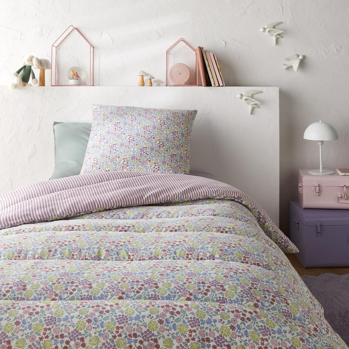 A bouquet of flowers pattern combined with two-tone stripes: Field, the promise of poetic and cosy decoration. The set includes a patterned comforter and its matching pillowcase. Product Details Quilt • 100% polyester cover, including 55% recycled polyester • 100% polyester filling including 100% recycled polyester 300g/m² • Front floral print, reverse two-tone vertical stripes print Pillowcase • Zip fastening • Unfilled, pillow sold on the site. Match this item with the rest of the bedding in the range for a stylish bedroom. And you can mix and match it with different colours and styles from our other bedding ranges when you want to change things up and create your own unique look. Care Advice • Machine washable at 30°CSizes • Duvet : 140 x 200cm: Single • Pillowcase : 63 x 63cm: Square • Recycled polyester. Using recycled polyester is all about conserving resources and reducing waste. • Recycled polyester padding. Using recycled polyester padding is all about conserving resources and reducing waste. • OEKO-TEX® Standard 100. Standard 100 certification by OEKO-TEX® tests textile products for harmful substances via an independent, international label.