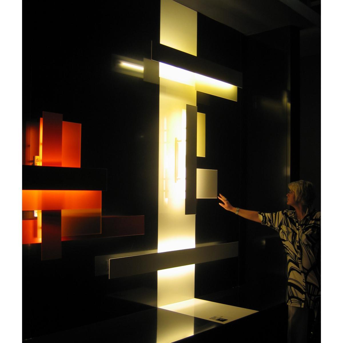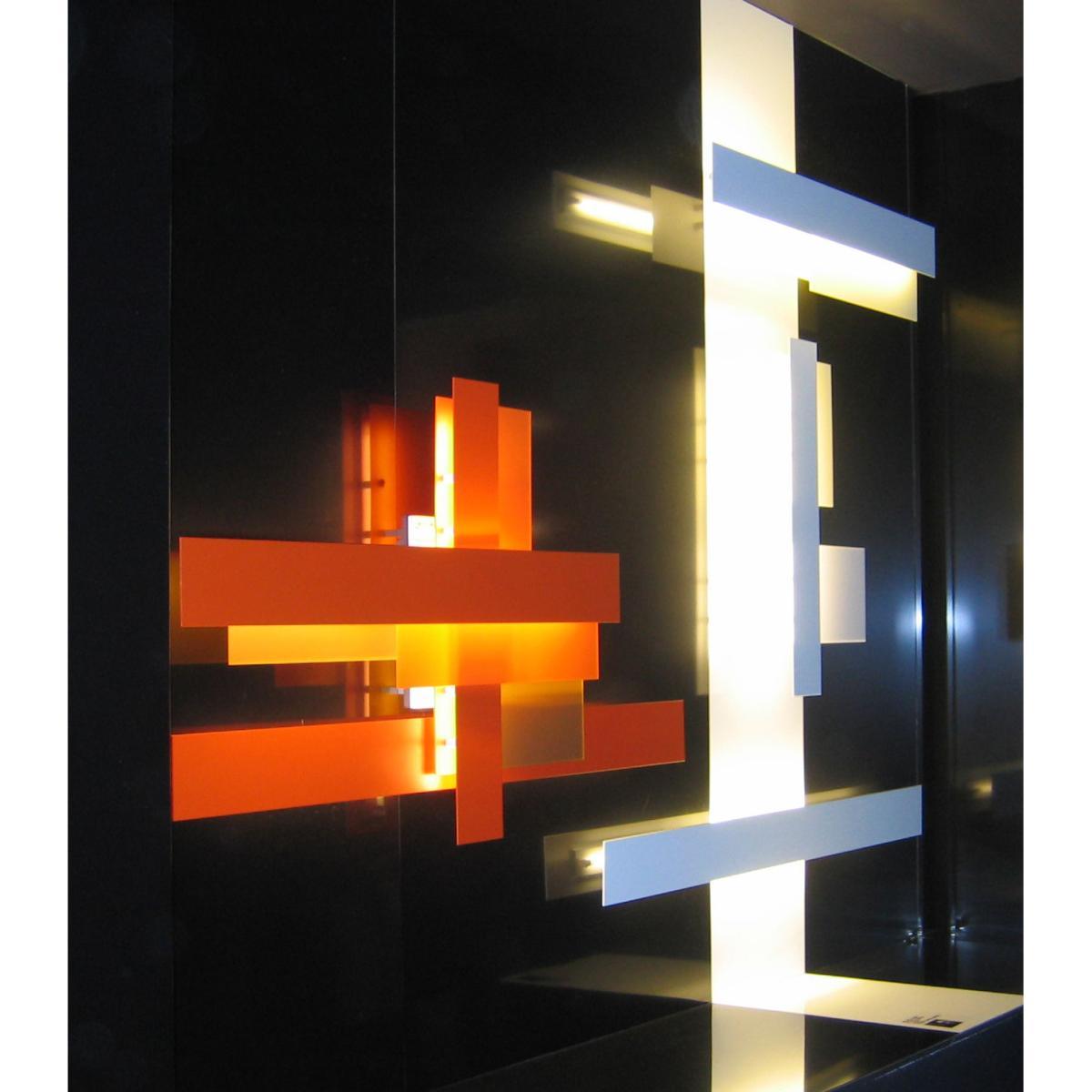 Simple, essential shapes, dampened by rich and intense hues. A composition that provides a fascinating effect of warm, enveloping light and a linear construction that develops over various layers of crossing, overlapping planes. The design concept originates from a suggestive and moving panoramic, almost aerial, view that pays tribute to the designer's homeland of Mancha, an area of Spain steeped in contrasts that extends over the fields as far as the eye can see. These fields form the focus of Jimenez's inspiration. Modularity is the distinguishing characteristic of Fields: available in three different elements that can be supplied individually and matched as you want, it is ideal for furnishing both large and small areas, according to the number of elements used. Modular wall lamp composed of methacrylic sheet and aluminium organised in three different elements that can be installed either individually or in combination to achieve a range of decorative effects.