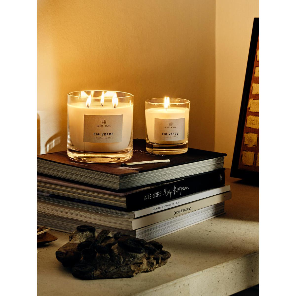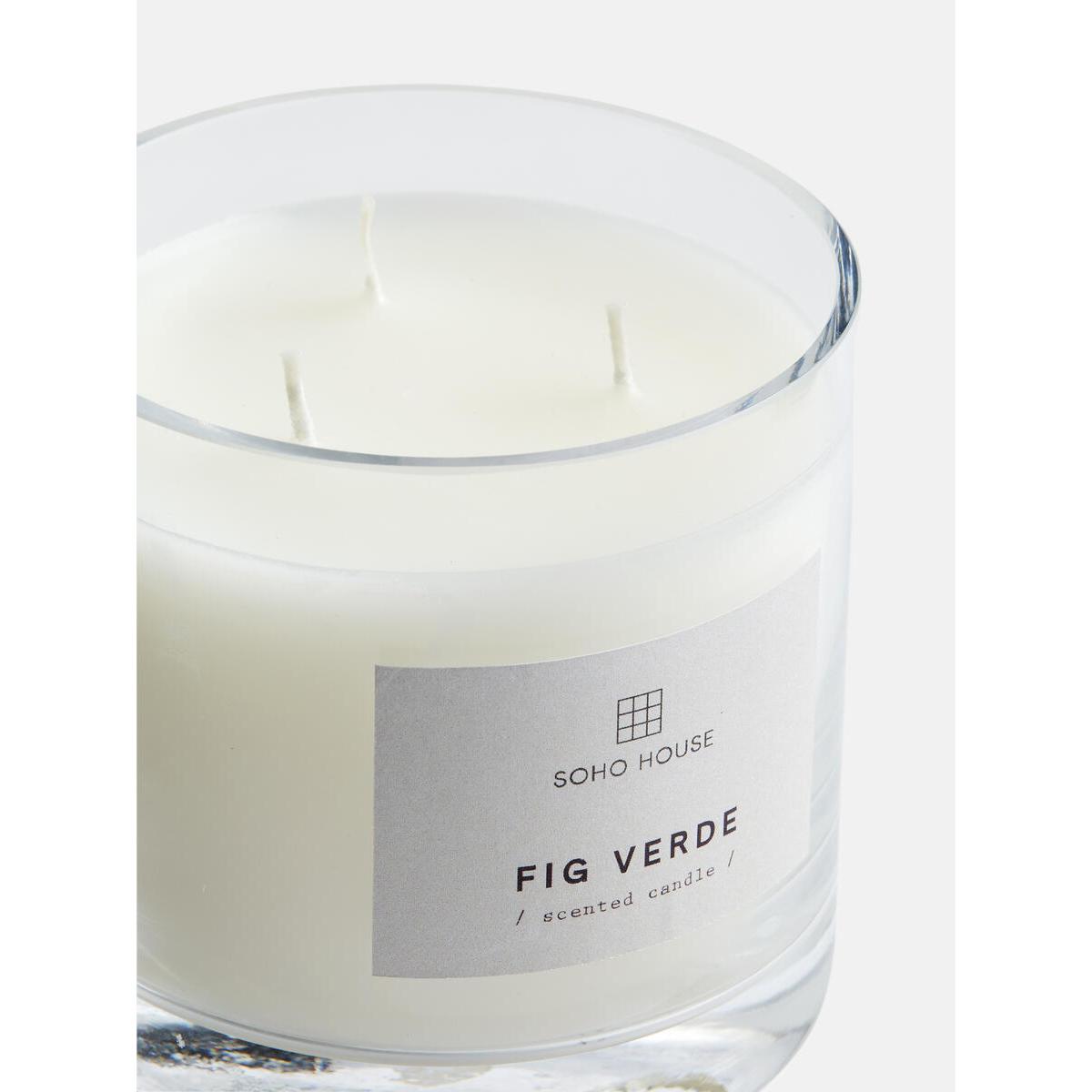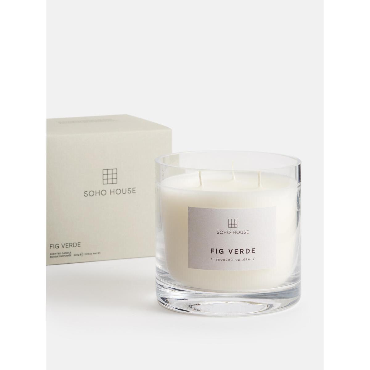 Our Fig Verde fragrance is infused with Green Figs, Dried Fruitand Rose Petals to recall evening strolls around the courtyardgarden at Soho House Istanbul. Each candle is hand-poured in. England using a blend of mineral and vegetable wax to provide aclean burn and long-lasting scent release. Scent notes. Top: Cassis. Middle: Fig. Base: Amber. Large three-wick candle with Fig Verde fragrance. Glass vessel. Mineral wax fill. Hand-poured in England. Approximate burn time: 70 hours. Bespoke fragrance created by an expert perfumer for Soho. House. Inspired by Soho House Istanbul.