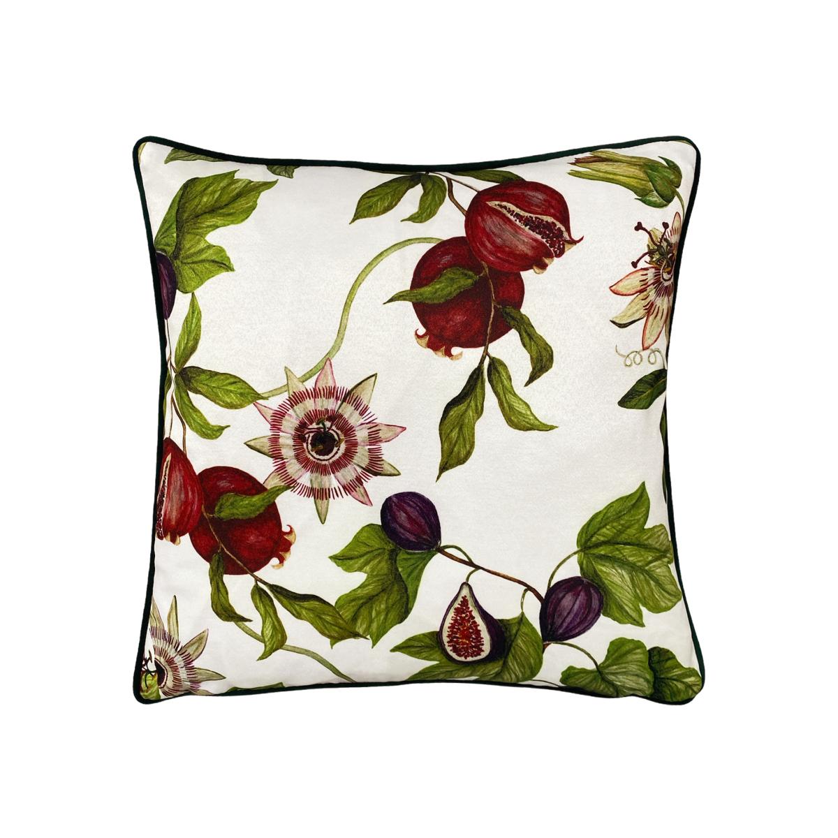 Dreaming of a far flung destination, the Figaro cushion depicts delicate passionflowers and sumptuous figs. Available in two stunning colourways.