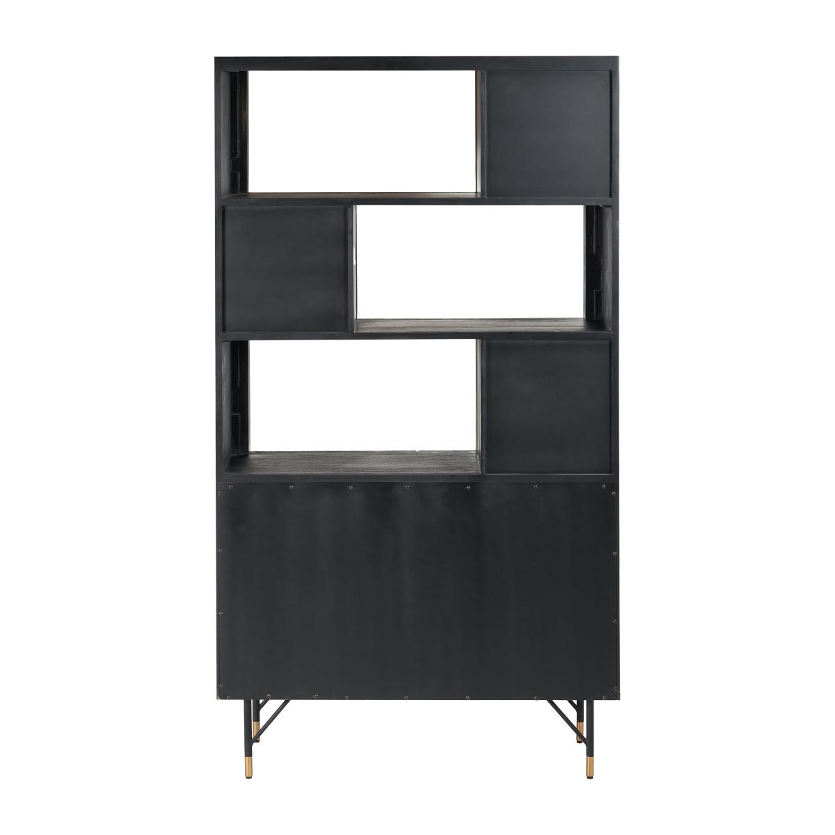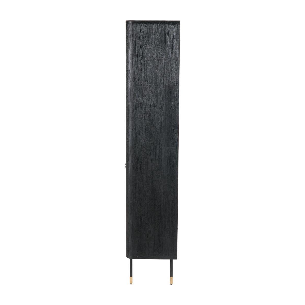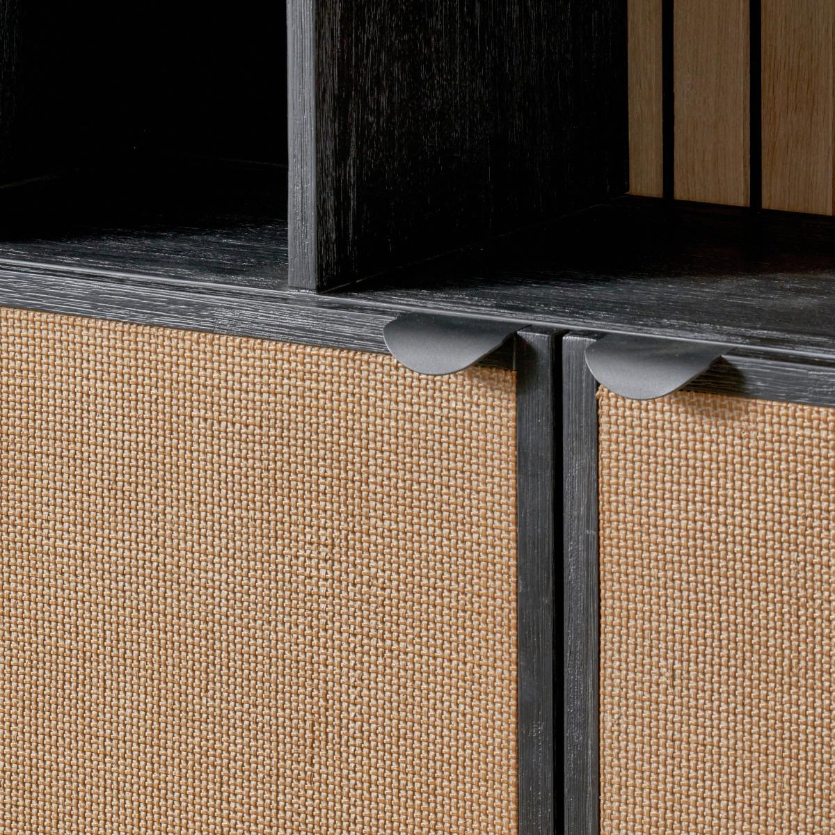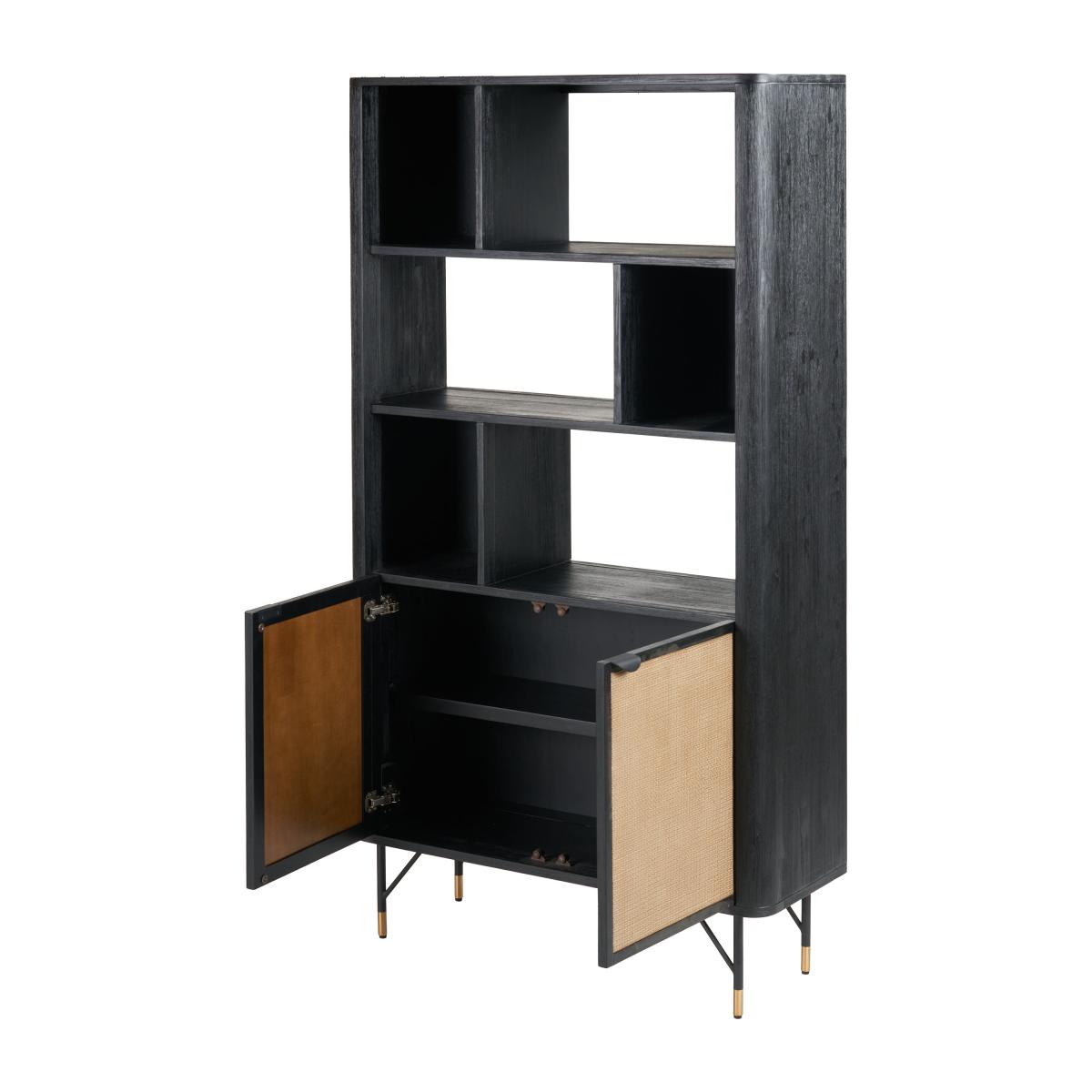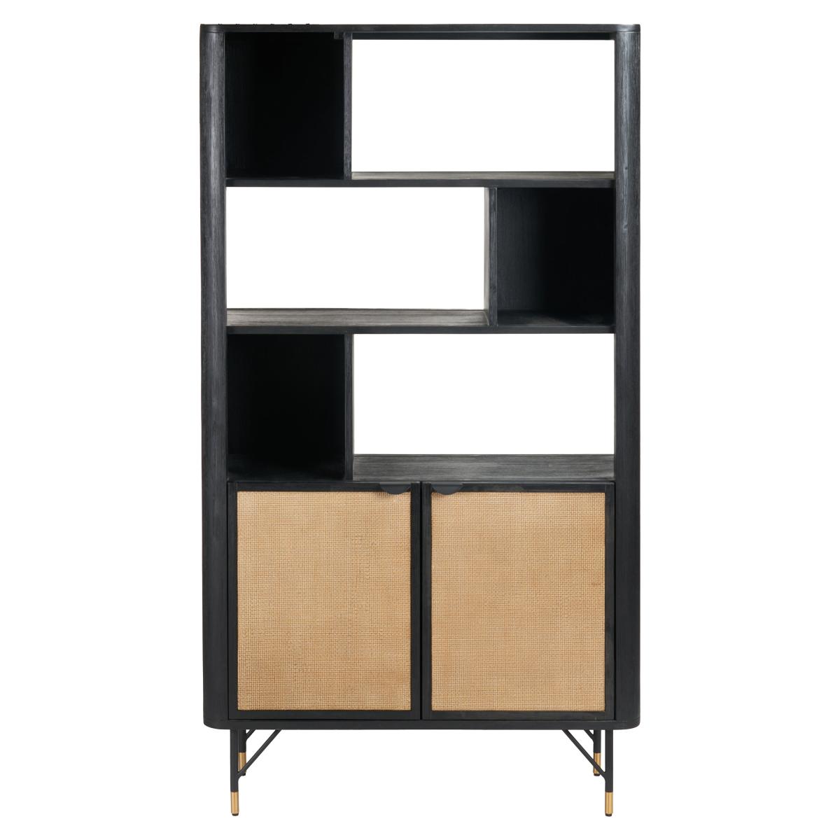 * Acacia Wood frame* Contrasting colours* Rattan panels* Internal shelving Crafted in Vietnam, this unit is made from robust Acacia wood and boasts a sleek matt black finish. The natural rattan panels on the doors offer a beautiful contrast, creating a unique and stylish look. With two doors and six niches, this shelf unit provides versatile storage options, perfect for displaying your favourite items while keeping others neatly tucked away.