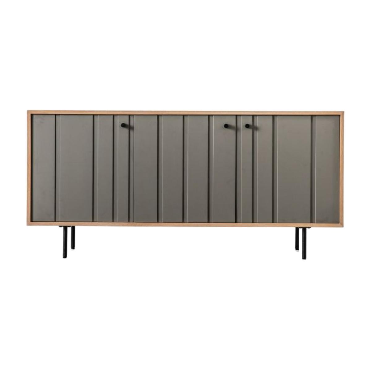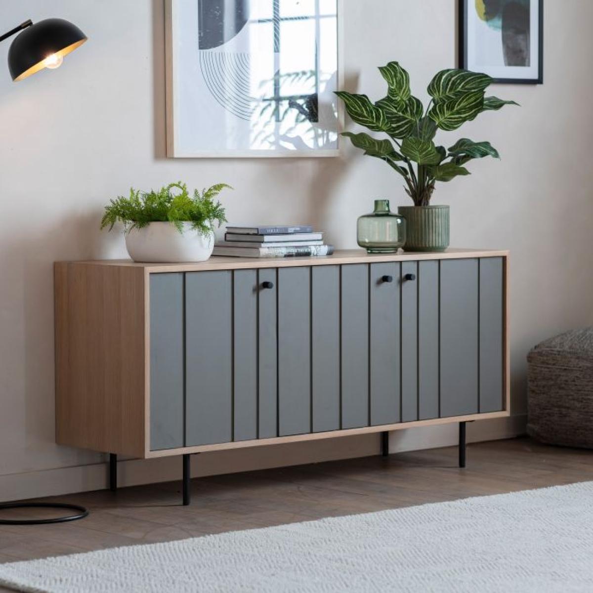 The Fiji furniture collection features a fusion of Japanese minimalism and Scandi style to create these beautiful contemporary Japandi design pieces. Natural oak has been paired with mid-grey painted, with routing to create a relief design adding detail to the doors. The Fiji 3 Door Sideboard combines the stylish design of the Fiji range with practical storage space. As well as the large cupboard area, there is an internal drawer within the sideboard which is ideal for smaller items. Slim black metal legs and handles add the finishing touch. Material: Oak. Colour/Finish: Grey.