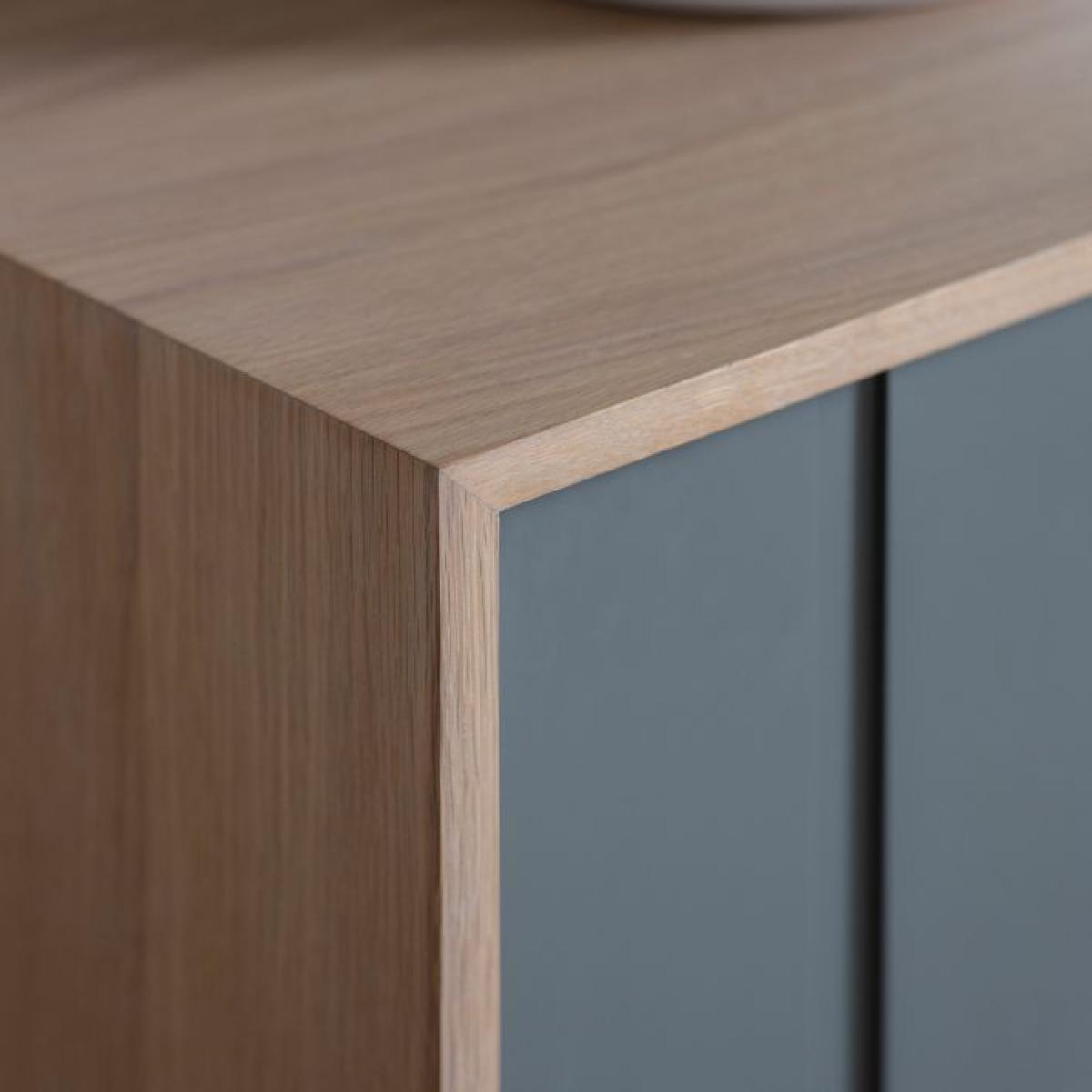 The Fiji furniture collection features a fusion of Japanese minimalism and Scandi style to create these beautiful contemporary Japandi design pieces. Natural oak has been paired with mid-grey painted, with routing to create a relief design adding detail to the doors. The Fiji 3 Door Sideboard combines the stylish design of the Fiji range with practical storage space. As well as the large cupboard area, there is an internal drawer within the sideboard which is ideal for smaller items. Slim black metal legs and handles add the finishing touch. Material: Oak. Colour/Finish: Grey.