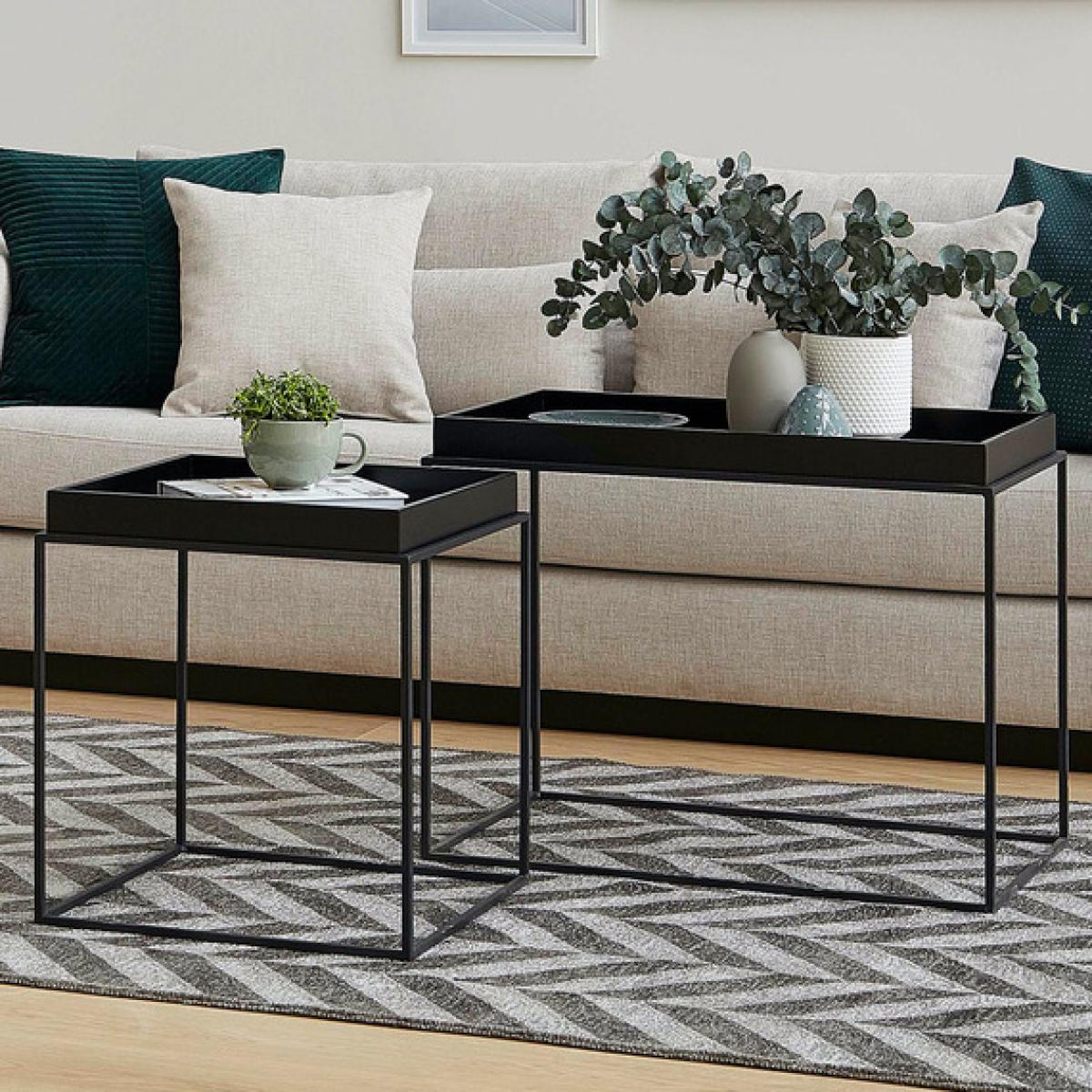I love this set of two black coffee tables for their versatility and sleek, minimalist look. Their different sizes make them perfect for layered styling or adaptable tactile arrangements, especially in modern or contemporary interiors. They work well in living rooms with neutral palettes, providing a stylish contrast without overpowering. Practical tips include pairing them with textured textiles or metallic accents to add interest, and using the smaller table as a convenient spot for drinks or books. Their clean lines and understated colour make them a flexible choice that can anchor various colour schemes and design styles, from Scandi to industrial.