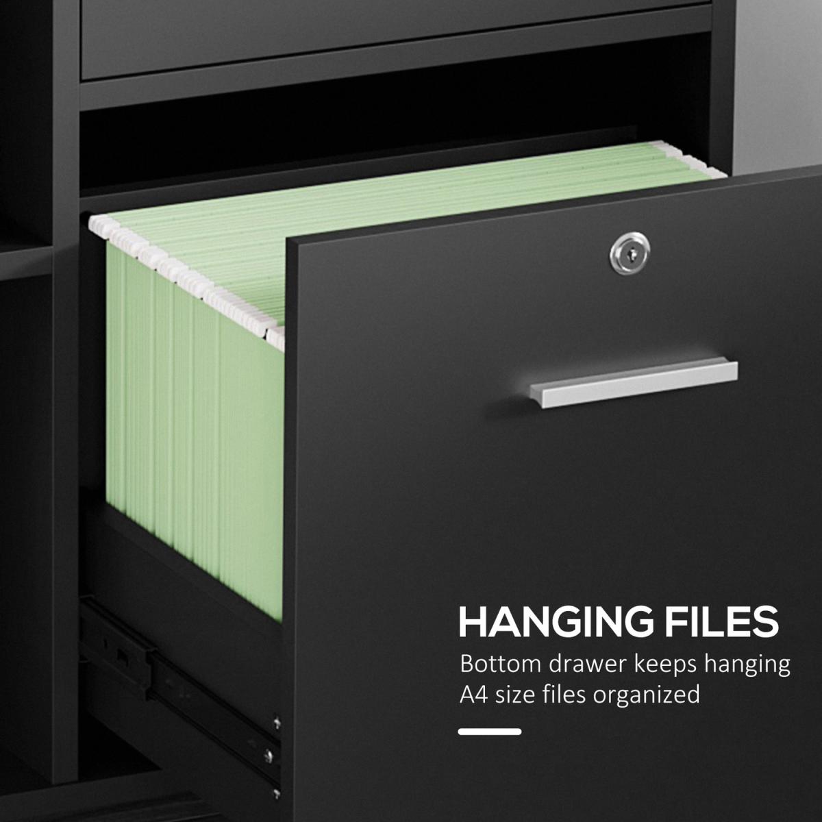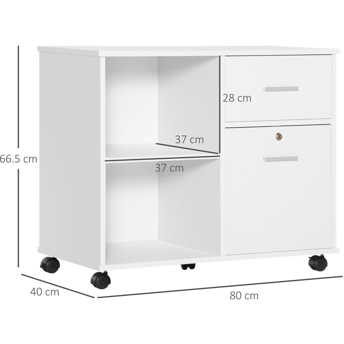 It comes with two shelves, top drawer and bottom drawer for holding plenty of files, folders and stationery. The top is flat and spacious enough for a printer. Four castor wheels to move it around easily - two can be locked. The bottom drawer is lockable for security - with two keys included.