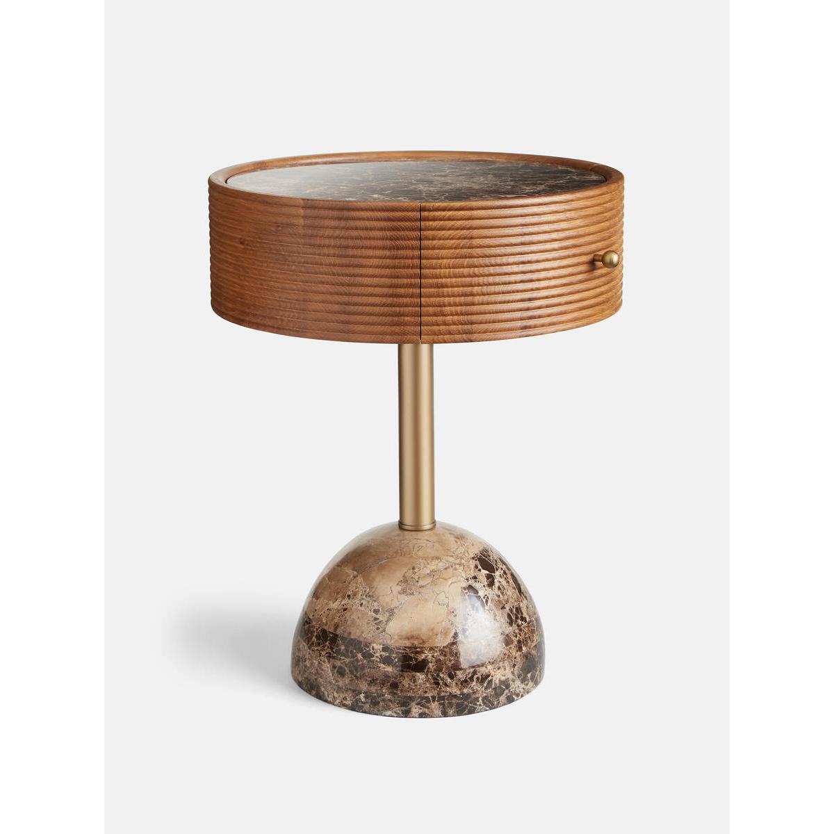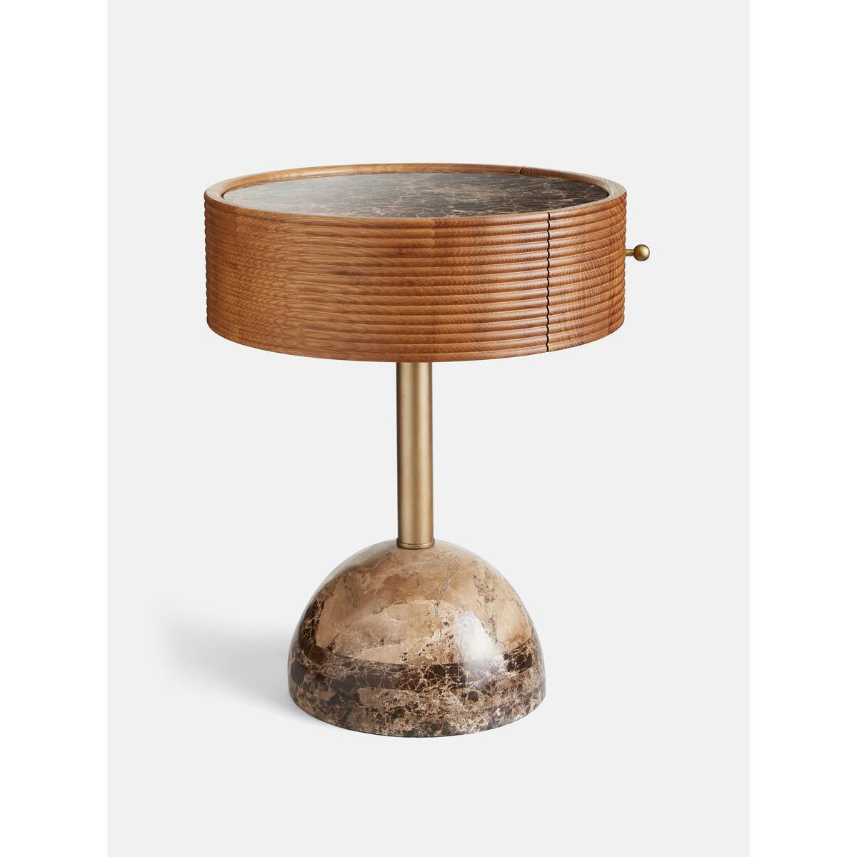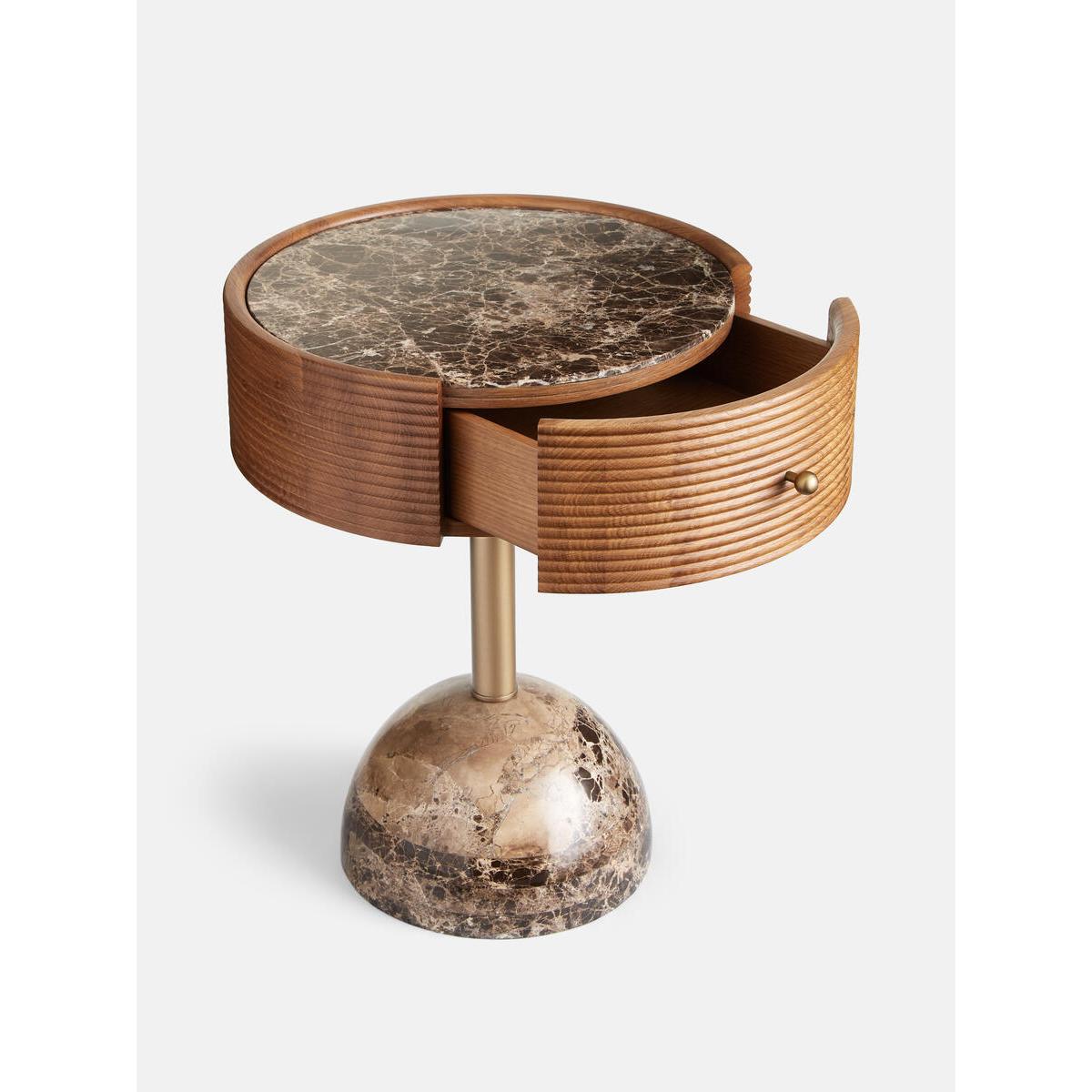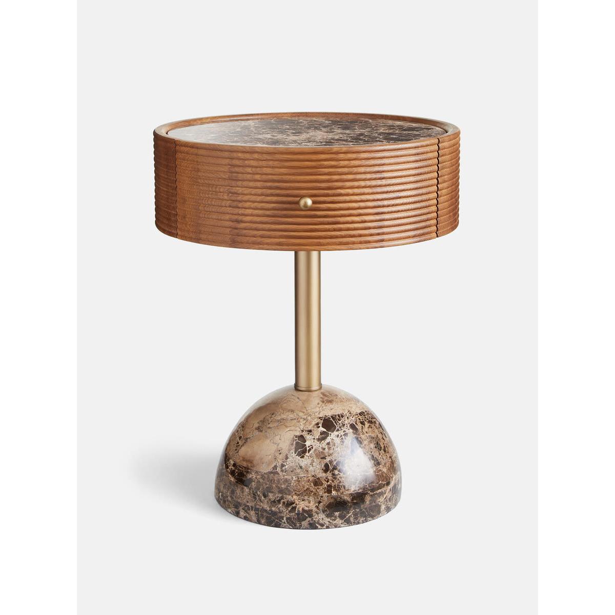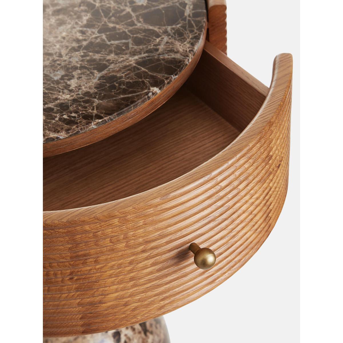 A contemporary take on the bedside table, our round Filip design features dark Emperador marble - a Spanish dark brown stone with defined white veining - on the top and base of this design. Horizontal fluted detail around the circumference of the top creates a textural ribbed finish with a single soft-close drawer to stow away your night-time essentials. A great addition to bring a touch of Soho House Rome into the bedroom. Round bedside table Dark Emperador marble sourced from Spain Antique brass finish handle and leg One soft-close drawer Horizontal fluted detail around circumference of the top Inspired by Soho House Rome