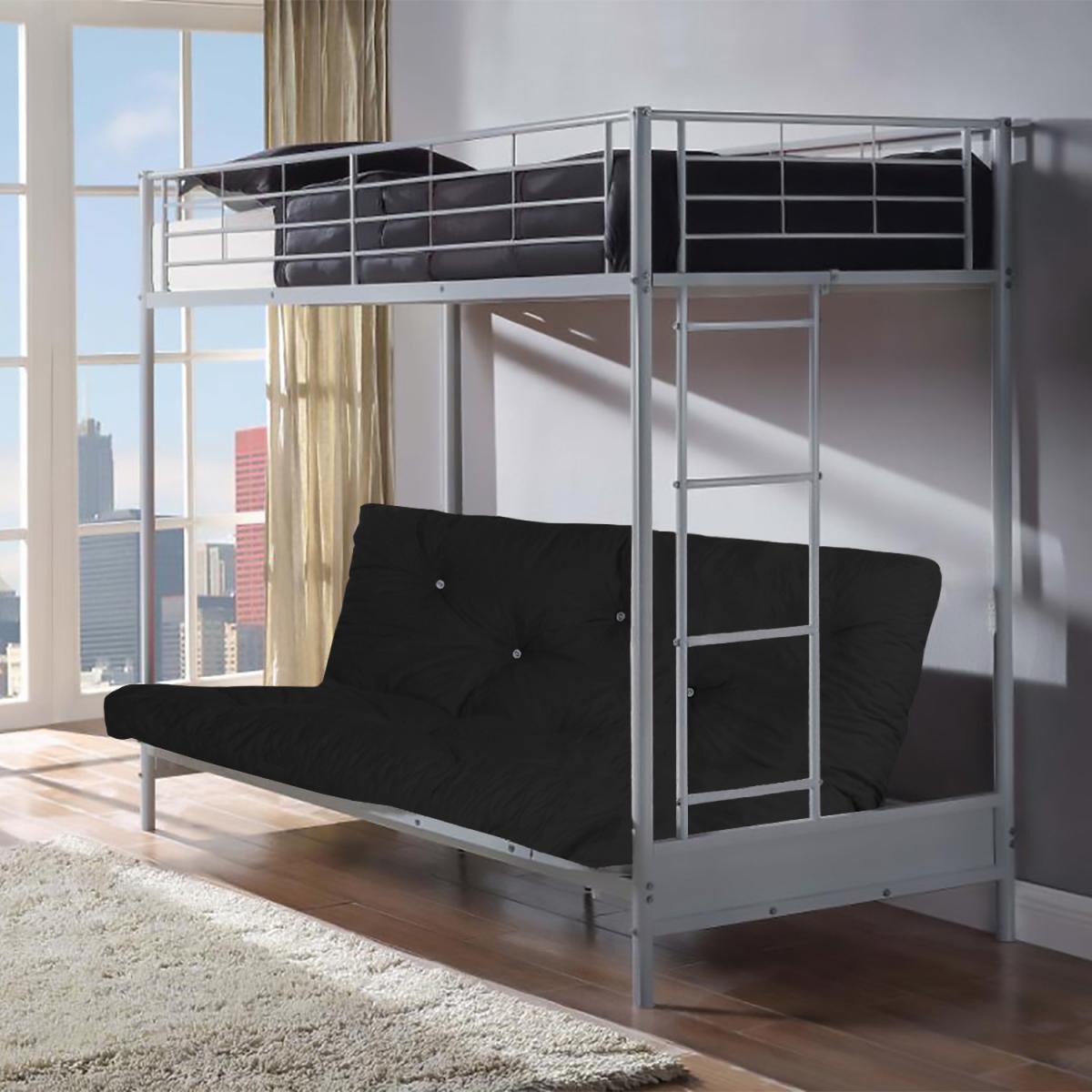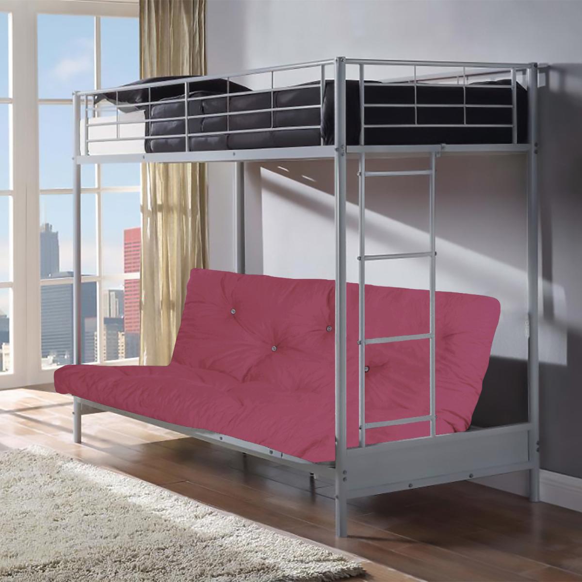 The Filton Futon Bunk Bed is great multipurpose bed as it offers sleeping capacity at the top and lounging facility at the bottom. The frame is made from strong durable metal and is suitable for children and teenagers The Humza Amani Futon Bunk Bed is the ideal space saver bed for your home. The futon is available is black, brown, blue, red, cream, lilac and pink.