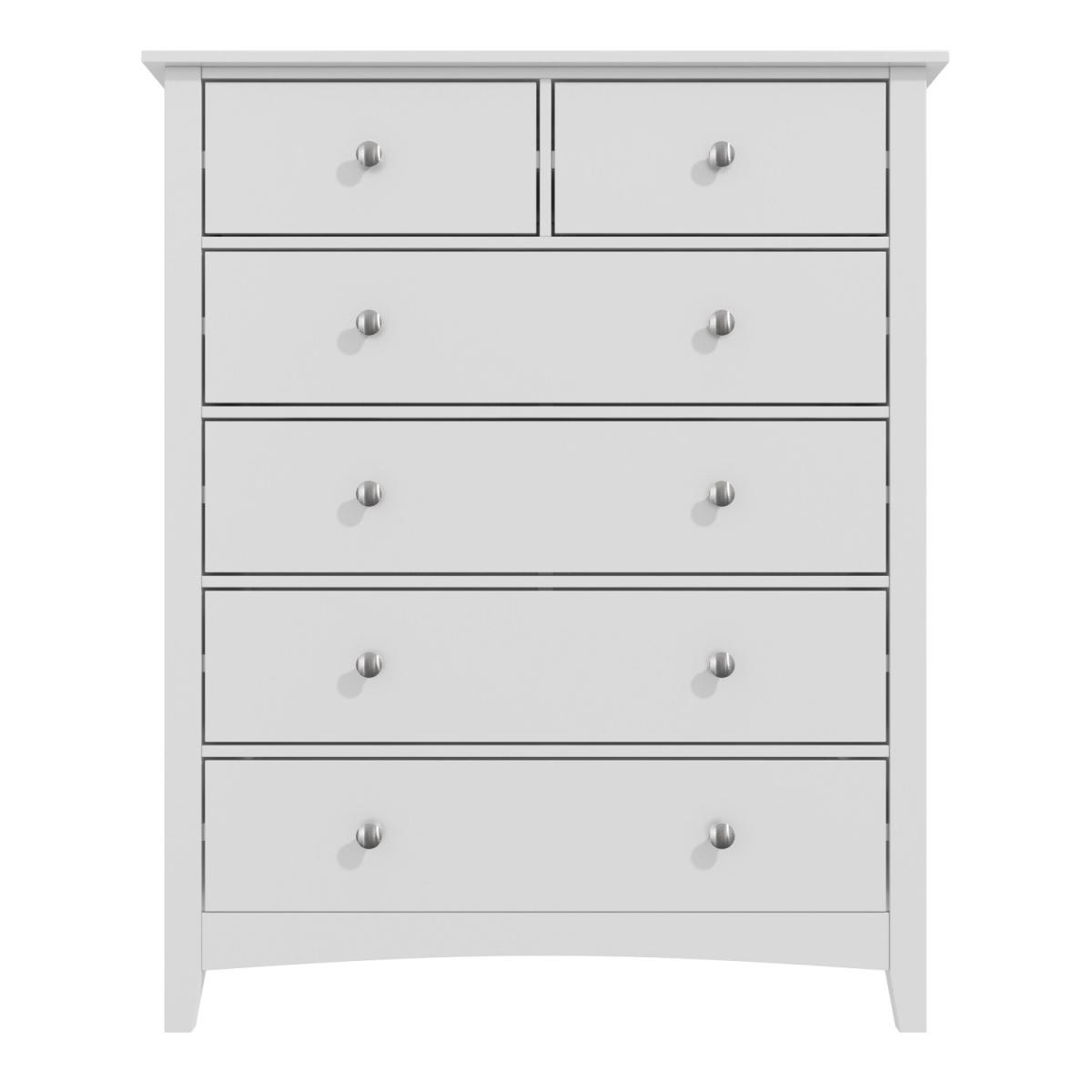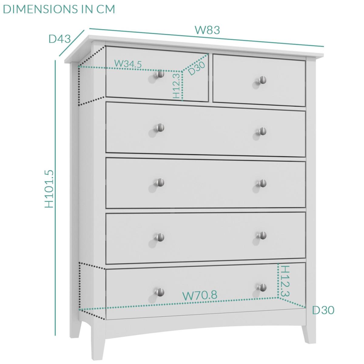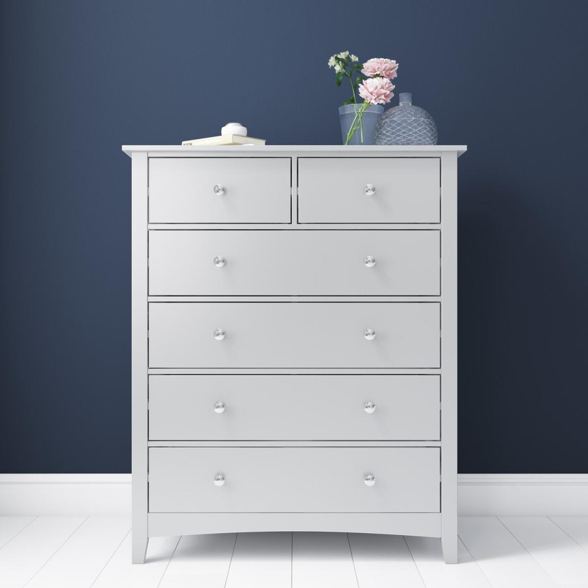 Features we love Light grey lacquered finish brightens up any room4 full width drawers to store all your folded clothes2 top drawers are perfect for keeping your smaller more delicate items. Shiny chrome drawer handles add a nice touch to the simple styling All about me. If you're looking to keep your t-shirts and jeans wrinkle-free then this elegant chest of drawers is exactly what you need. It's beautifully finished in a light grey painted lacquer finish that's designed to blend seamlessly with any bedroom setting. The chest offers four full width drawers for all your folded clothes and two top drawers that are great for storing your smaller delicate items. Its strong and sturdy MDF and pine construction means you can even use the spacious top surface to place your bedroom TV on. The Chest is also raised up off the floor so that it is easy to get underneath and clean. The chest of drawers is delivered flat pack and requires a little self-assembly. The instructions are really simple to follow and can be managed by one person. This chest of drawers is part of the Finch collection contemporary Shaker style furniture for the living room or bedroom. Essential info H101cm x W83cm x D43cm Part of the Finch Collection. Self-assembly required. Number of drawers 5 Smooth running drawers. Colour Crisp light grey lacquer finish. Made from a solid MDF and pine construction1 year warranty.