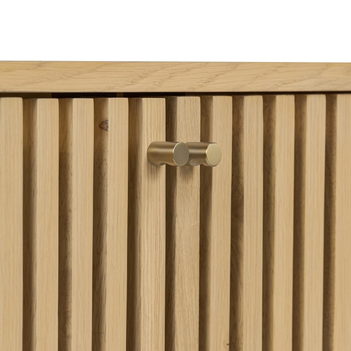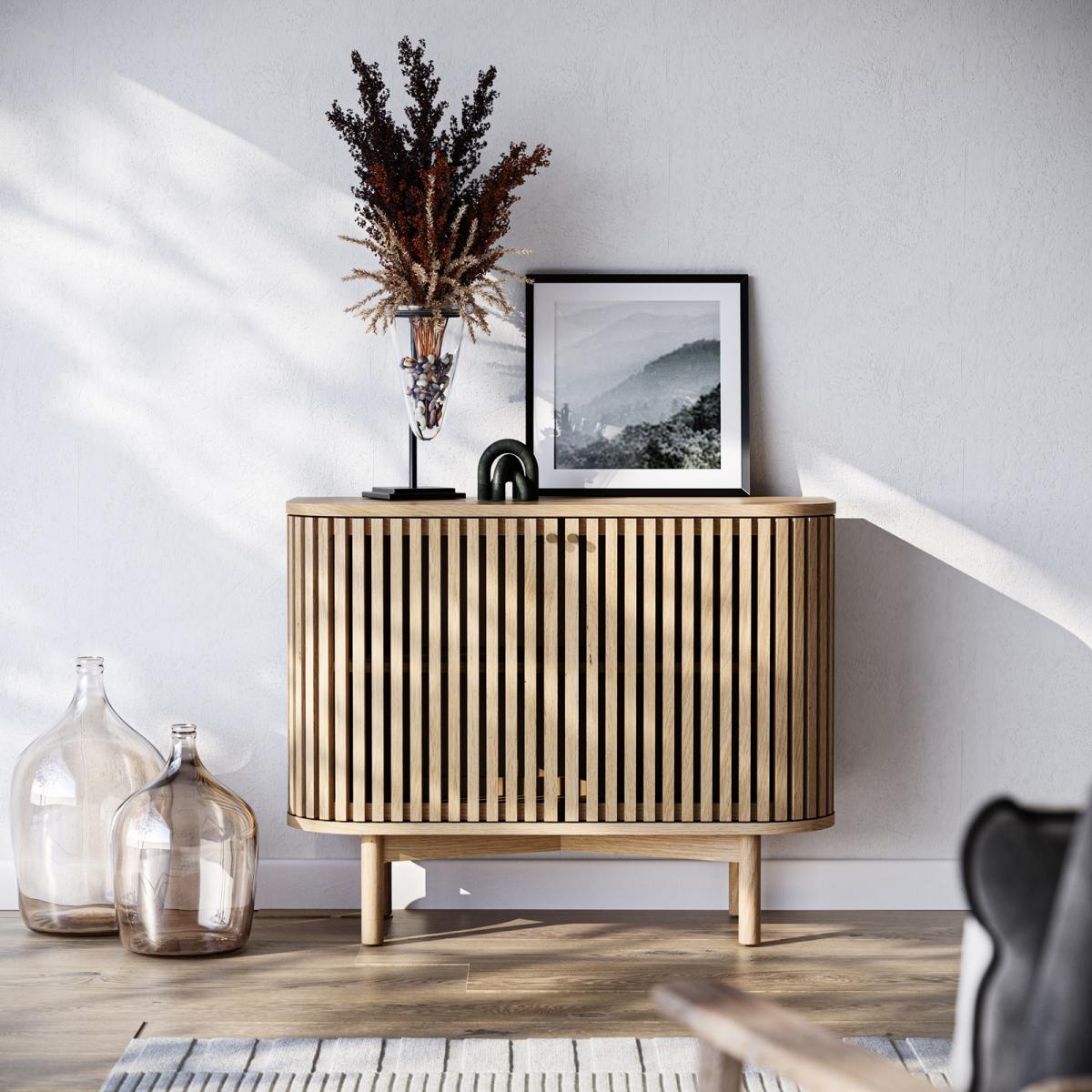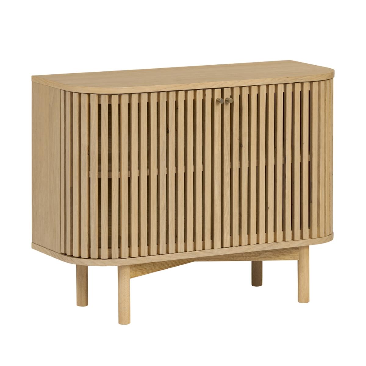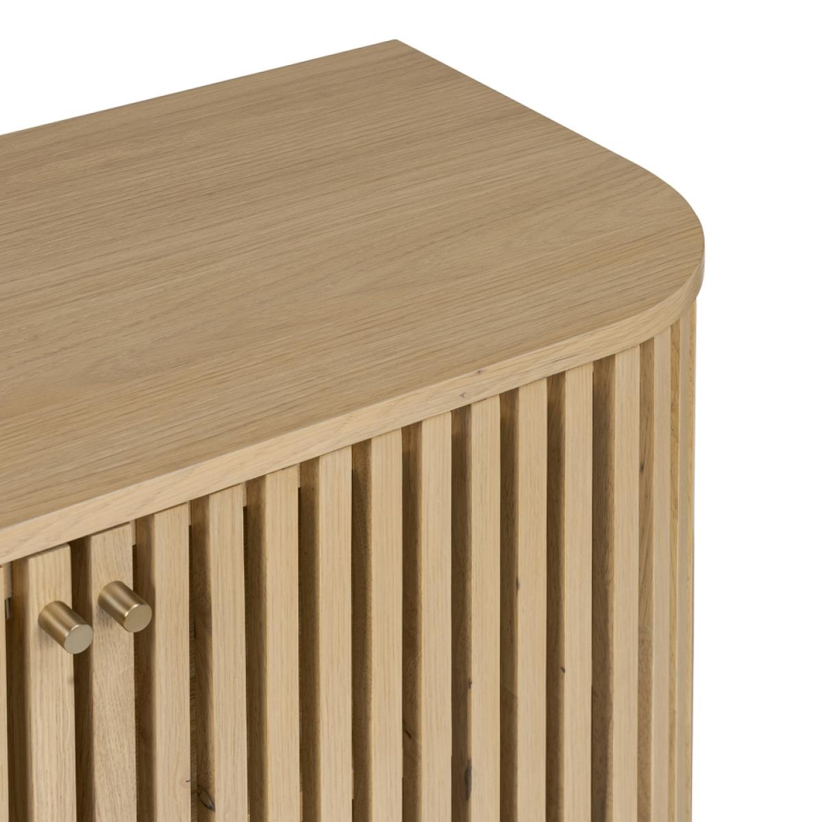 The epitome of sophistication and versatility the Finch small slatted sideboard will make a real statement in your living space. The eye-catching slatted doors give Finch its distinctive look. Soft, curved edges and simple, understated gold effect handles create a sleek profile. The capsule shape raised on straight legs gives this sideboard a mid-century feel while the natural finish highlighting the raw beauty of the solid wood construction hint at Scandi inspiration.