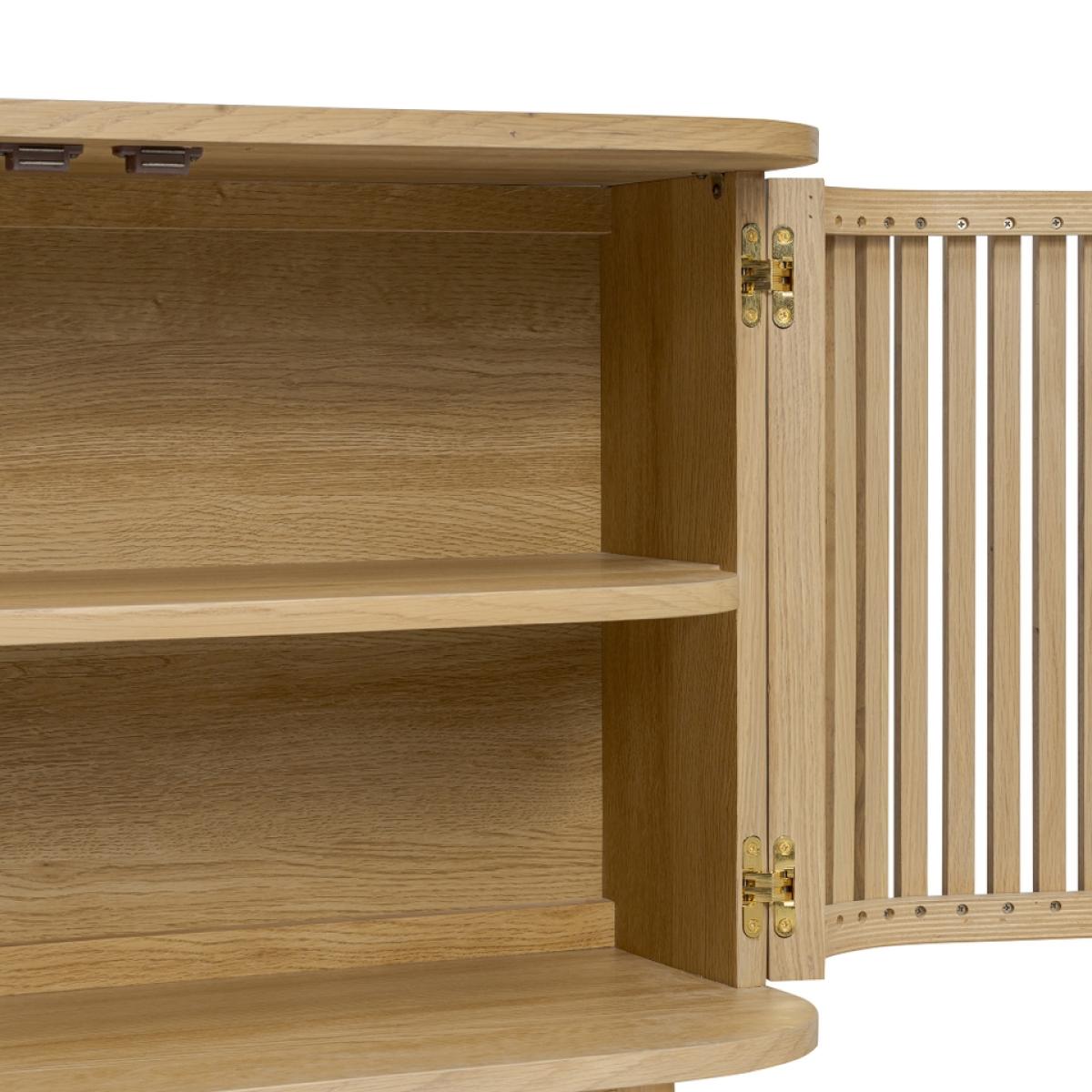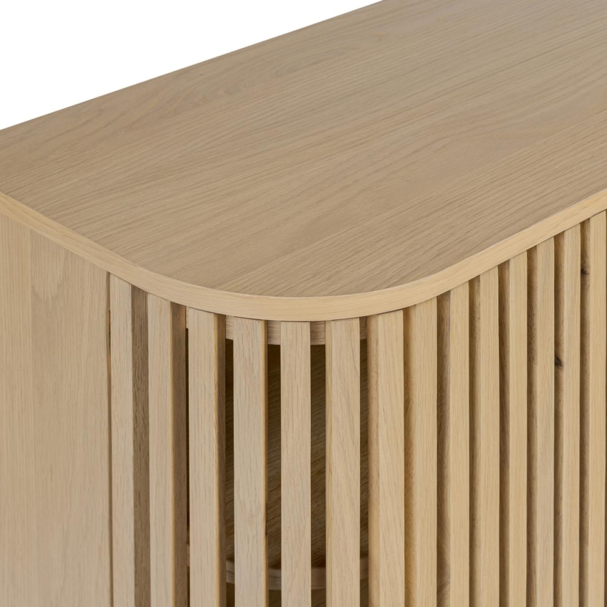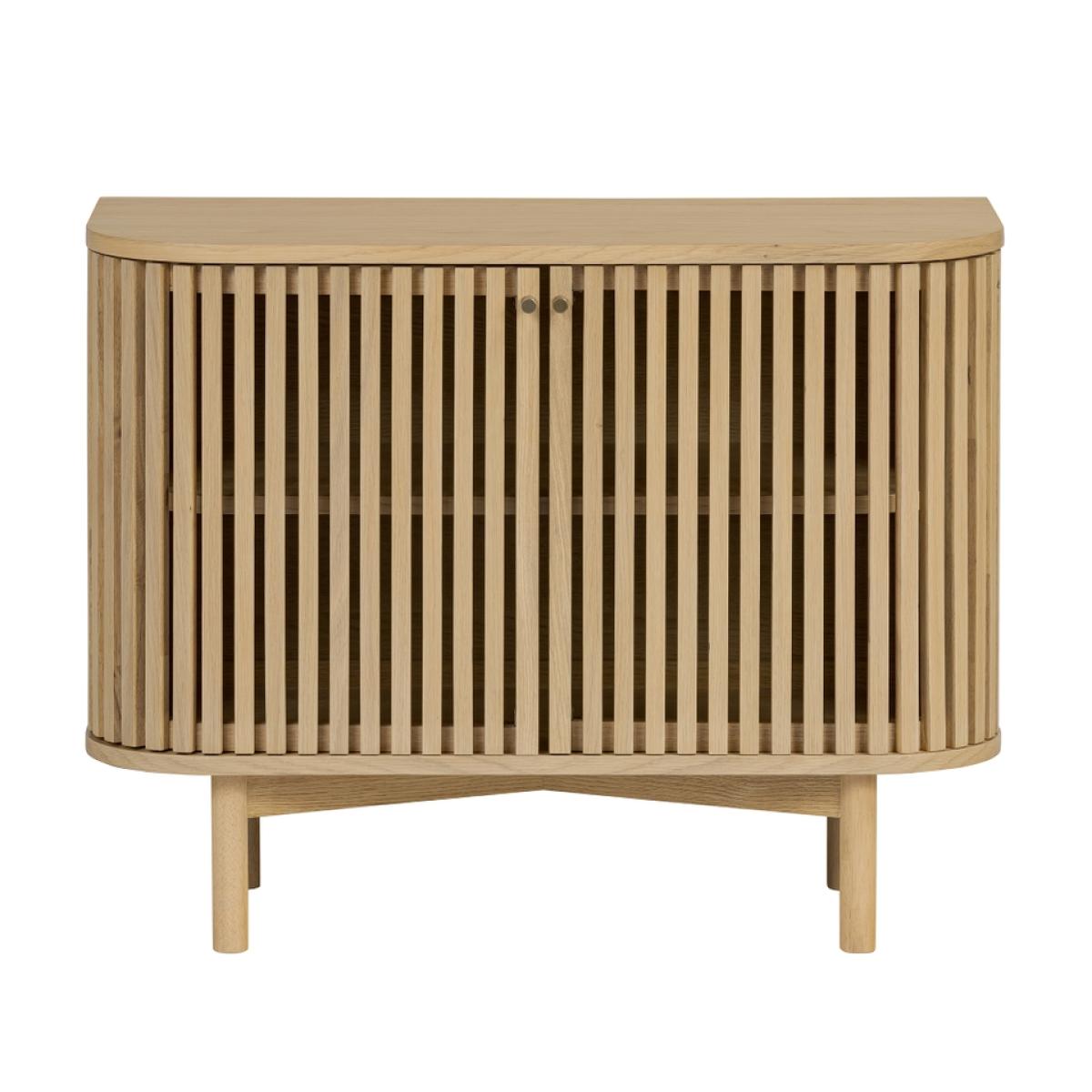 The epitome of sophistication and versatility the Finch small slatted sideboard will make a real statement in your living space. The eye-catching slatted doors give Finch its distinctive look. Soft, curved edges and simple, understated gold effect handles create a sleek profile. The capsule shape raised on straight legs gives this sideboard a mid-century feel while the natural finish highlighting the raw beauty of the solid wood construction hint at Scandi inspiration.
