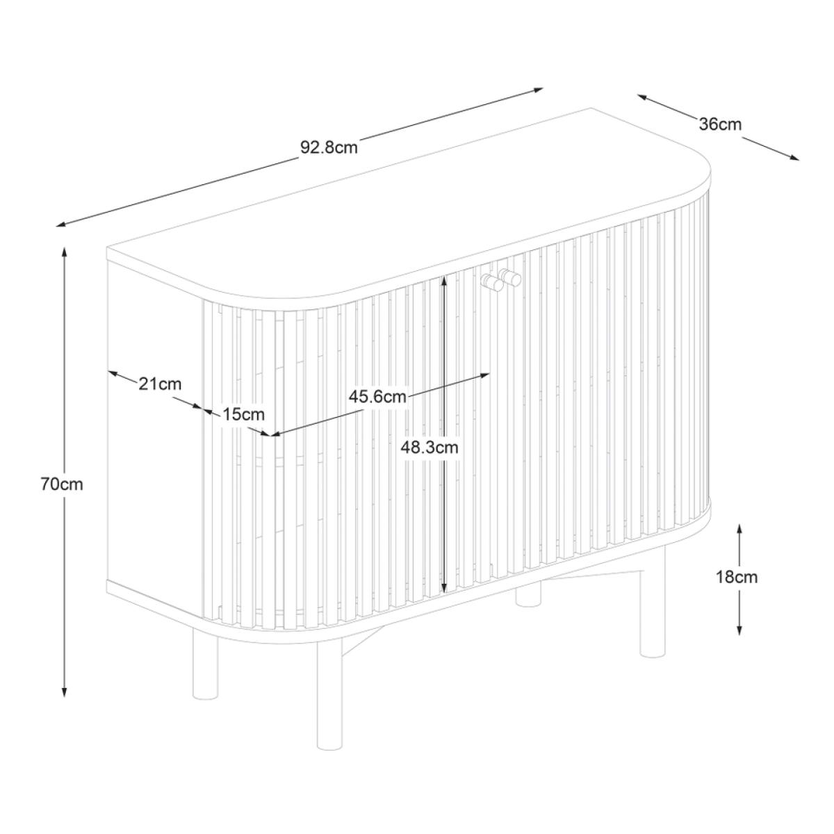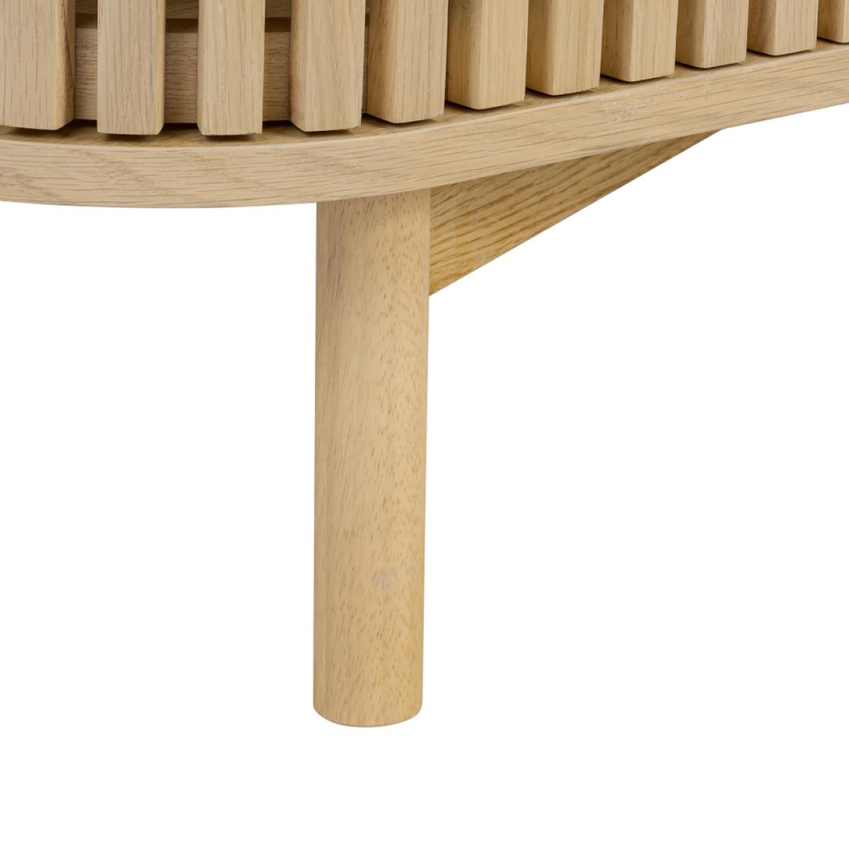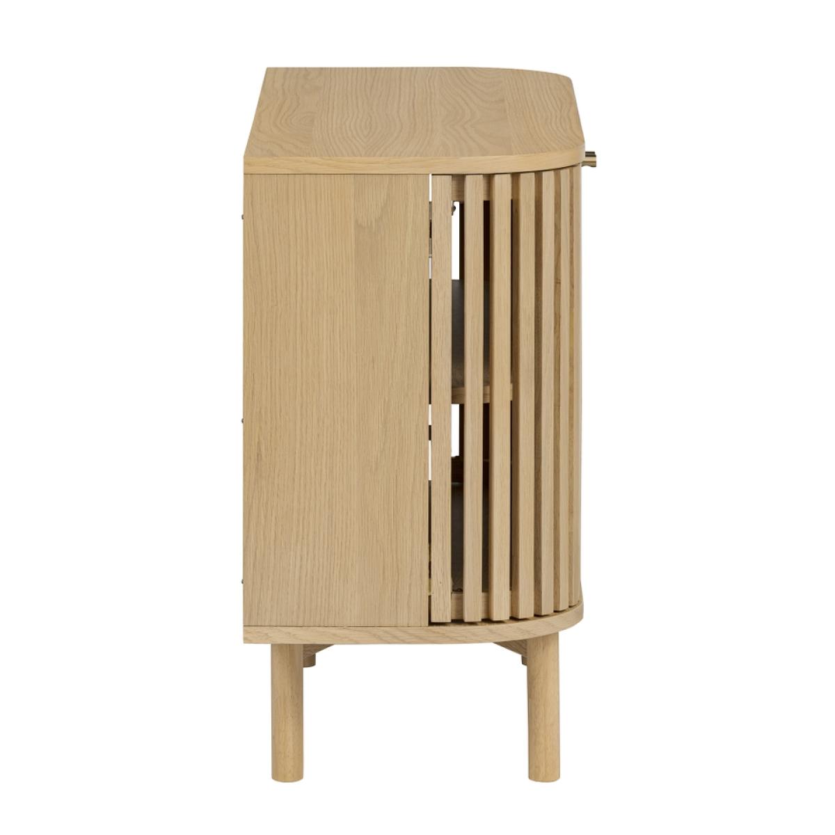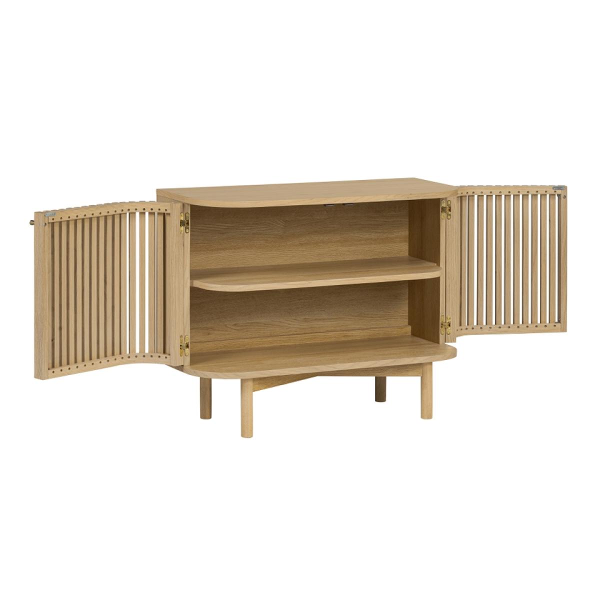 The epitome of sophistication and versatility the Finch small slatted sideboard will make a real statement in your living space. The eye-catching slatted doors give Finch its distinctive look. Soft, curved edges and simple, understated gold effect handles create a sleek profile. The capsule shape raised on straight legs gives this sideboard a mid-century feel while the natural finish highlighting the raw beauty of the solid wood construction hint at Scandi inspiration.