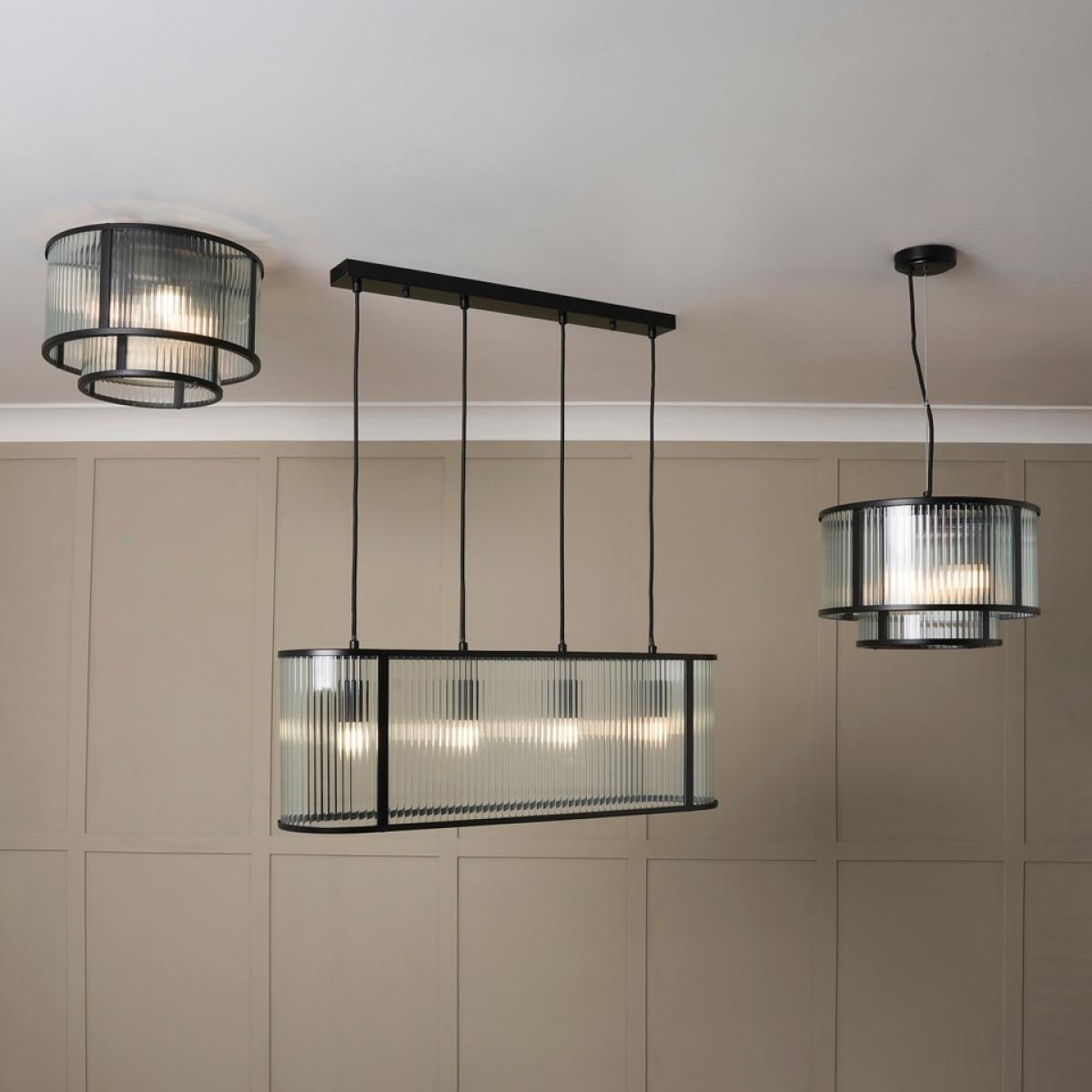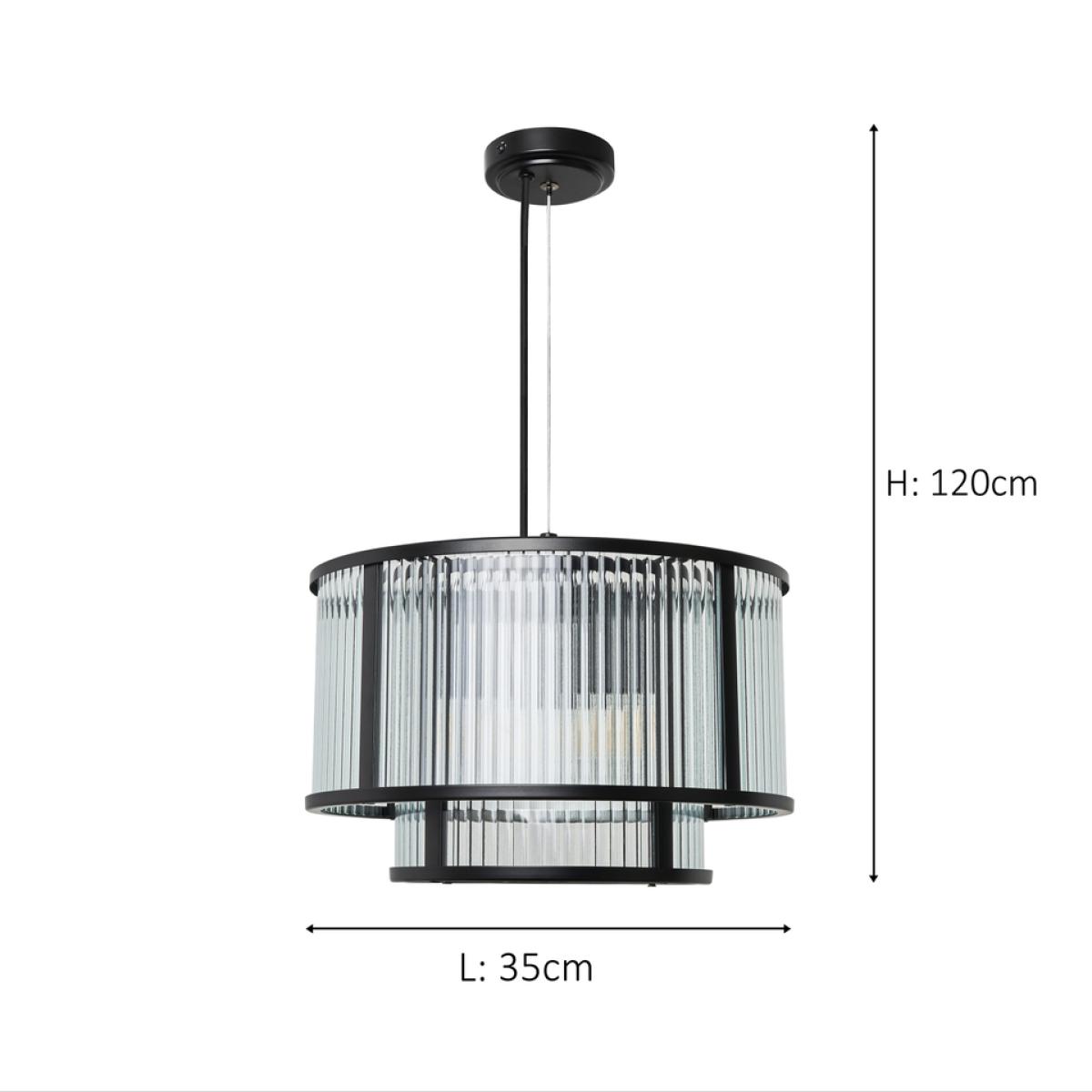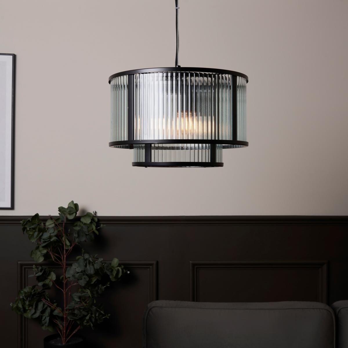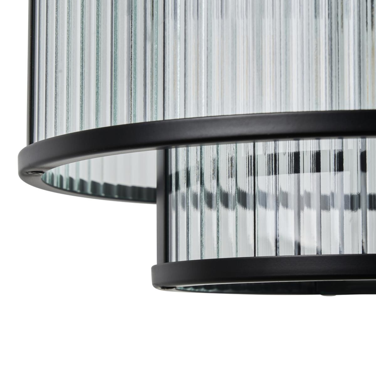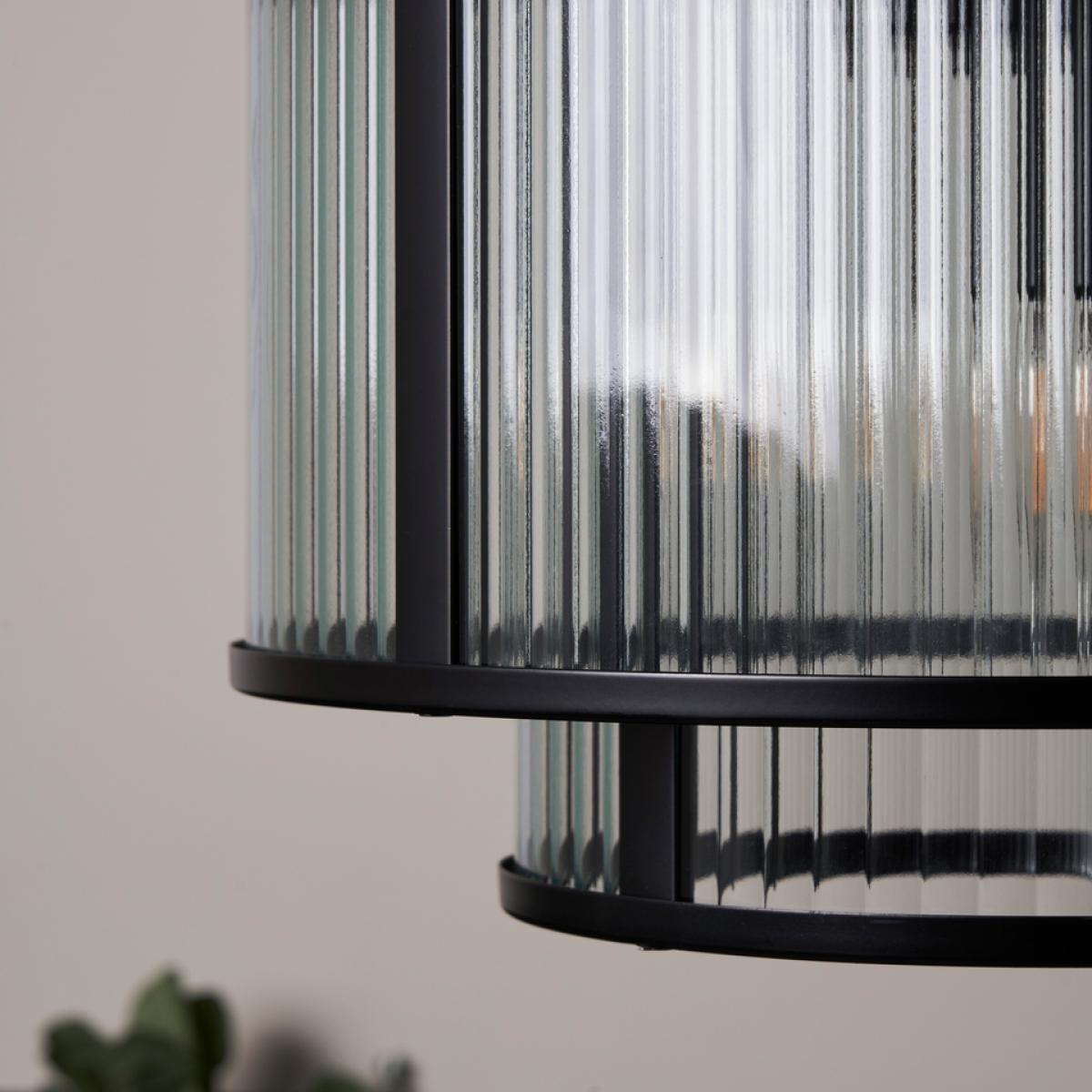 The Finchley black ribbed glass 2-tier pendant lamp shade is a stylish lighting fixture that combines art nouveau design with a touch of industrial chic. Its sophisticated design and high-quality materials ensure durability and a timeless aesthetic appeal, while the ribbed glass defuses the light and adds a softer glow to your surroundings.