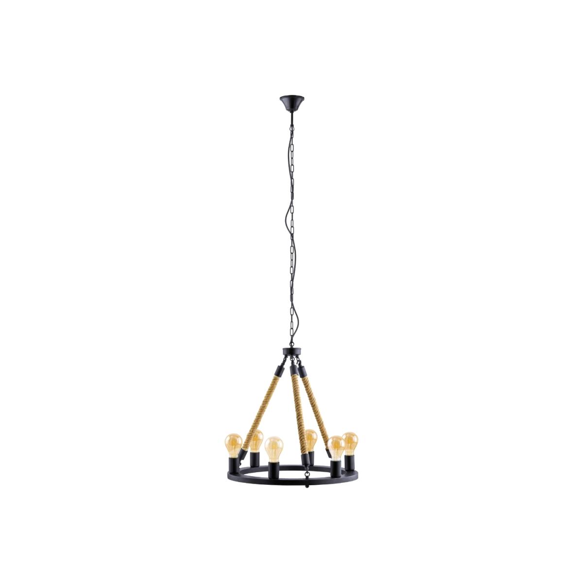 Medieval style 6 light ceiling pendant boasting rope finish. Update your space with the gorgeous vintage style circular Findlay chandelier. Complete with black steel frame, rope detailing and decorative chain. Perfect for both modern and traditional styled decors, finish the look with vintage filament bulbs.