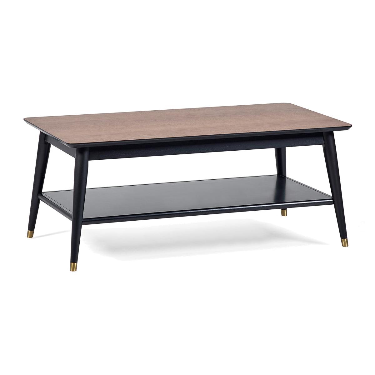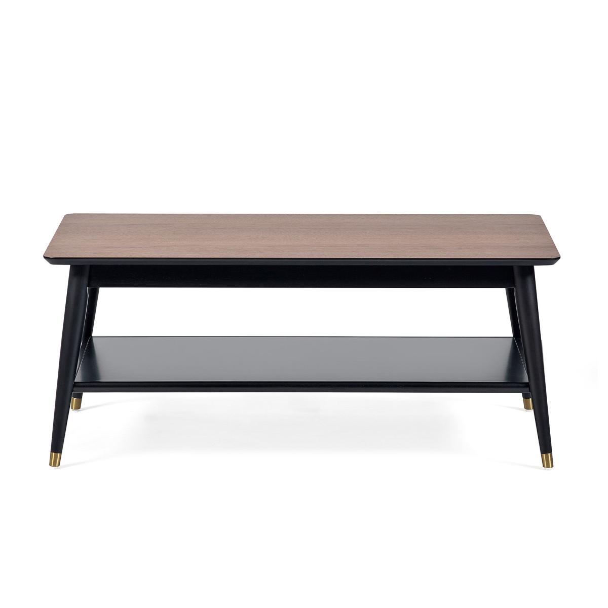 * Retro Design* Walnut Finish* Brass Legs Part of the Findlay collection, this coffee table seamlessly complements a variety of decor styles, from vintage-inspired to modern eclectic. This coffee table features a rich walnut finish and elegant brass-tipped legs, adding a touch of timeless elegance to any living space. The inclusion of a convenient shelf provides both style and functionality, offering ample storage for books, magazines, or decorative accents.