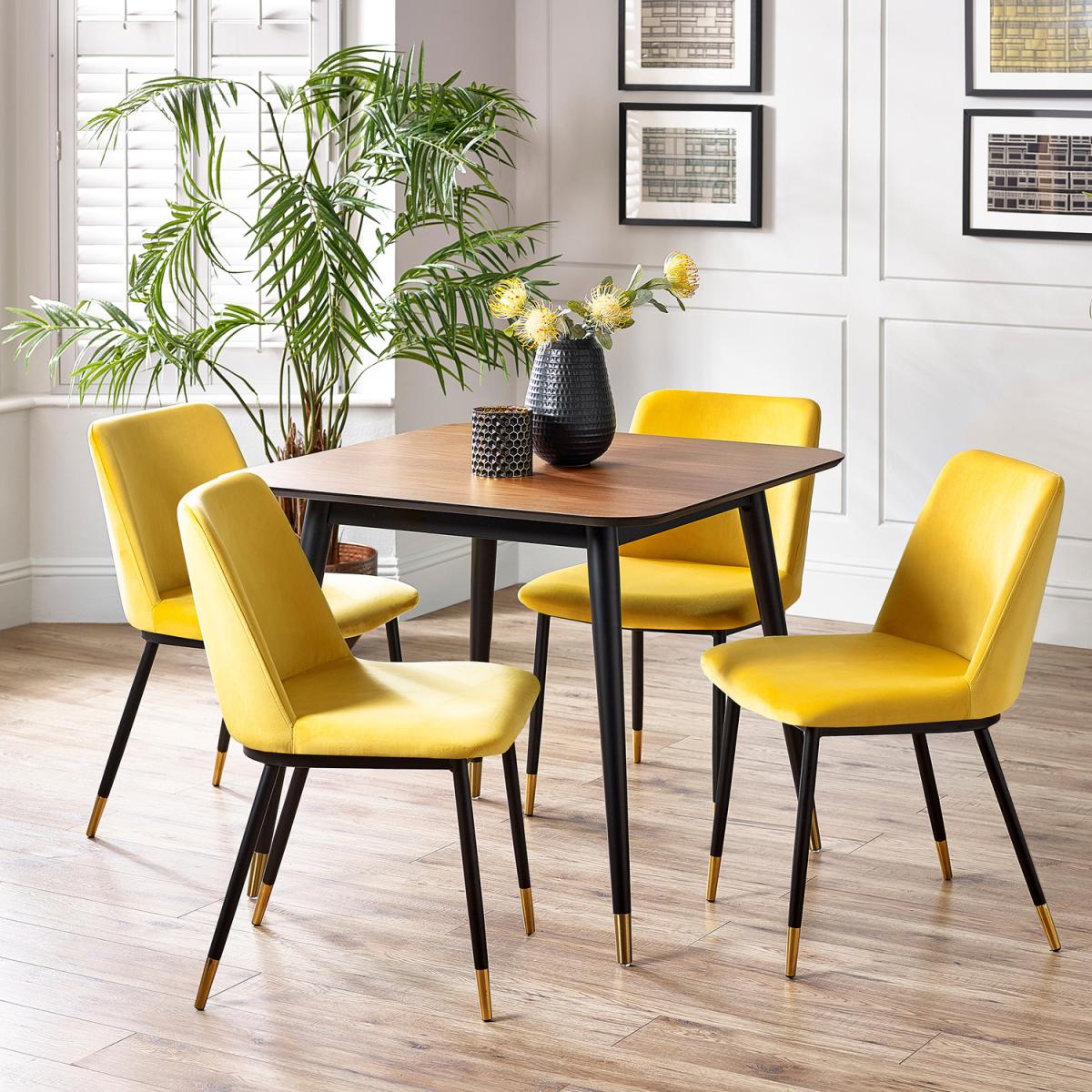I love this set for adding a modern touch with a splash of colour to both contemporary and eclectic interiors. The Findlay square table’s clean lines and warm wood top create a versatile focal point, while the Delaunay chairs in vibrant yellow inject energy into a space without overwhelming it. It works particularly well in open-plan kitchens or dining areas aiming for a lively, welcoming vibe. Practical styling tips include pairing it with neutral wall colours to let the yellow pop or contrasting it with darker tones for a sophisticated look. Elevate the overall aesthetic by adding textured or patterned cushions to the chairs, and consider a statement pendant light above to make the dining area feel inviting and thoughtfully curated.