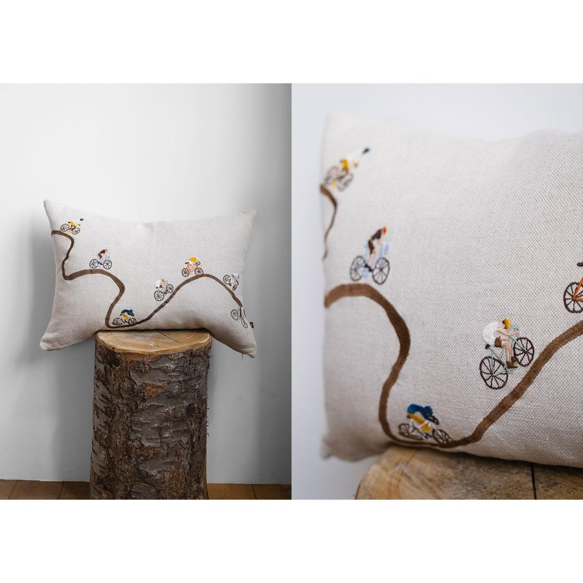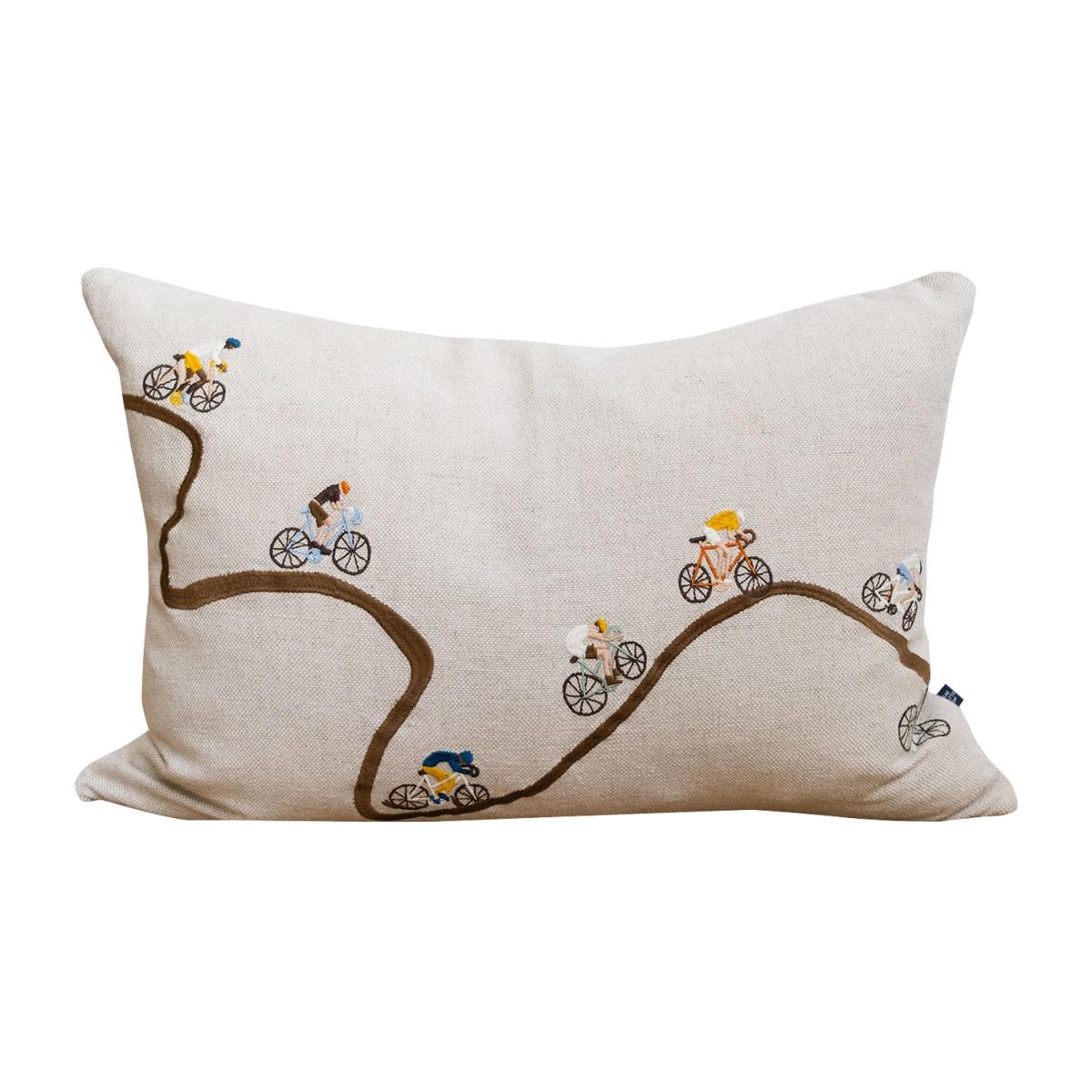 The Bikers cushion by Swedish brand Fine Little Day, which celebrates artistry and craftsmanship, features embroidered cyclists by Elisabeth Dunker on a heavy-weight linen fabric.