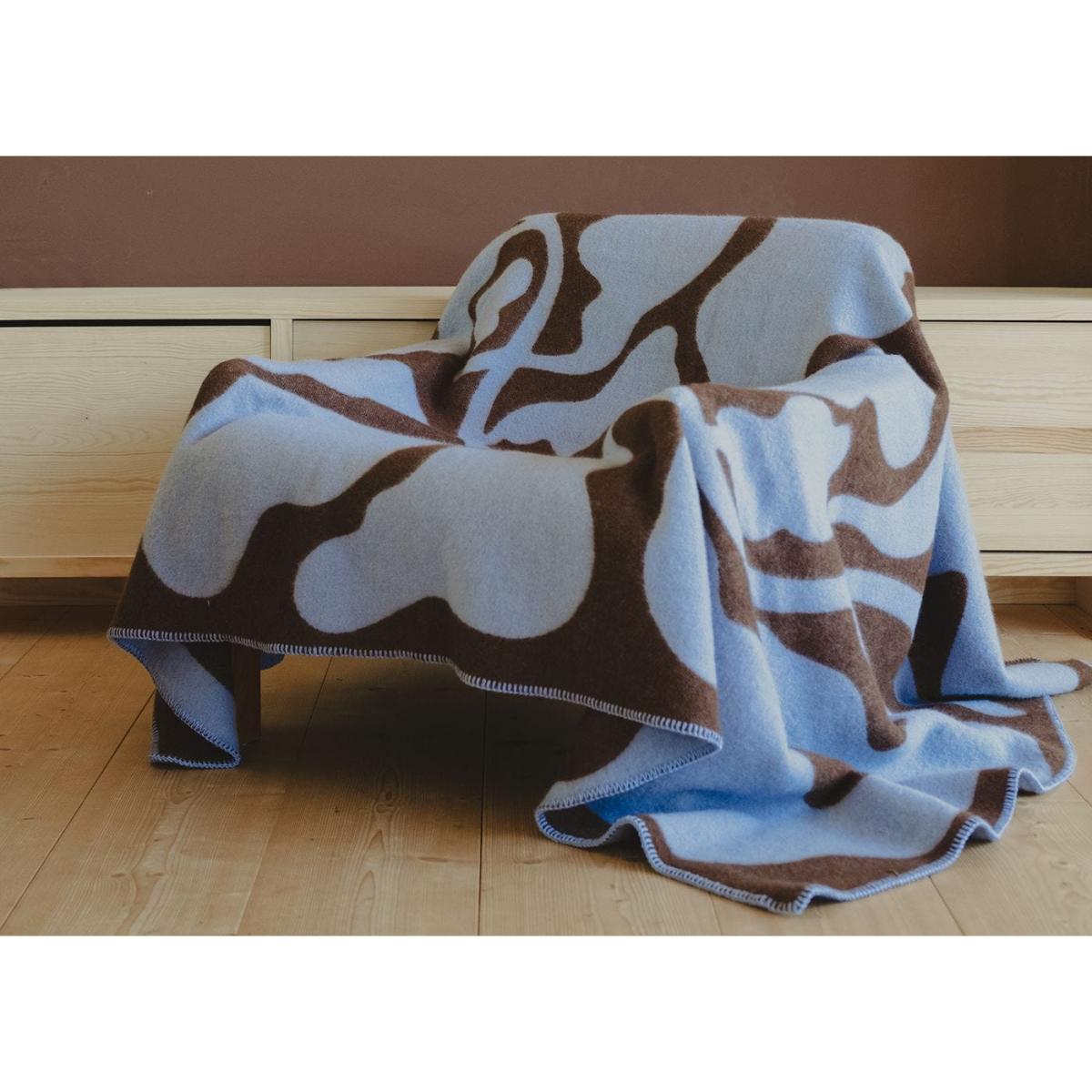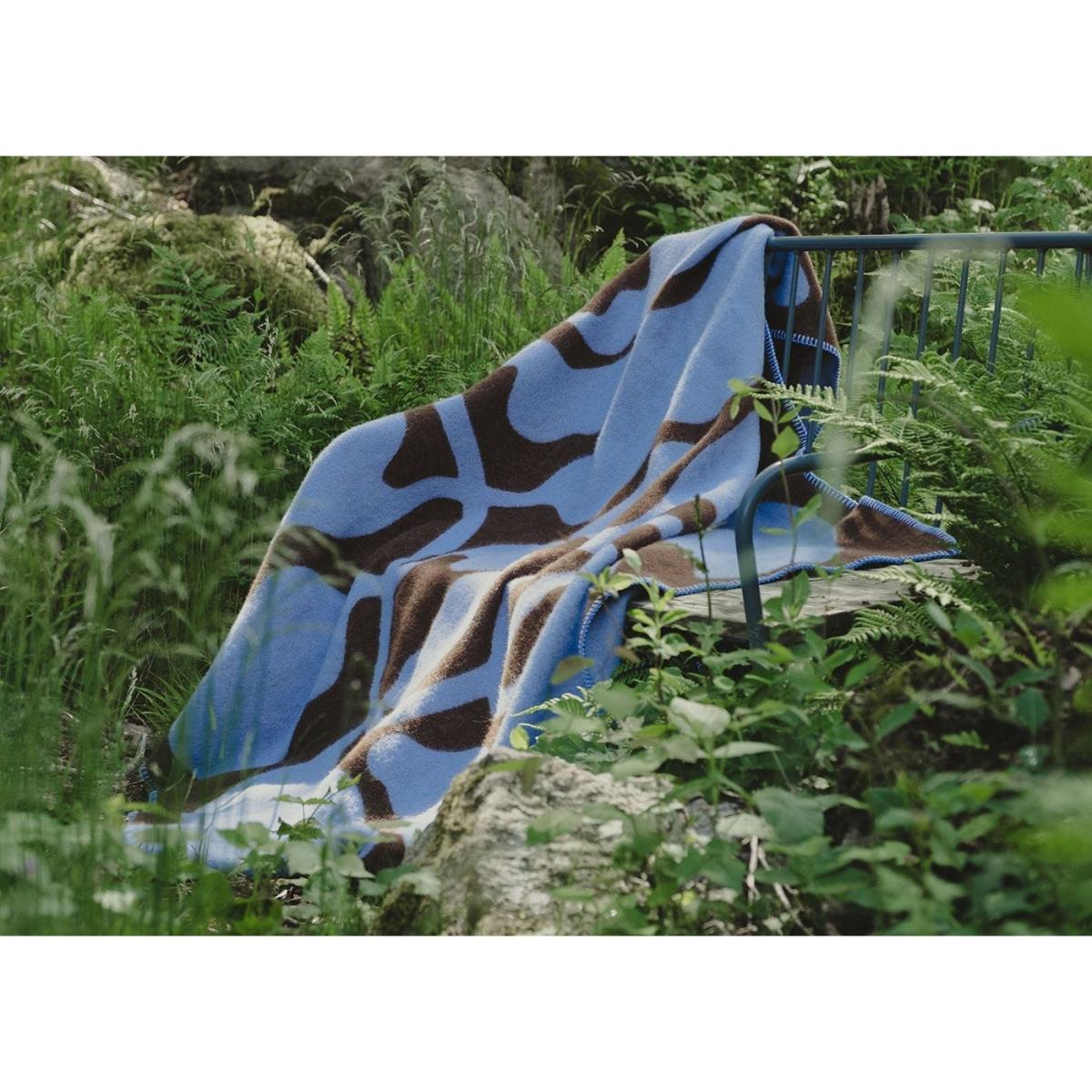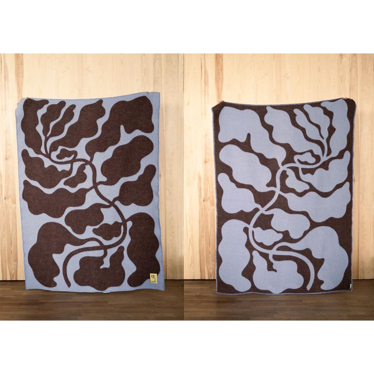 The Leaves Wool Blanket in Pale Blue by Linnéa Andersson for Fine Little Day is a striking blend of art and function. Featuring Andersson’s signature botanical motifs, this jacquard-woven design inverts colours on each side, offering a versatile, reversible look.