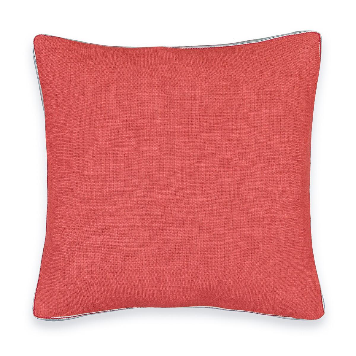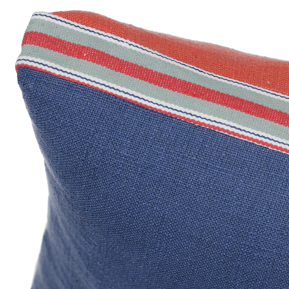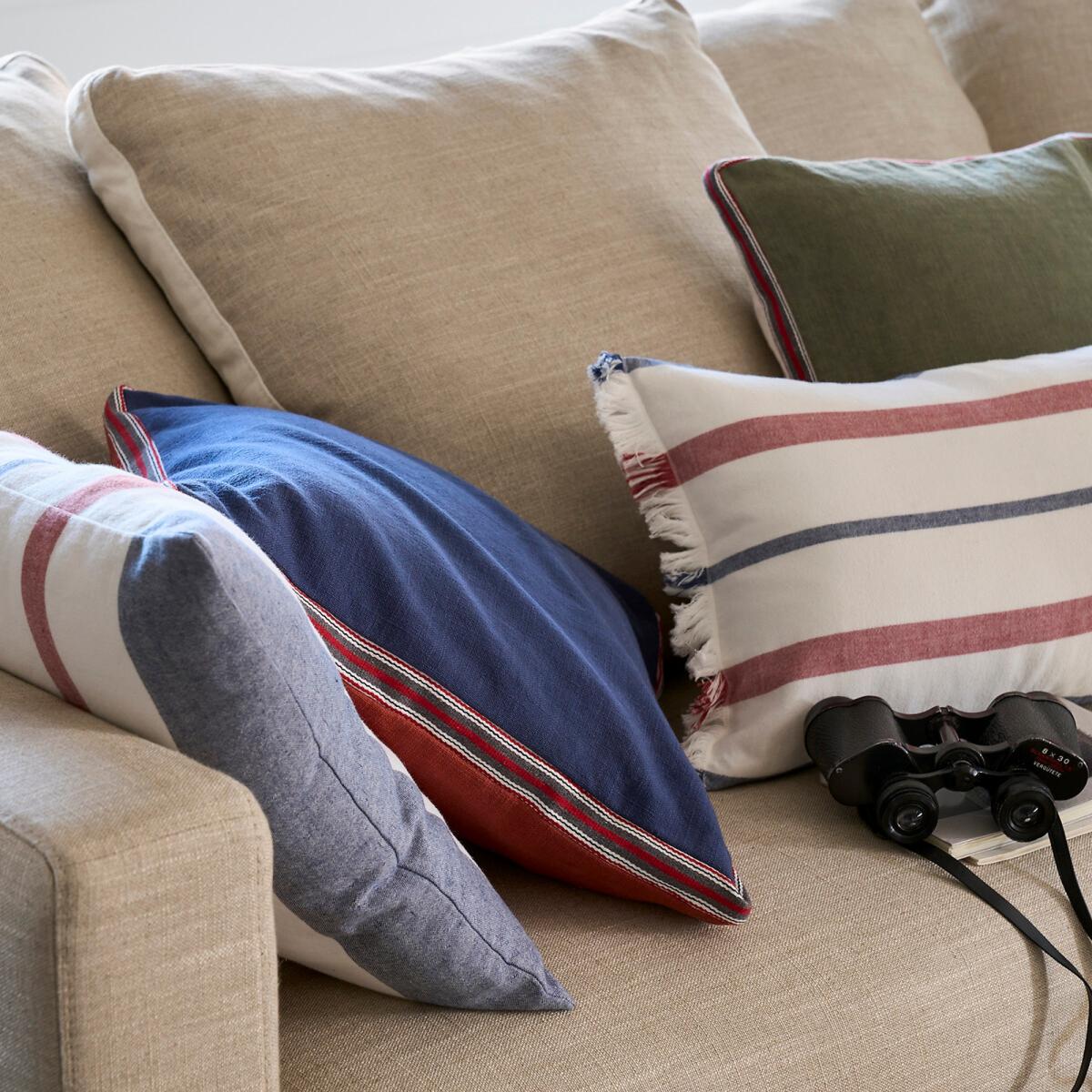 The two-tone Finistère cushion cover has a pretty finish, front and back in different colors underlined with a striped edge. Designed by La Redoute Interiors.