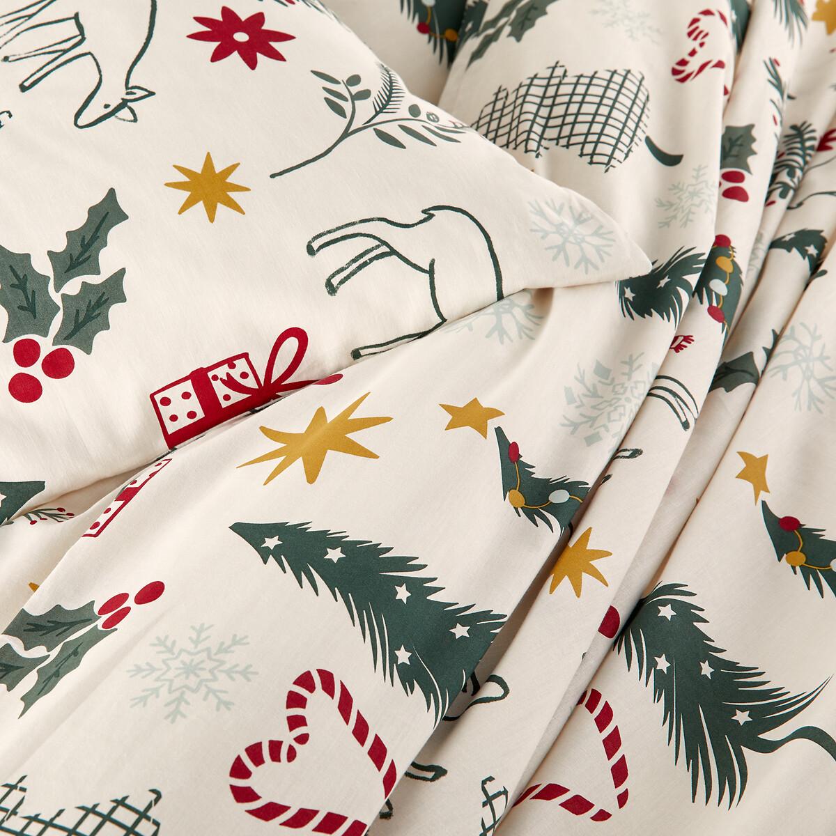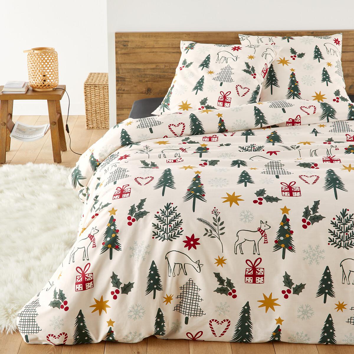 Cotton duvet cover set. Fir trees, reindeer and other Christmas motifs on a plain background. Ultra soft and comfortable pure cotton. The set includes a duvet cover and its matching pillowcase. Cotton is part of our daily lives. We love it for its suppleness and softness. Easy Care, it is ideal for the beds of young and old alike!Product Details • 100% cotton • 144 thread count • Festive print on both sides • Straight buttoned base for the duvet cover. Care Advice • Machine washable at 60°C • By washing your laundry at 40°C instead of 60°C, you limit energy consumption. Dimensions • Duvet cover 140 x 200cm + 1 pillowcase 63 x 63cm : Single • Duvet cover 200 x 200cm + 2 pillowcases 63 x 63cm : Double • Duvet cover 240 x 220cm + 2 pillowcases 63 x 63cm : Super King • Duvet cover 260 x 240cm + 2 pillowcases 63 x 63cm : Super King • OEKO-TEX® Standard 100. Standard 100 certification by OEKO-TEX® tests textile products for harmful substances via an independent, international label.