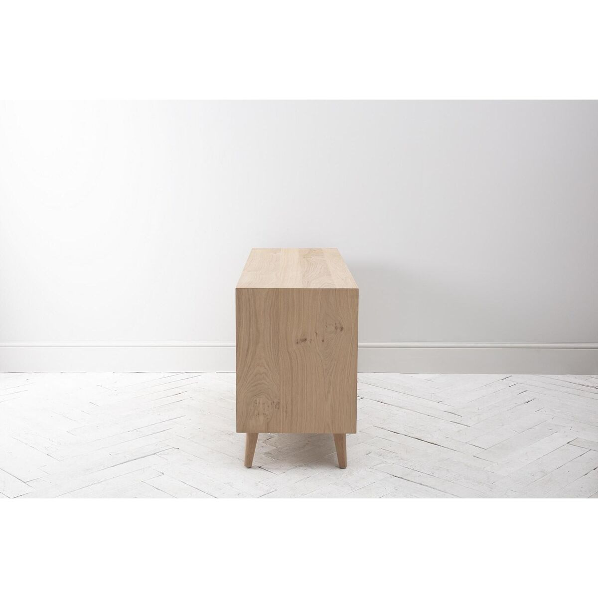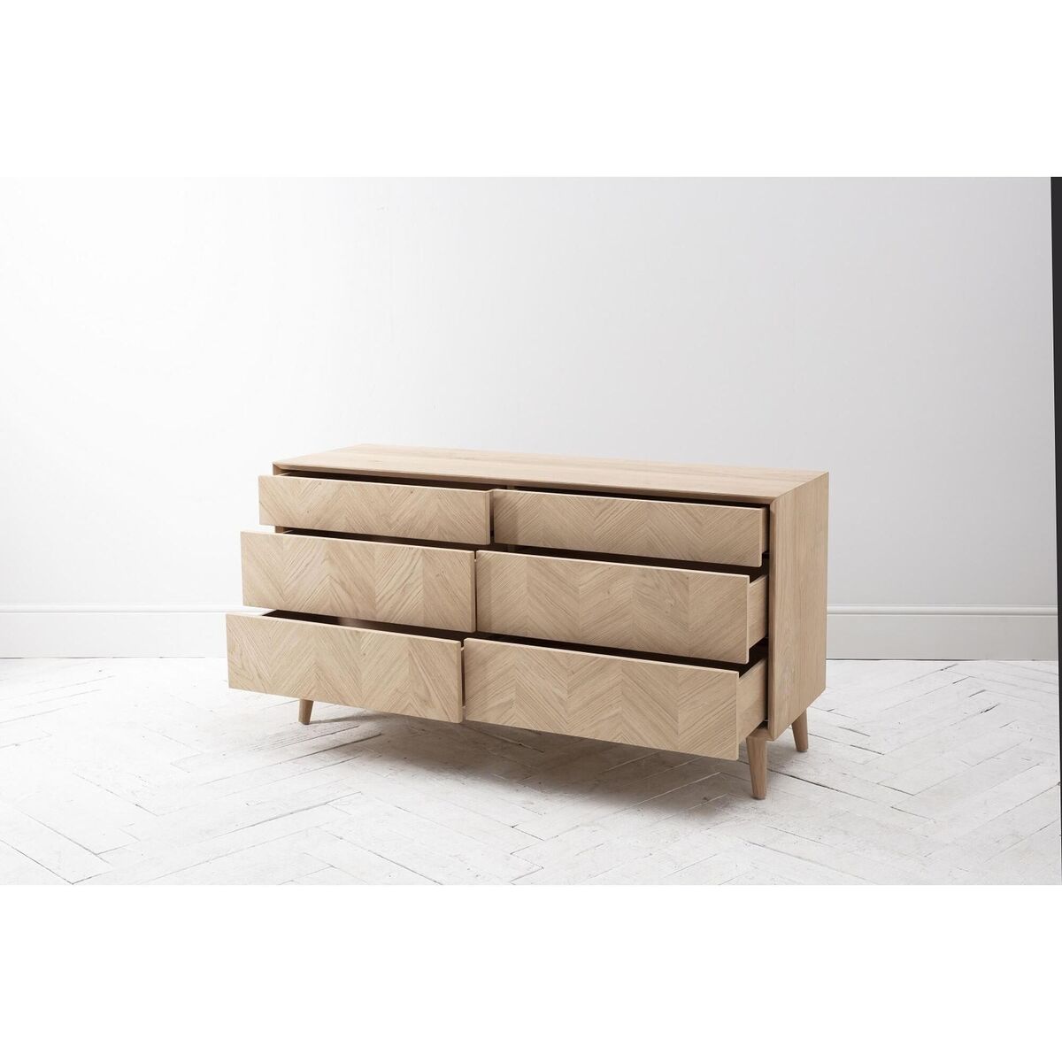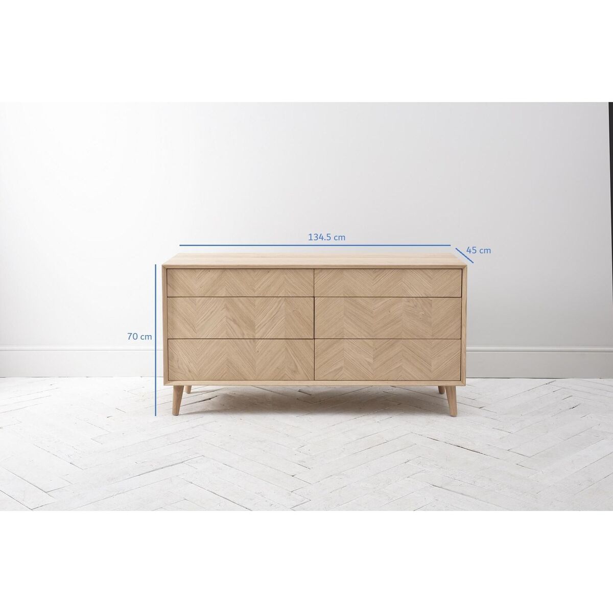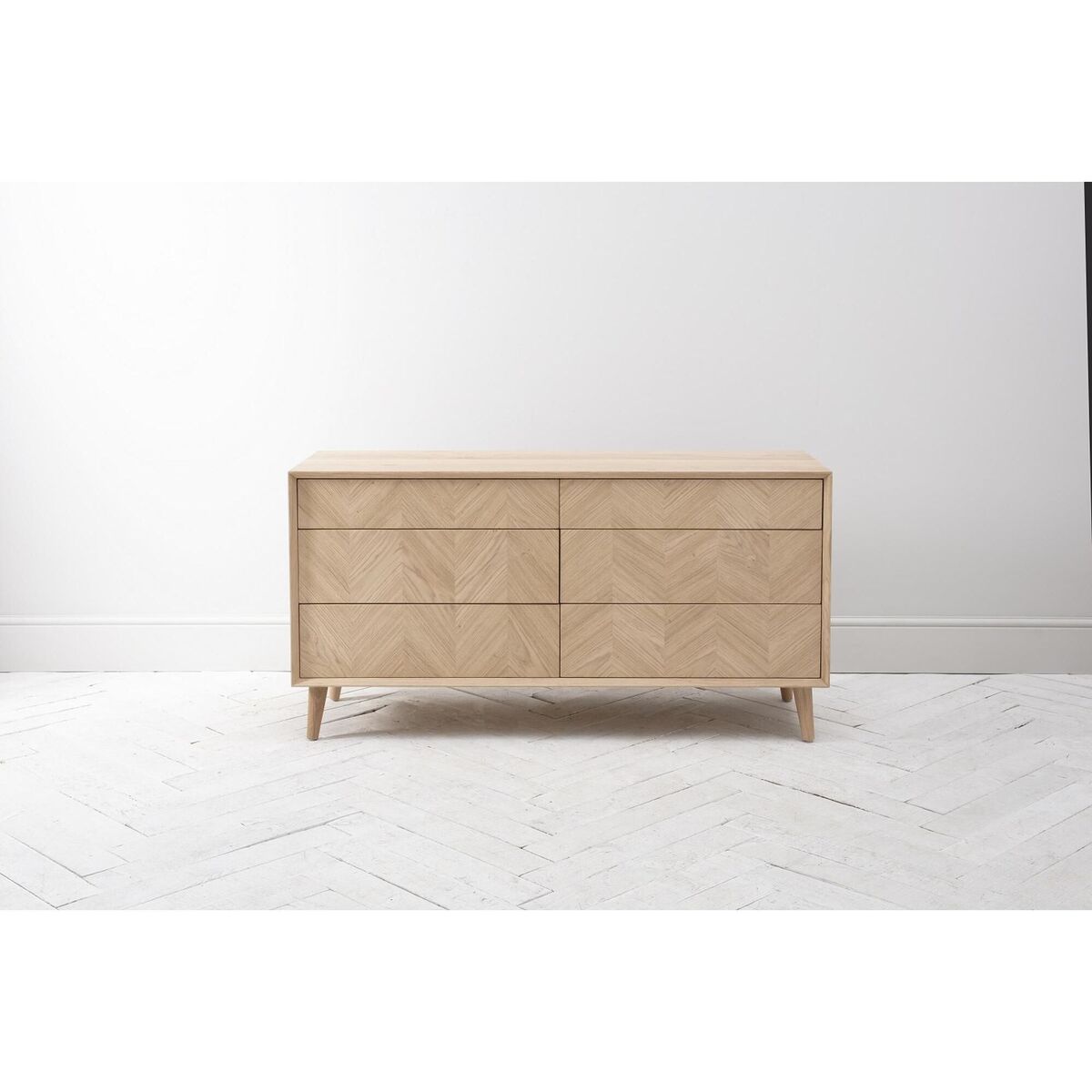 I’m a fan of the Finn dresser for its clean lines and subtle chevron veneer - it brings just enough texture without dominating a space. Its light oak finish sits beautifully in Scandi, coastal or contemporary schemes, and the raised legs help the room feel more open. For styling, keep the top surface uncluttered: pair a slim table lamp with a small stack of books and a ceramic pot for greenery. Above, a round mirror or simple artwork will balance the width, while tactile elements such as a woven rug or velvet armchair nearby will enrich the look without competing.