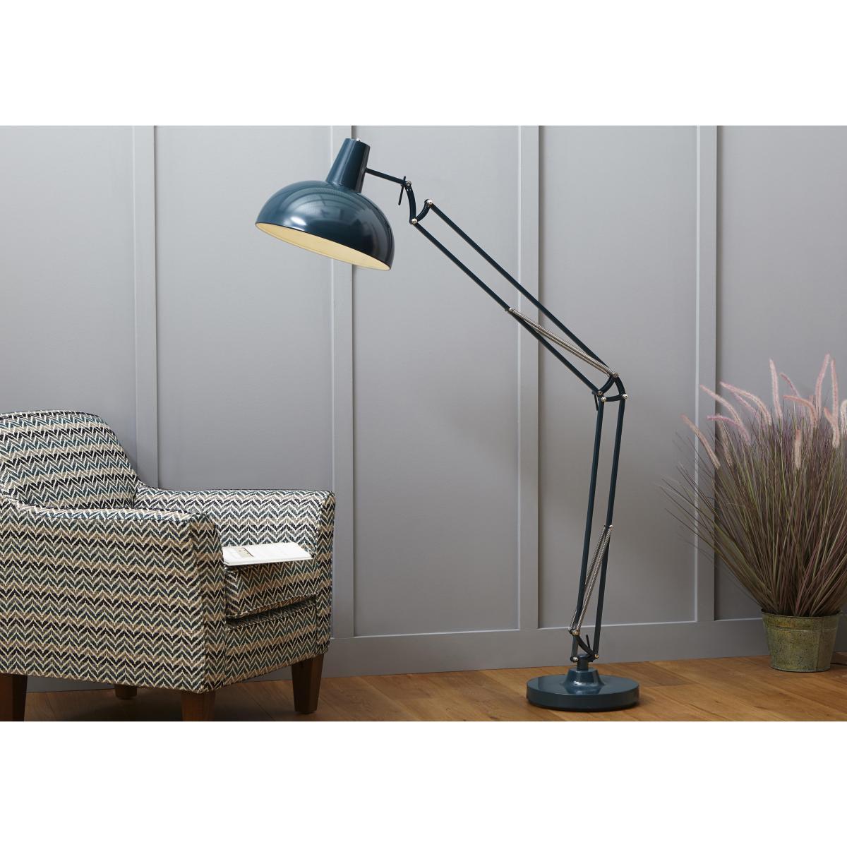 Choose iconic style on a grand scale with the stylish Finn floor lamp. With plenty of industrial chic, this large balanced arm floor lamp can be adjusted to cast light from its shaped metal shade wherever you want it. Perfect for creating mood or task lighting in the corner of your living room. Choose between a brushed nickel and glossy white finish, a bronze and glossy black finish or an all over teal finish. Fun, funky and impressively tall, this cool and classy floor lamp is the perfect addition to the modern home. Dimensions. Width: 32cm (13in). Depth: 82cm (32in). Height: 170cm (67in).