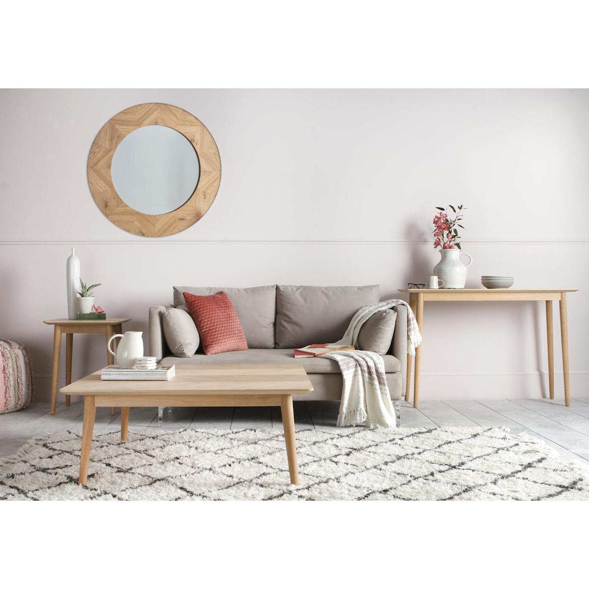 There's just something about warm oak that makes designs utterly special and certainly, that is the case of the Finn mirror. A fabulous example of the natural beauty of solid oak, the Finn spreads all its charm in its round frame, a gorgeous display of the natural streaks, knots and grain of the wood, with an eye-catching oak veneer used to achieve a chevron-inspired pattern. Its contrast of textures and that sun-shaped visual effect makes the Finn simply delightful. The Finn is all you need to dress up the walls of your bedroom or hallway, but you could also create a showstopper of a duo by pairing it with the matching Finn range. Discover: The Finn Range