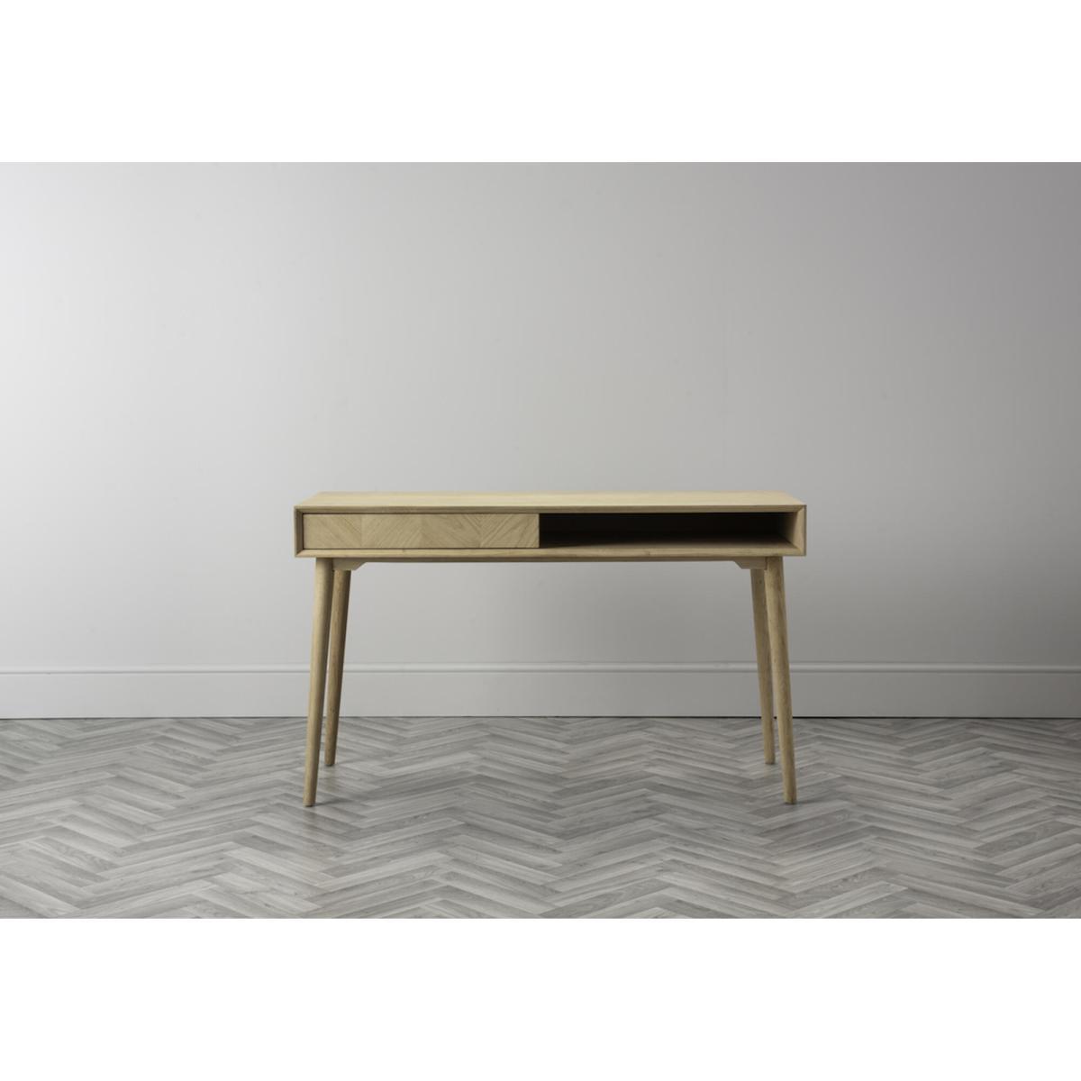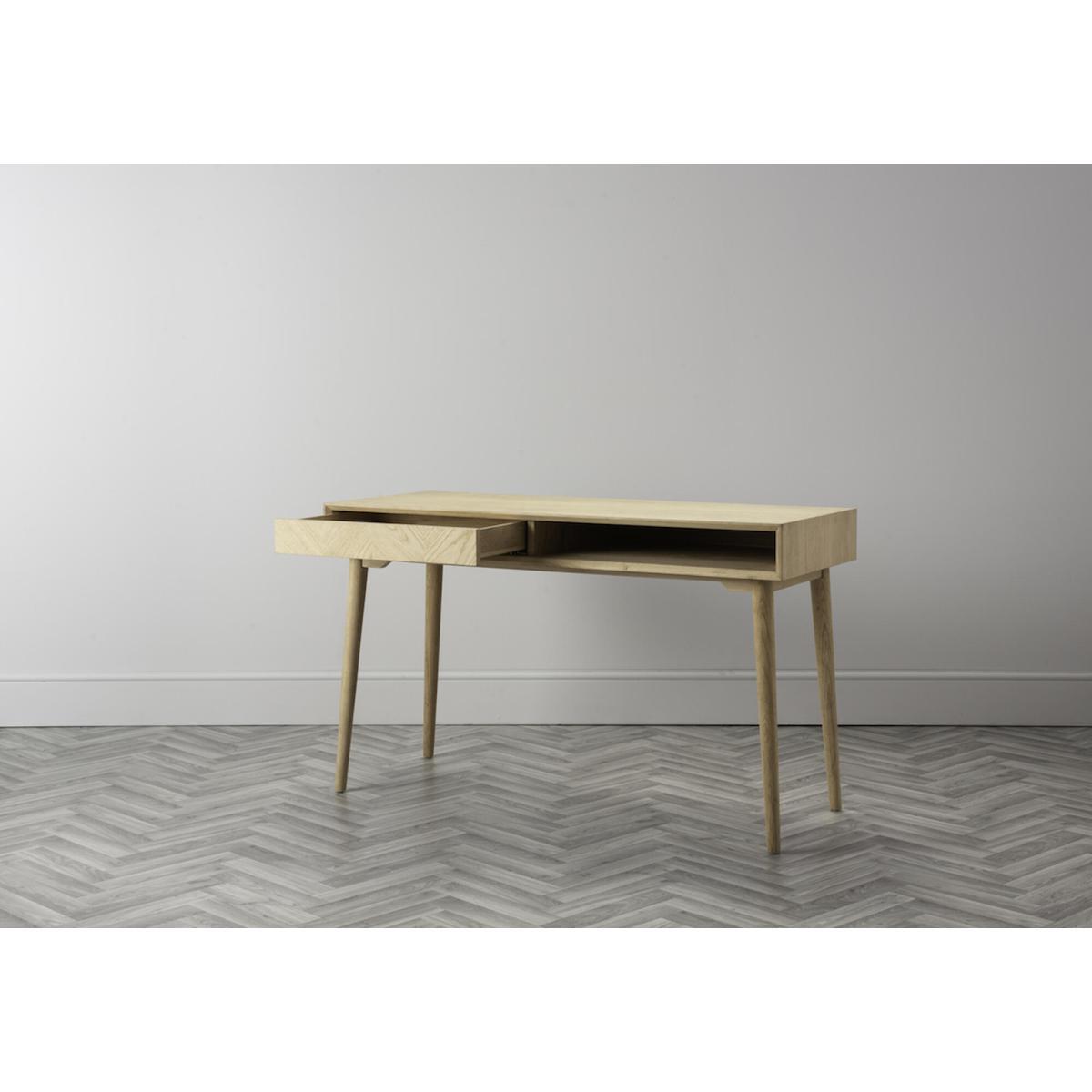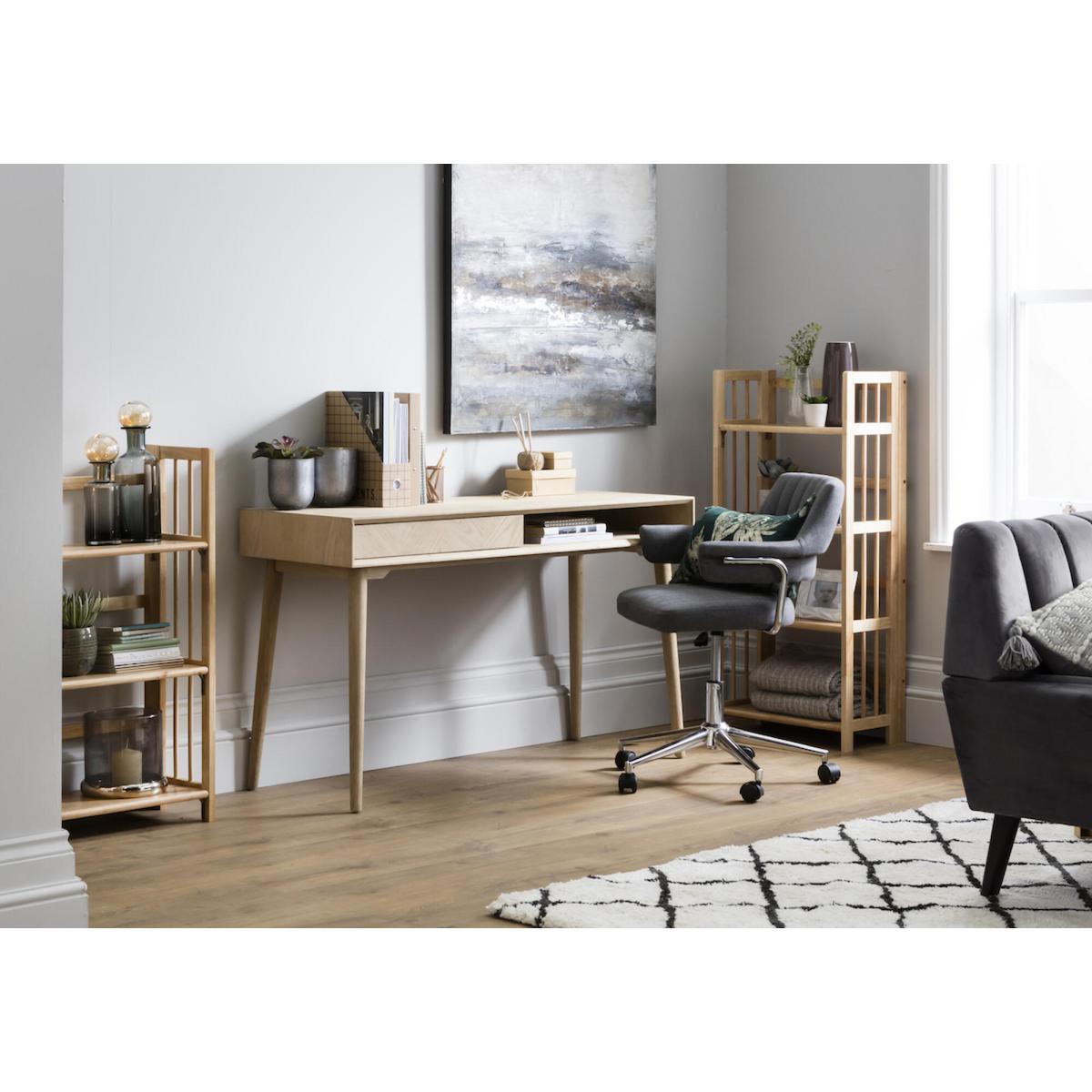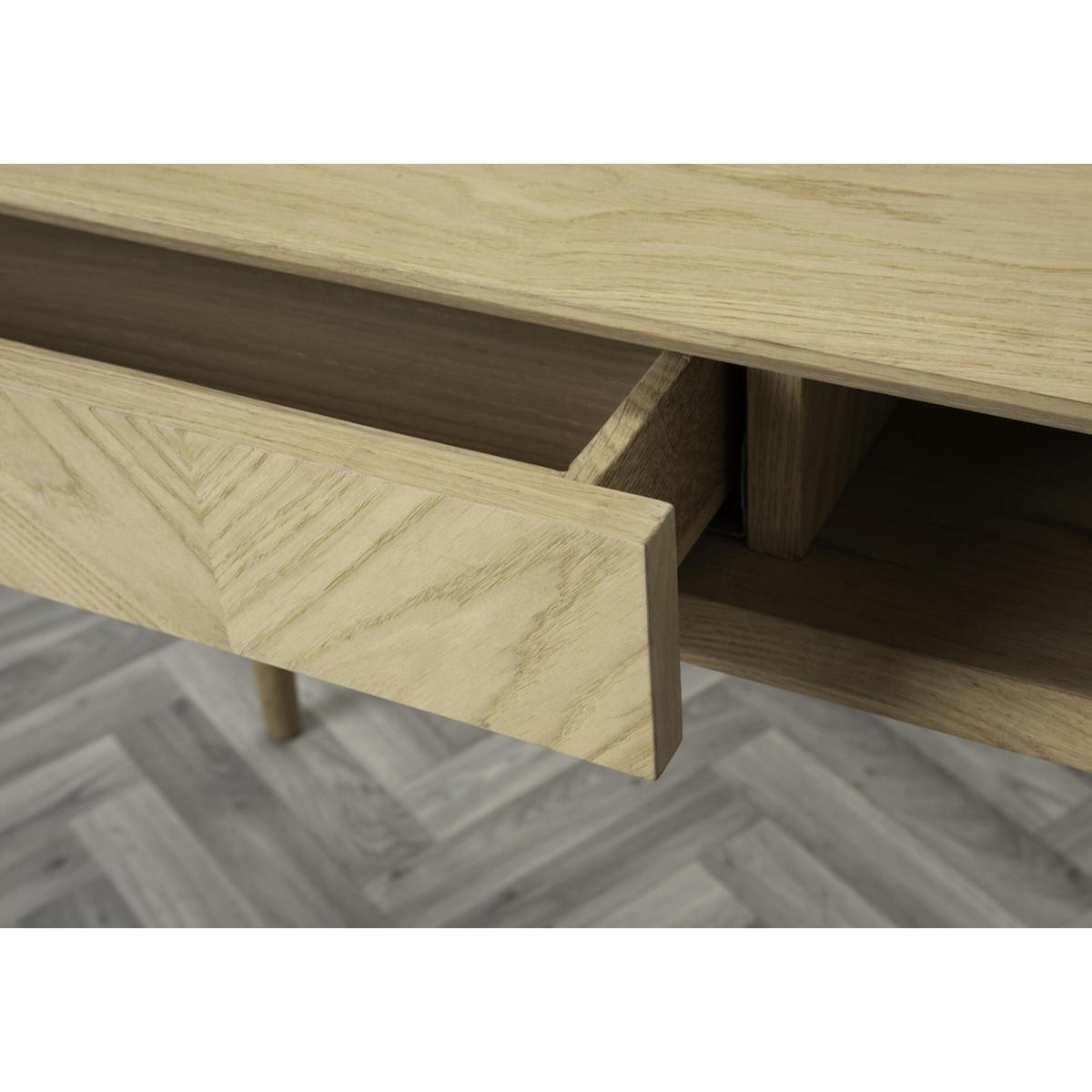 There's just something about natural oak that makes designs utterly special and certainly, that is the case of the Finn One Drawer Desk. This sleek design gives a nod to mid-century design while celebrating modernity. Crafted from natural oak, the Finn Range is a great display of natural beauty, showcasing the streaks, knots and grain of the wood which add texture to its spacious tabletop and slim, tapered legs. This has been taken to the next level with oak veneer to achieve the inlay chevron design across the top and facade for added visual appeal. Add one of our fabulous swivel chairs, and your home office is ready for the work day ahead.