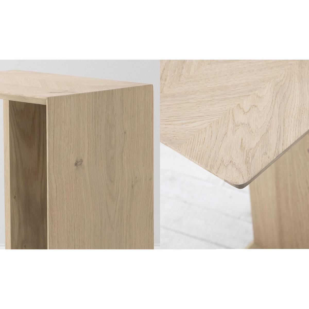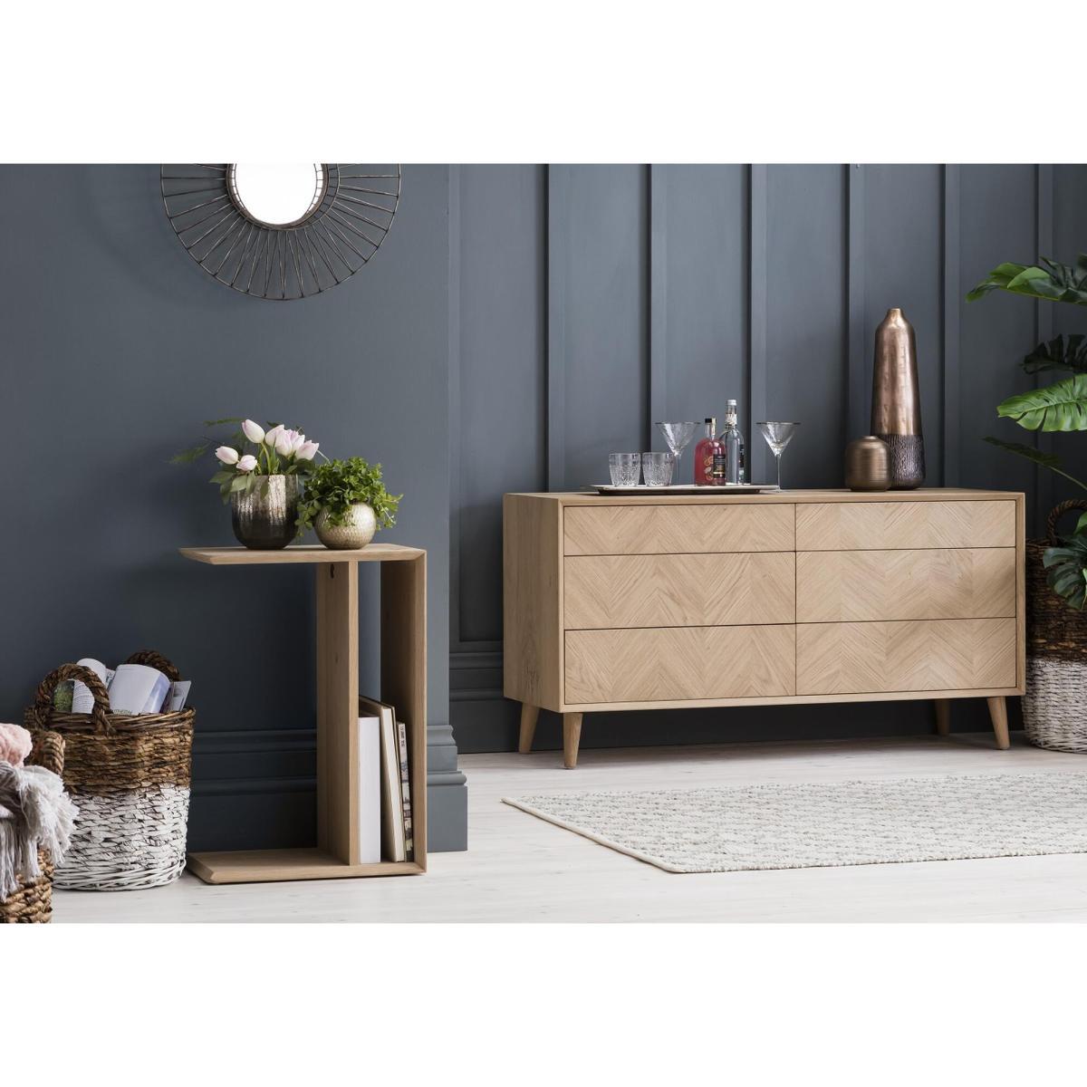 Get ready for cosy movie nights with our Finn supper table, a masterclass in visual appeal and stylish practicality. Made from natural oak, this side table provides an ample surface for your drinks and nibbles while packing a style punch - thanks to its crisp, clean-lined design. This has been taken to the next level with oak veneer to achieve the inlay chevron design across the tabletop and facade for added textural appeal. Team the Finn with the matching designs from the range for a Scandi-inspired suite that will make your living room flourish. Discover: The Finn Range