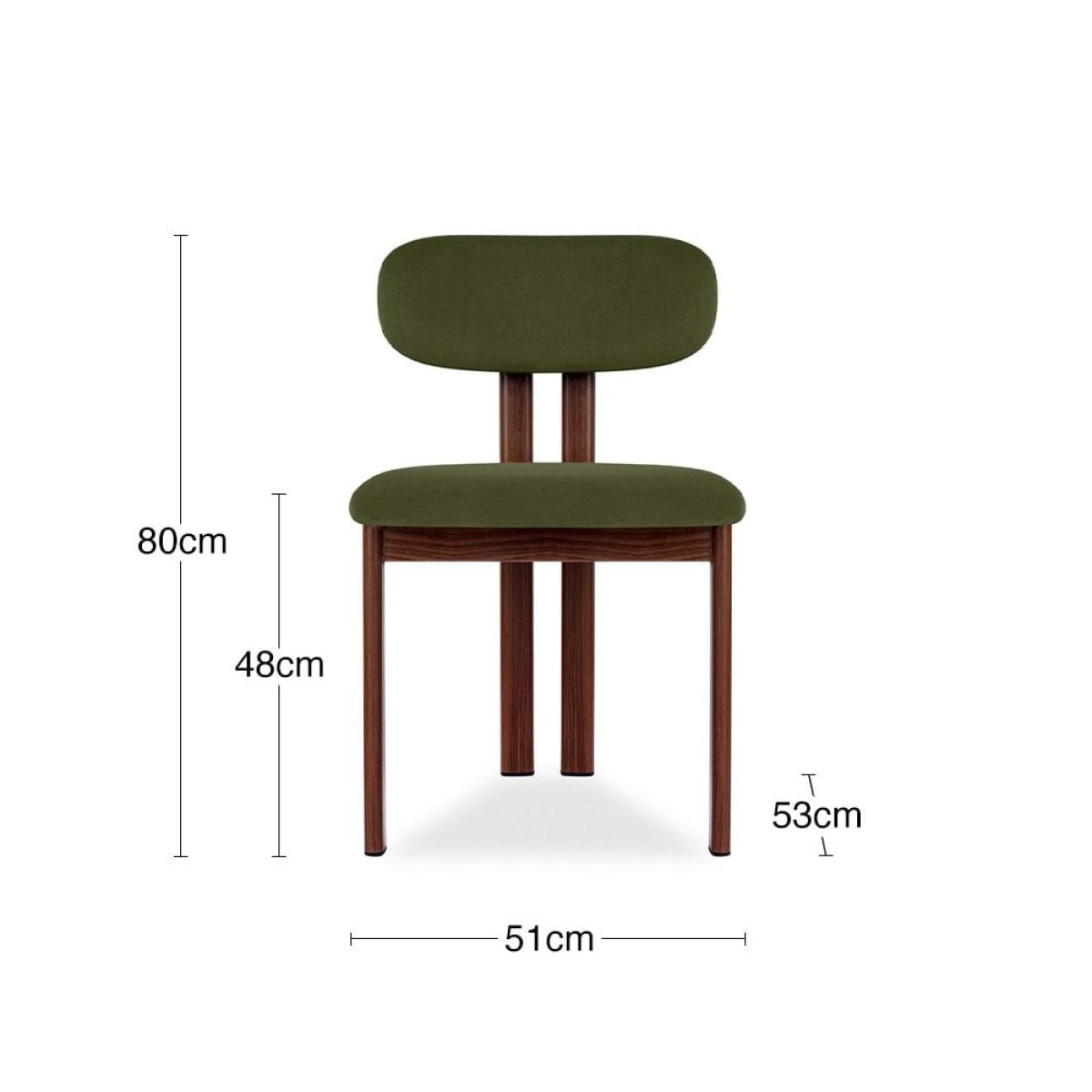 This dining set strikes a lovely balance between modern elegance and practicality, making it a versatile choice for various interiors. I love the combination of walnut with olive green velvet-it's both warm and sophisticated, perfect for contemporary, mid-century, or even eclectic settings. The walnut finish provides a rich, natural texture that pairs well with neutral tones or bold accent colours. For styling, consider soft textiles like linen or cashmere for table runners, and add contrast with metallic or ceramic tableware to highlight the natural beauty of the wood. To keep the look fresh, incorporate some greenery or statement lighting. It’s an inviting set that works equally well in both open-plan kitchens and more intimate dining rooms.