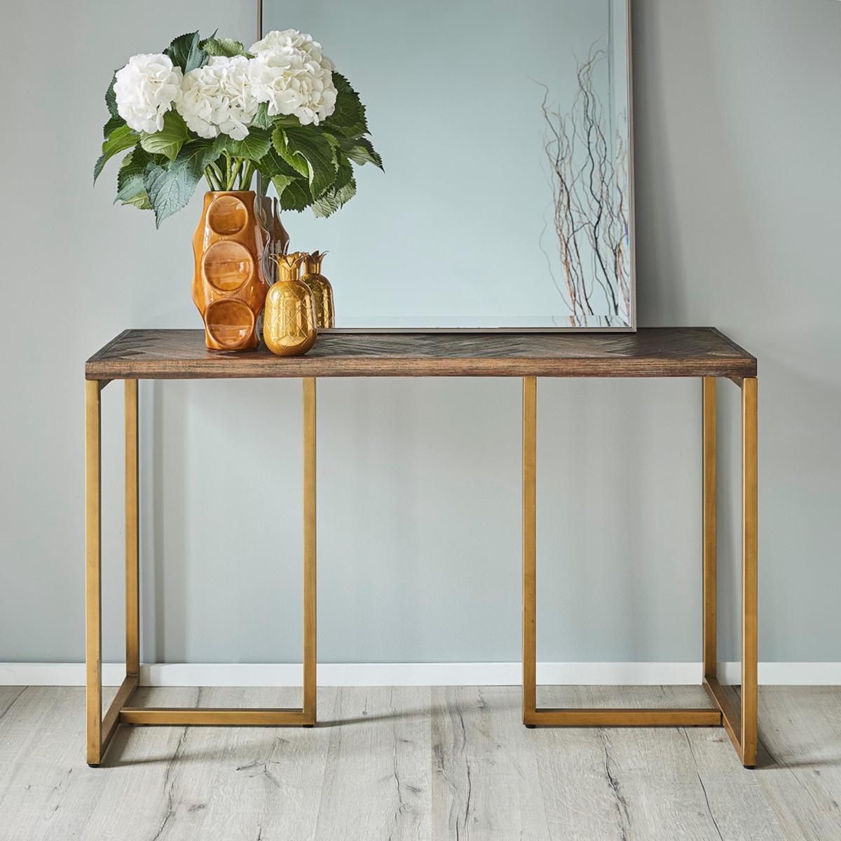 This table is the perfect small accessory for your entryway or hall, adding both style and function to a space that probably needs a little something. With its angular brass legs and perfectly herringbone-detailed tabletop, it looks like the missing piece to any room.