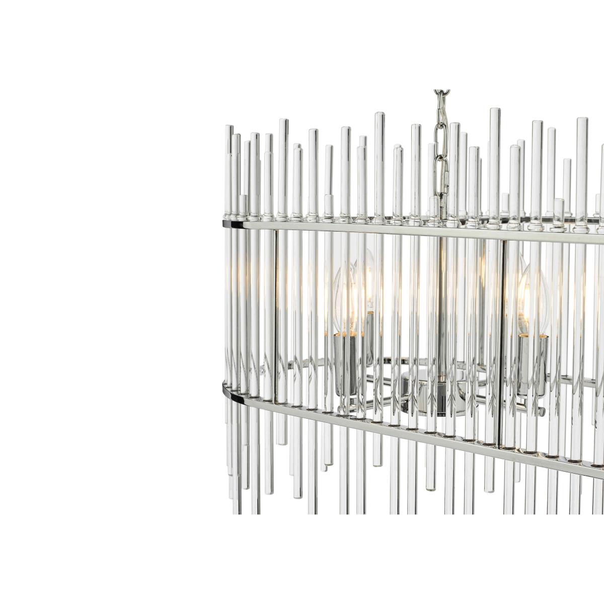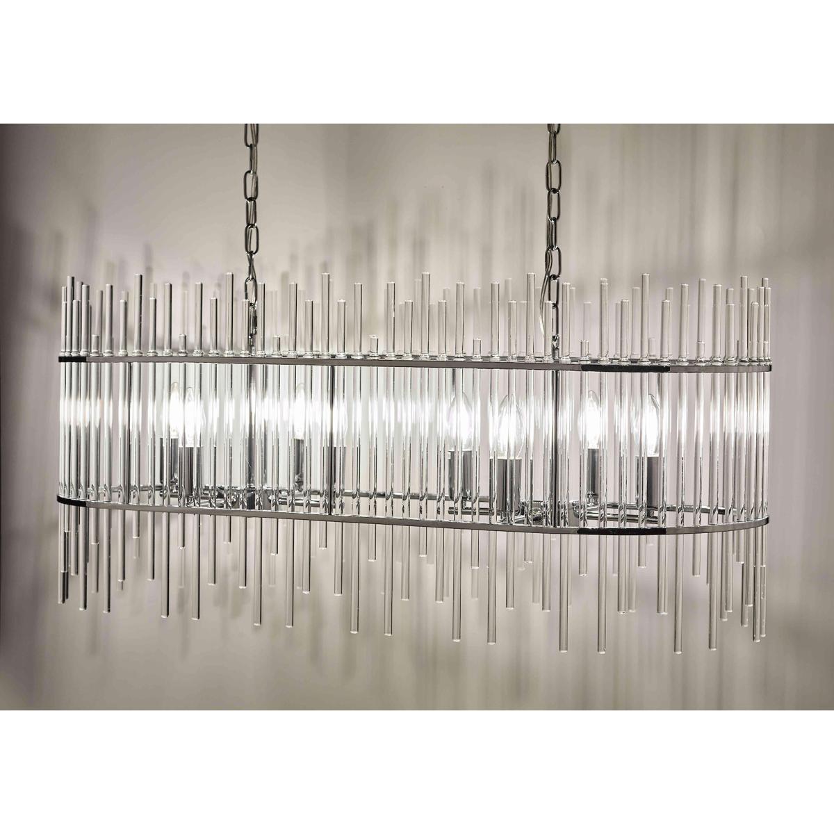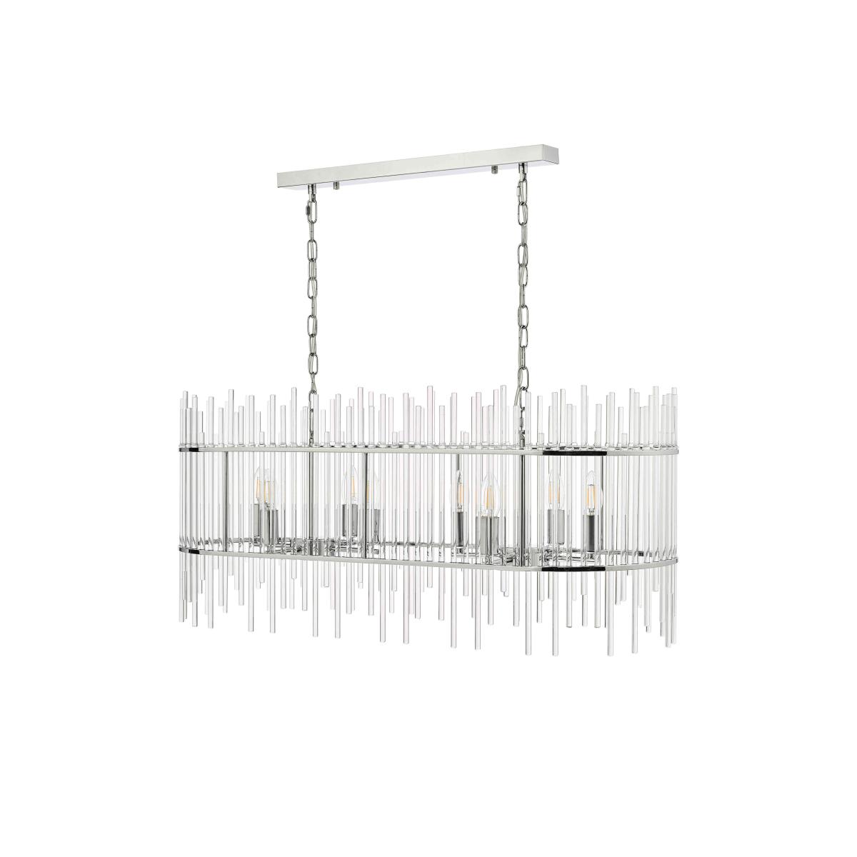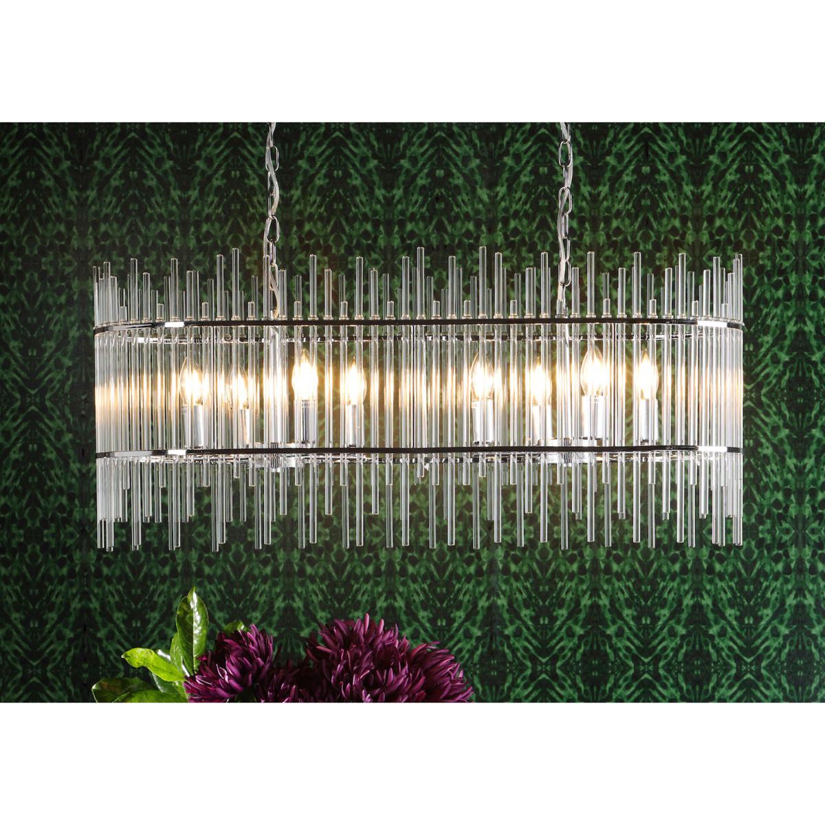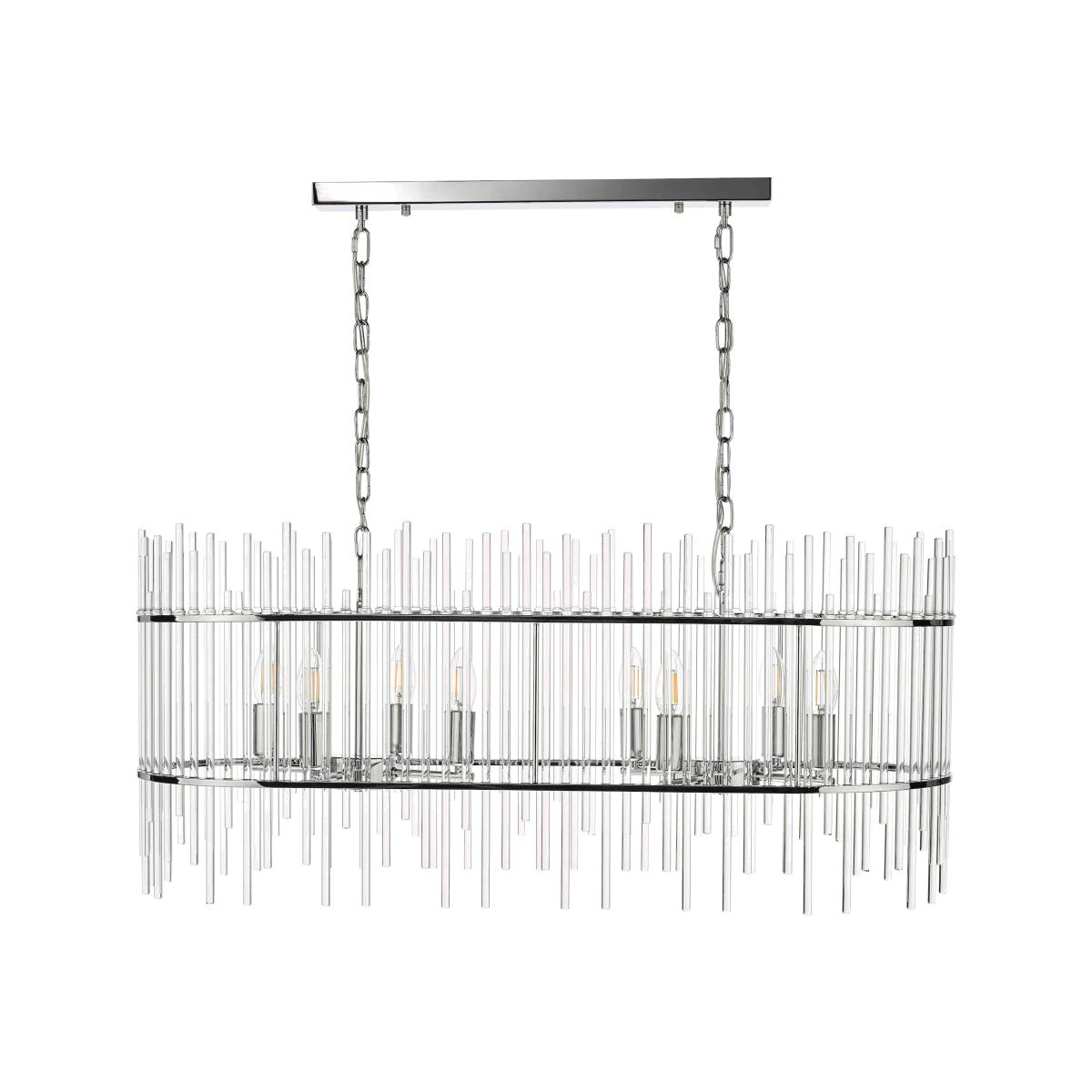 Elegant, stylish and definitely unique, this glass and chrome bar pendant light makes a wonderful centrepiece in a dining room or over an island in a contemporary kitchen. Why you'll love it. This beautiful bar pendant light is a stunning piece of design. Contemporary glam style. Shimmering asymmetric glass rods surround an 8-light candelabra. Crafted in a sparkling combination of polished chrome and glass. Height adjustable on installation. This bar pendant light is part of the Furniture Village accessories collection. What you need to know. Made of metal and glass. Supplied with 150 cm of chain and clear cable. Requires 8 x 40W E14 bulbs, not supplied. Dimensions. Height: 39 cm (16 in). Depth: 33 cm (13 in). Width: 90 cm (36 in).