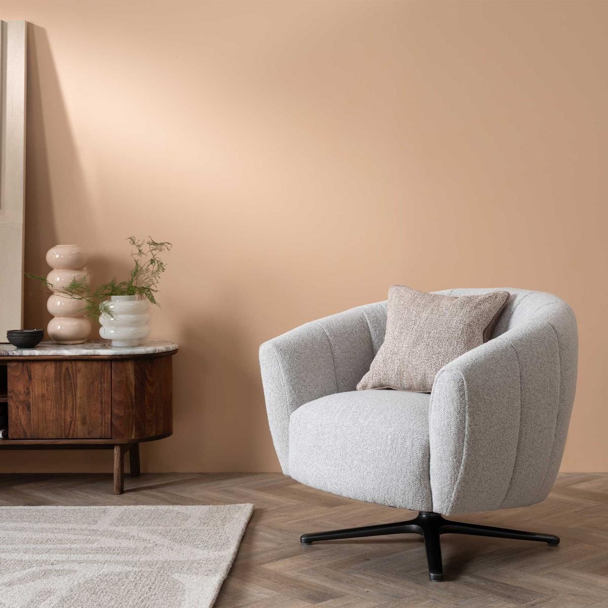 I’m a fan of the Finola swivel chair for its clean, curved lines and soft boucle-like fabric - it feels both modern and approachable. The gentle swivel base adds a touch of practicality, so it works just as well in a snug reading nook as it does paired with a sleek sofa in an open-plan living area. Styling-wise, keep it simple: place it beside a slim metal or marble side table with a compact lamp, and layer on a textured cushion or a cashmere throw in a muted tone. It sits equally well in Scandinavian, mid-century or minimalist schemes, and you can anchor it with a dark-hued rug or place it against a deep-coloured wall for a subtle yet impactful contrast.