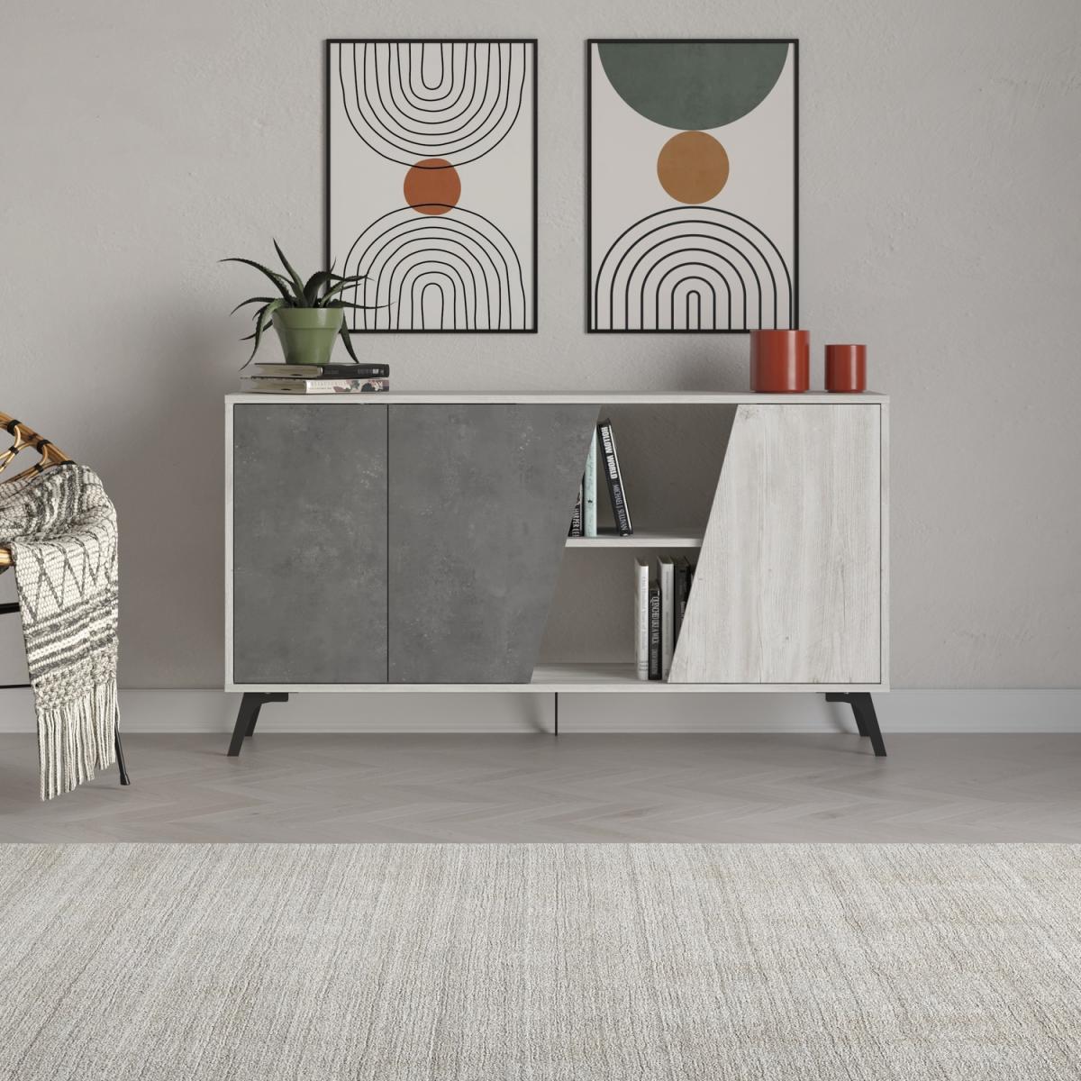 Upgrade your home decor with our stylish and functional sideboard. It is designed to enhance any room with its unique and eye-catching design. This sideboard offers ample storage space with three cabinets and two open compartments, allowing you to keep your belongings organized and easily accessible. The sturdy metal legs not only provide stability but also add a touch of style to this piece. They are built to last and ensure the durability of the sideboard. Assembly is required, but don't worry! The sideboard comes with all the necessary fittings and fixings, and the assembly process is made easy and enjoyable with clear instructions provided. You'll have it set up and ready to use in no time. Crafted with high-quality engineered wood and a protective melamine finish, this sideboard is designed to withstand daily use and maintain its beauty over time. It is also easy to maintain and clean - simply use a damp cloth to wipe it clean, without the need for any harsh chemicals. To ensure a secure delivery, the sideboard is packaged in sturdy and recyclable packaging that is specially designed for protection during transit. This way, you can have peace of mind knowing that your sideboard will arrive in perfect condition. If you have any questions or need assistance, please don't hesitate to send us a message. We are here to improve your experience and provide you with the information you need.