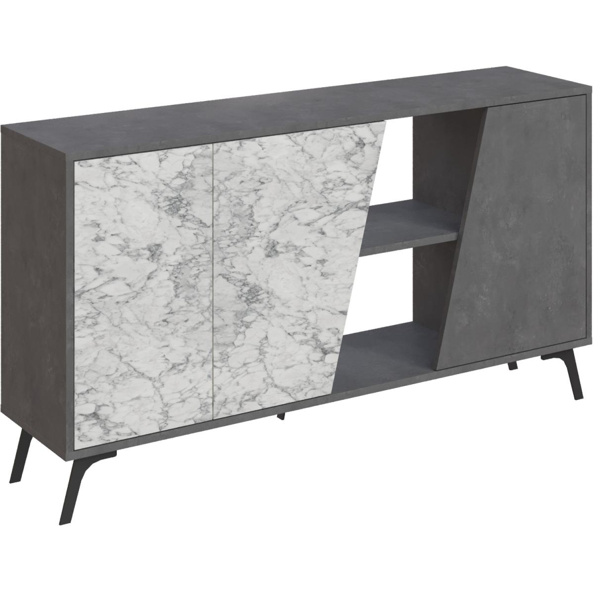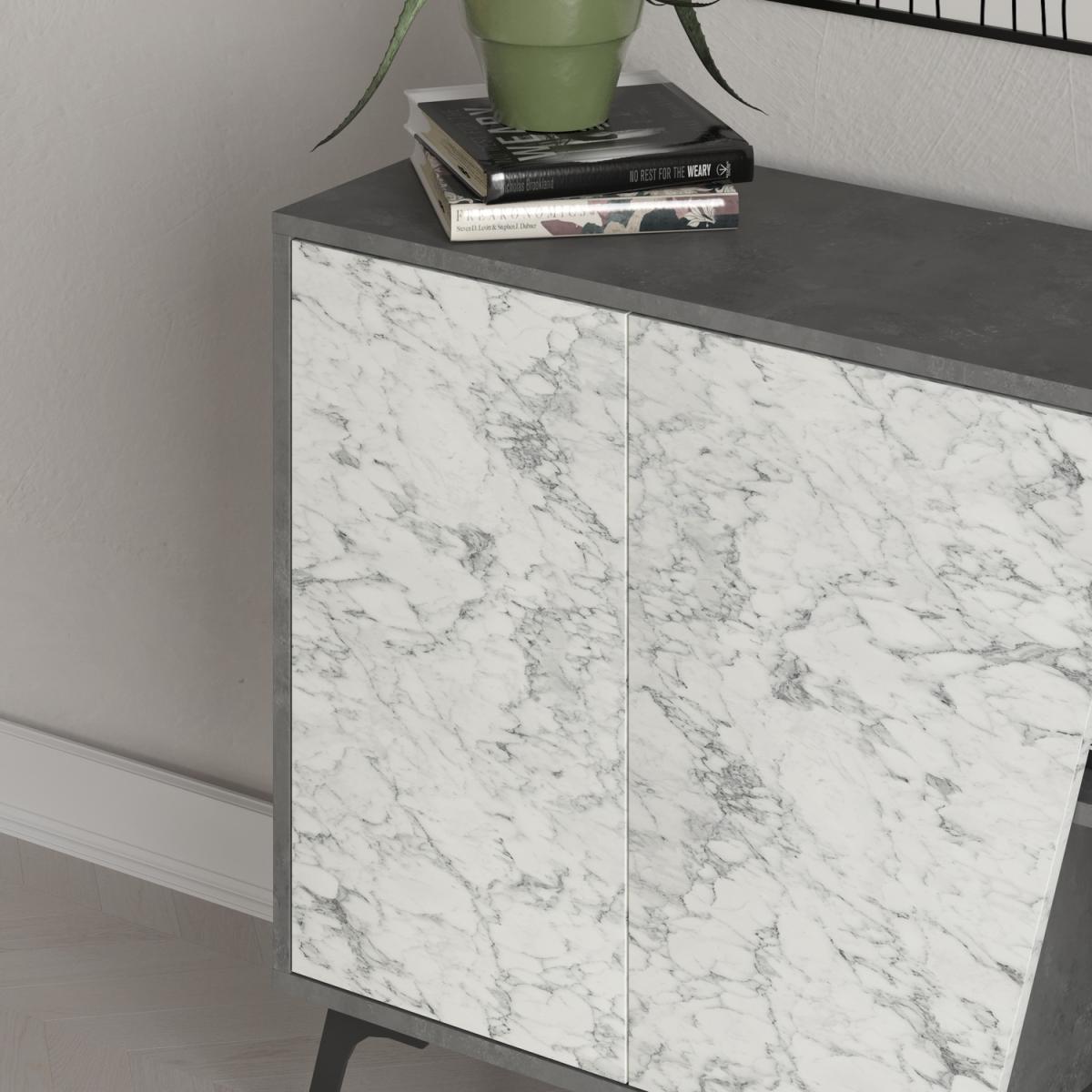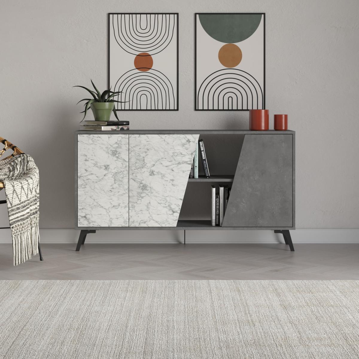 Upgrade your home decor with our stylish and functional sideboard. It is designed to enhance any room with its unique and eye-catching design. This sideboard offers ample storage space with three cabinets and two open compartments, allowing you to keep your belongings organized and easily accessible. The sturdy metal legs not only provide stability but also add a touch of style to this piece. They are built to last and ensure the durability of the sideboard. Assembly is required, but don't worry! The sideboard comes with all the necessary fittings and fixings, and the assembly process is made easy and enjoyable with clear instructions provided. You'll have it set up and ready to use in no time. Crafted with high-quality engineered wood and a protective melamine finish, this sideboard is designed to withstand daily use and maintain its beauty over time. It is also easy to maintain and clean - simply use a damp cloth to wipe it clean, without the need for any harsh chemicals. To ensure a secure delivery, the sideboard is packaged in sturdy and recyclable packaging that is specially designed for protection during transit. This way, you can have peace of mind knowing that your sideboard will arrive in perfect condition. If you have any questions or need assistance, please don't hesitate to send us a message. We are here to improve your experience and provide you with the information you need.