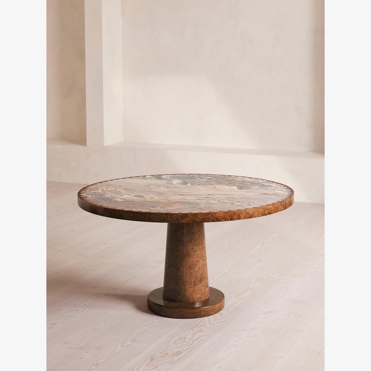 A unique, scalloped top is made from Brazilian quartzite to create a table that seats up to six people. Characterised by natural veining in deep, earthy tones, the scalloped top of the Fiore table is made with Brazilian quartzite to ensure no two pieces are completely alike. The table's round, pedestal silhouette features ash burl at the top and base with solid oak lipping.