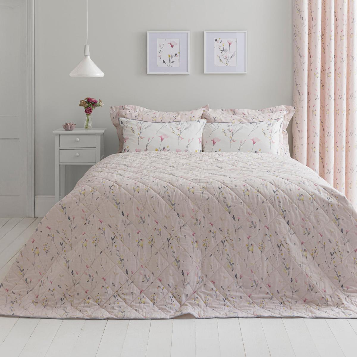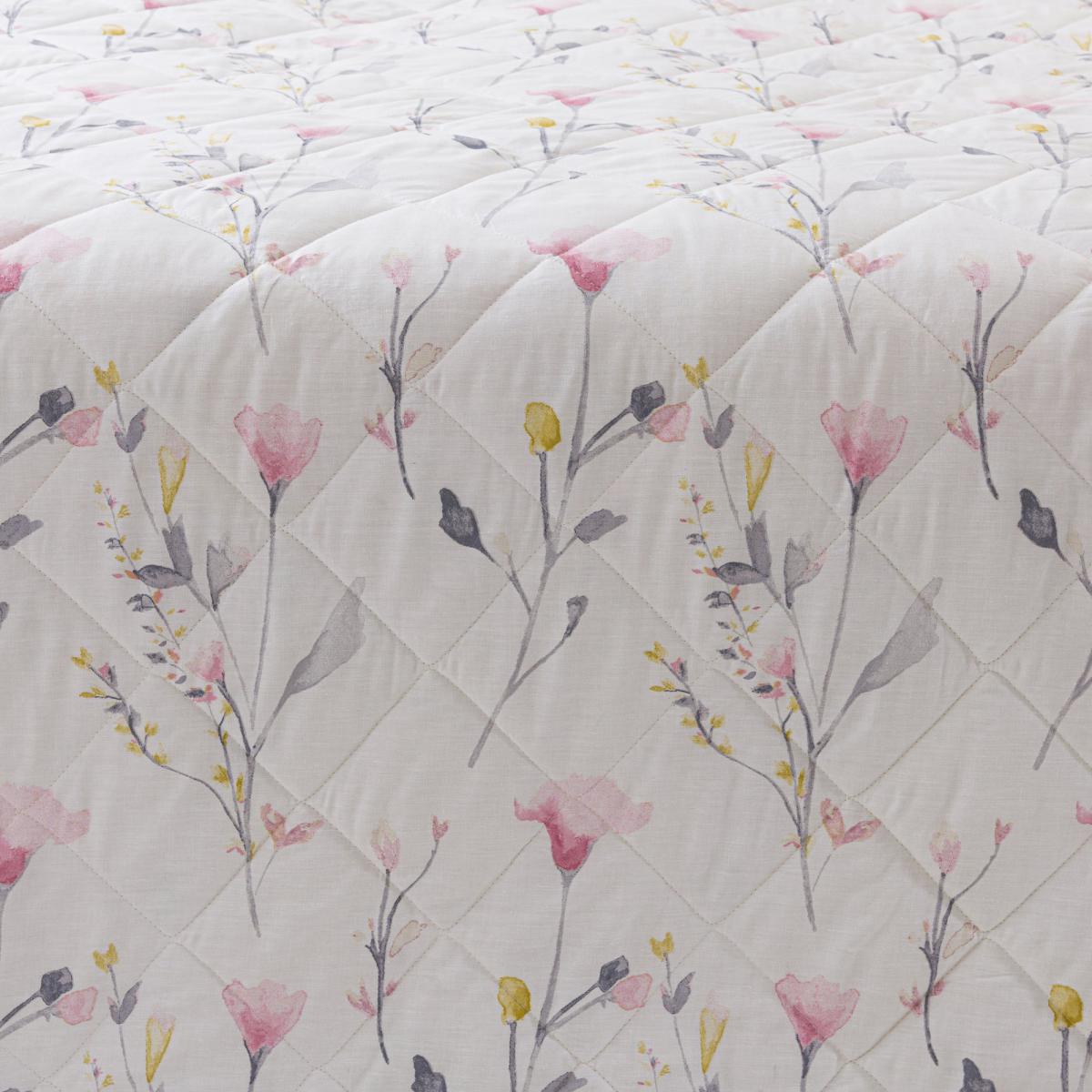 Add a feminine touch to your bedroom with our Fiori bedspread, decorated with delicate watercolour florals against a pristine white background. On the reverse of the bedspread, the beautiful florals are set against a soft pink background, providing you with two pretty looks in one. Made from a durable and easy-care polycotton blend, the bedspread comes in two sizes. This quilted bedspread is embroidered with a diamond pattern. Style this quilted bedspread with matching bed linen, curtains, and our pink flower cushion to complete the look. 235cm x 235cm – Suitable to cover a double and kingsize bed. 265cm x 265cm – Suitable for a super kingsize bed.