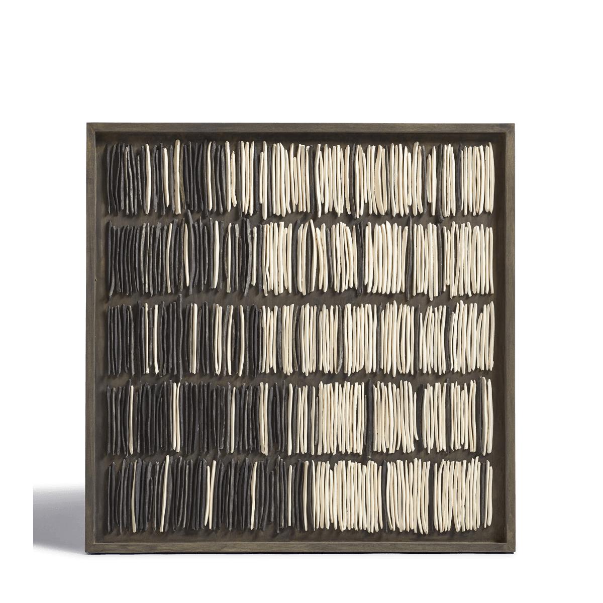 The Fiovana Clay Wall Art celebrates texture with rows of irregular white and charcoal batons of clay. It has been designed exclusively for OKA and is handmade by a company committed to creating employment for local South African women in need; many of whom have been affected by poverty and HIV. The women learn to specialise in specific techniques, which they are able to execute from the comfort of their own homes, providing essential work and skills to poverty-stricken communities. Every piece of clay is handmade and crafted into the artwork, laid to create interest through shadow and light, ensuring each final design is utterly unique.