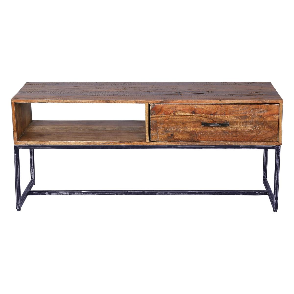 Simple and spare, the Fire 1 drawer TV cabinet is the perfect piece for anyone who loves today’s popular industrial look. Crafted from solid acacia wood, this media unit has a beautifully natural finish, authentically raw and uneven. A lacquer coating brings out the rich warm tones of the wood. It’s set on a simple weathered iron base. Alcove shelving and a single drawer, adorned with a linear black metal handle, provides useful storage for media components and remote controls. Handcrafted in India, the Fire 1 drawer TV cabinet is part of the extensive Fire range of industrial-style living room and dining pieces. Pair this media cabinet with the Fire 3 door cabinet, which has a similar attractive arrangement of open and closed storage. A Furniture Village exclusive.