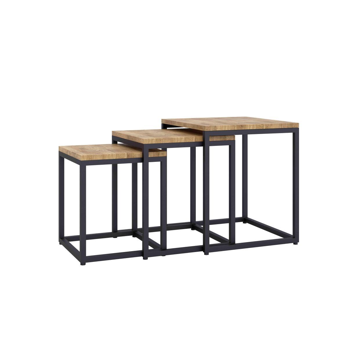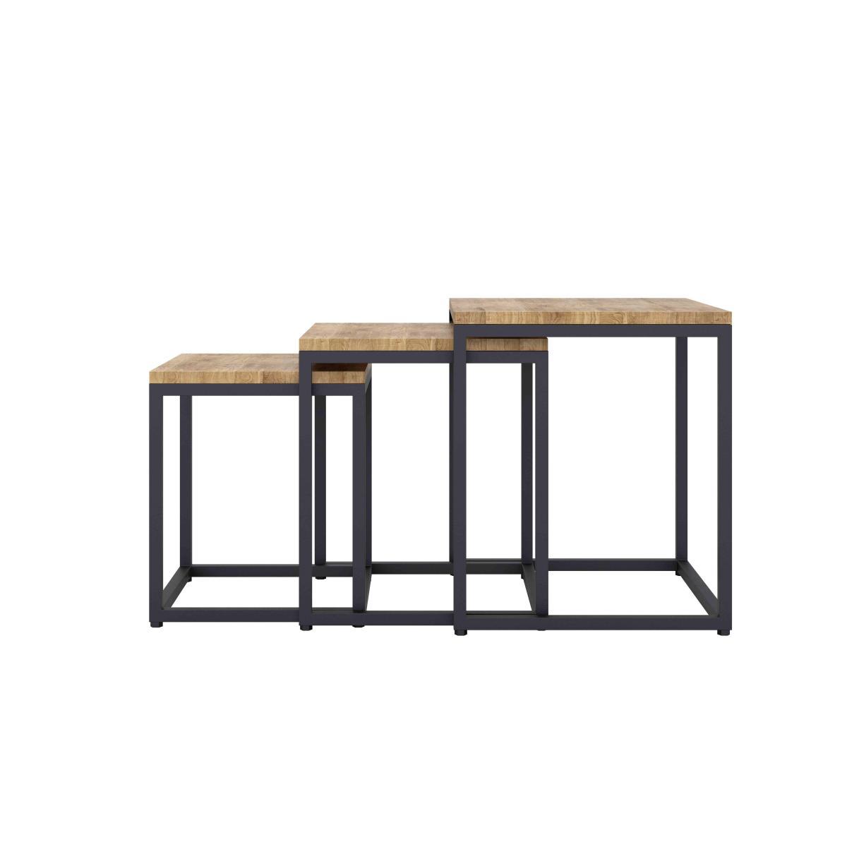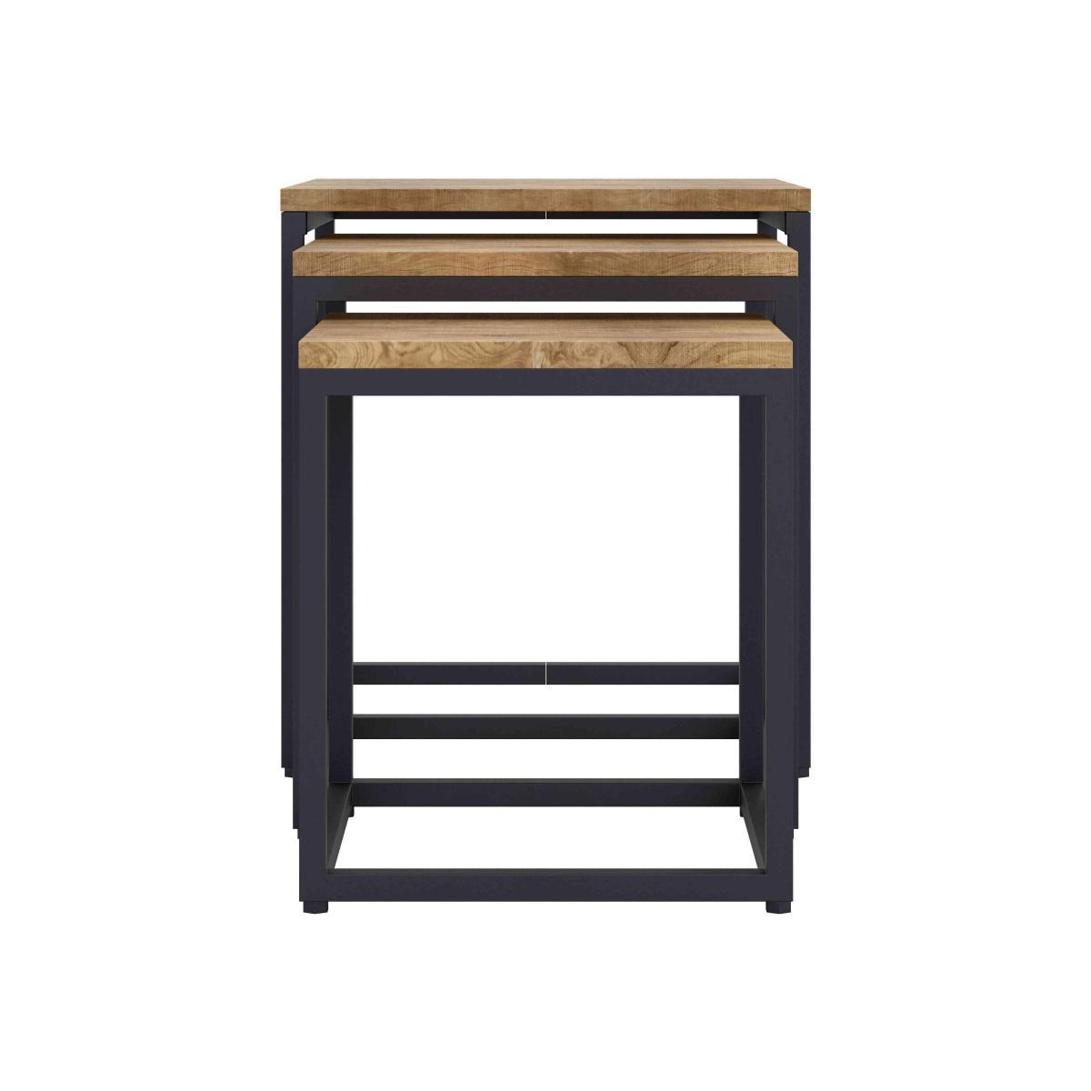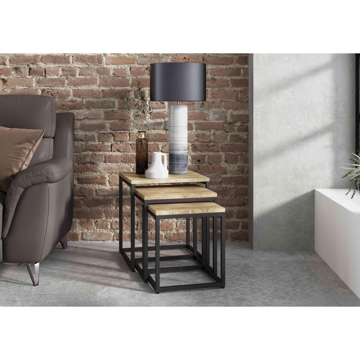 Choose simple, modern industrial style with the Fire 2.0 range, beautifully handcrafted from raw acacia wood and weathered black iron. Matt lacquer brings out the unique grain of the wood, while gun metal black frames add that authentic urban edge. The range includes dining tables, occasional furniture, storage and very cool retro modern dining chairs. Made exclusively for Furniture Village. The Fire 2.0 nest of 3 tables can be brought out when guests come over. Perfect for trays of drinks or nibbles. The graduated size tables are beautifully handcrafted in India from acacia wood and weathered iron. Why you'll love it. Authentic, handcrafted industrial nest of tables. Clean-lined design suits the contemporary home. Nested tables are easy to tuck away in a corner. The raw acacia wood tops are rich in texture with beautiful imperfections. Strong black metal frames are weathered iron. Every table is different with its own unique character. A Furniture Village exclusive, at a fantastic value price. What you need to know. The table tops are made of solid natural acacia wood so every table is unique, with its own natural markings, knots and colour variations. A protective matt lacquer brings out the wood’s natural grain. Avoid placing in direct sun or close to heat. We recommend using coasters and placemats at all times. Easy to care for, simply wipe with a clean, non-abrasive damp cloth. The iron frames have a weathered texture and are gun metal black. Marks and blemishes in the frames are normal for this industrial style. Be sure to tighten legs and bolts every 3 to 4 months. For more advice, see our Dining Care Guide. Handcrafted in India. Part of the extensive Fire 2.0 dining and occasional range.
