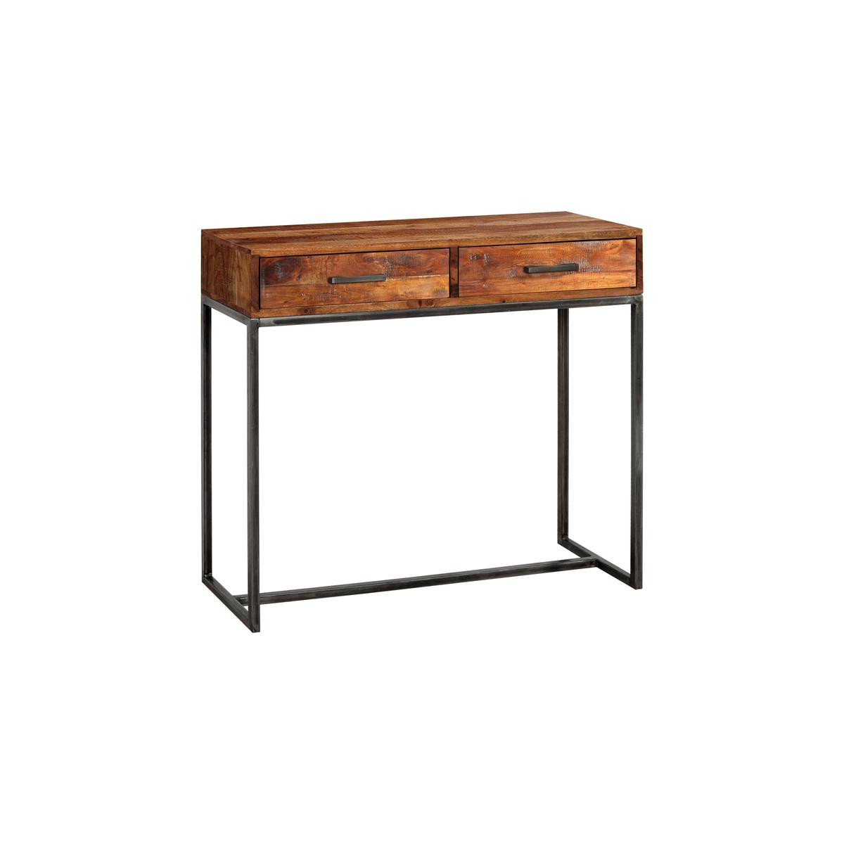 Set on a simple black unfinished iron base, the Fire 2 drawer console table is a perfect example of modern industrial furniture. It’s crafted from authentic natural materials, it’s strong and sturdy, and it’s inherently functional. This piece – perfect for a hallway or dining room – is large enough to hold a lamp and display family photos. The two roomy drawers, each with black metal handle, are ideal for keeping bits and pieces neatly hidden away. It’s hand made in India from solid acacia wood with an authentic raw texture, beautifully uneven. A lacquer finish brings out the wood’s rich warm colouration. Part of the Fire collection of on trend industrial furniture, the Fire 2 drawer console table is only available at Furniture Village. It pairs exceptionally well with the Fire lamp table and the Fire coffee table as well as the Fire mirror.