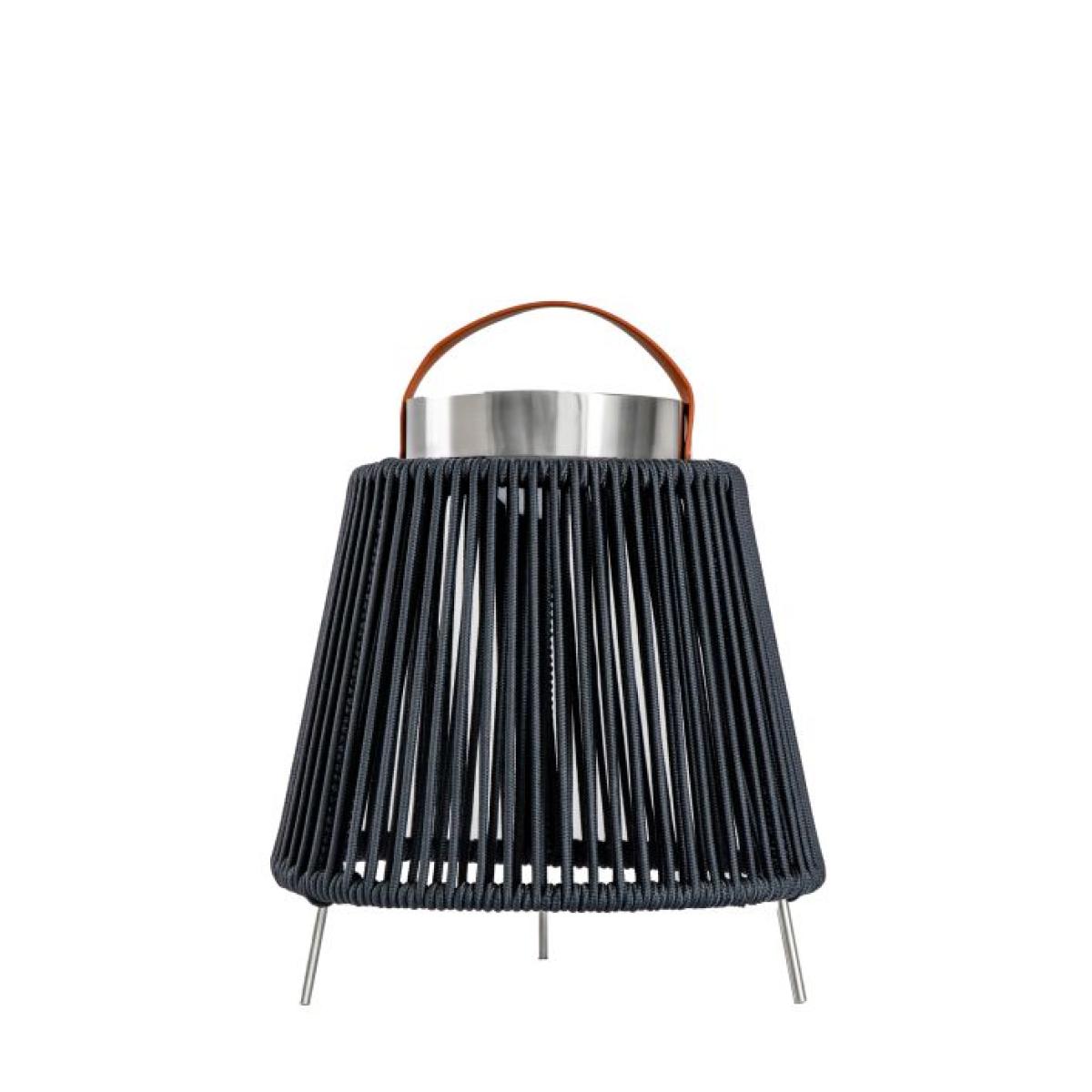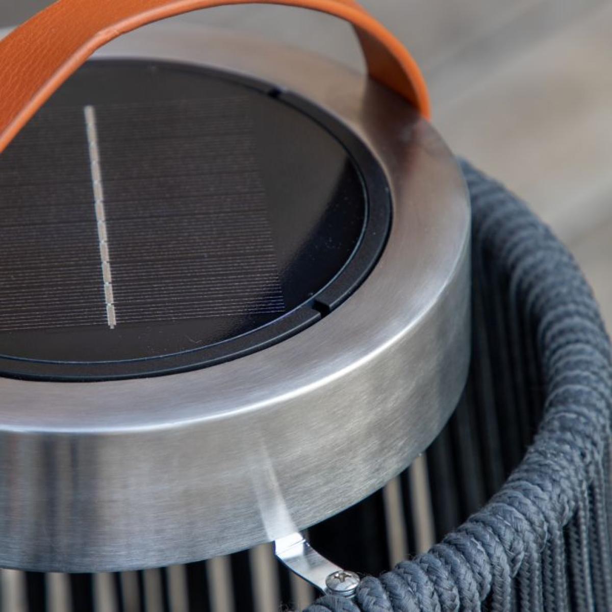 Add a modern glow to your outdoor space with this solar lamp. The elegant tapered shaped in bright brushed aluminium is finished with black woven rope, creating a contemporary and sophisticated look. Easily position this lamp wherever you need it with the chic faux leather handle. With 3 light intensity settings, the lamp can run for up to 5 hours on the brightest setting, up to 8 hours on the middle setting, and up to 12 hours on the lowest setting, after charging by direct sunlight. It can also be charged by USB (charger not included), which gives up to 32 hours of light on the brightest setting, and up to 60 hours on the lowest. Coordinating larger lamp available; the pair look great placed together.