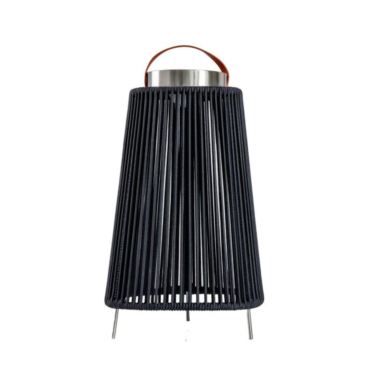 Add a modern glow to your outdoor space with this solar lamp. The elegant tapered shaped in bright brushed aluminium is finished with black woven rope, creating a contemporary and sophisticated look. Easily position this lamp wherever you need it with the chic faux leather handle. With 3 light intensity settings, the lamp can run for up to 5 hours on the brightest setting, up to 8 hours on the middle setting, and up to 12 hours on the lowest setting, after charging by direct sunlight. It can also be charged by USB (charger not included), which gives up to 32 hours of light on the brightest setting, and up to 60 hours on the lowest. Coordinating smaller lamp available; the pair look great placed together.