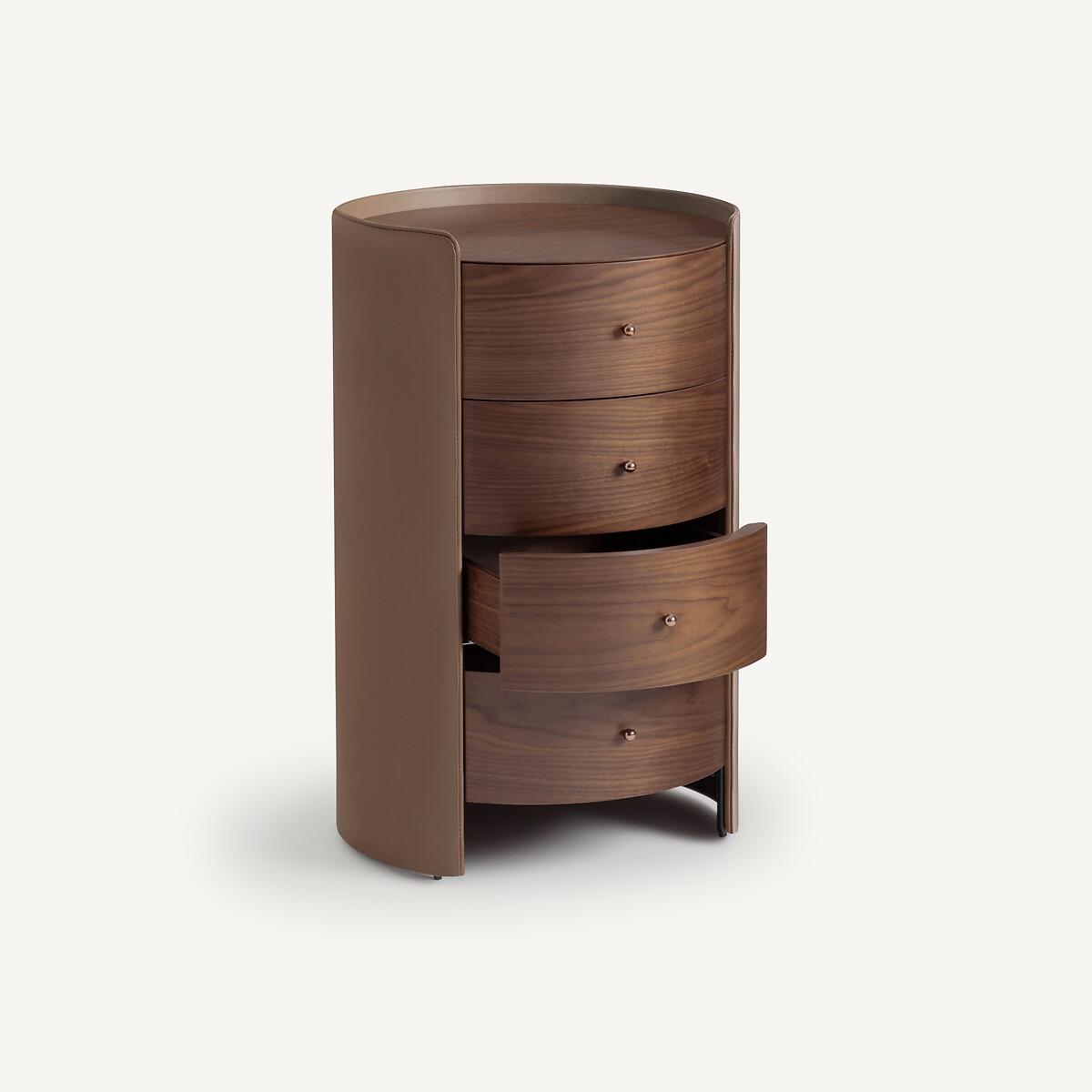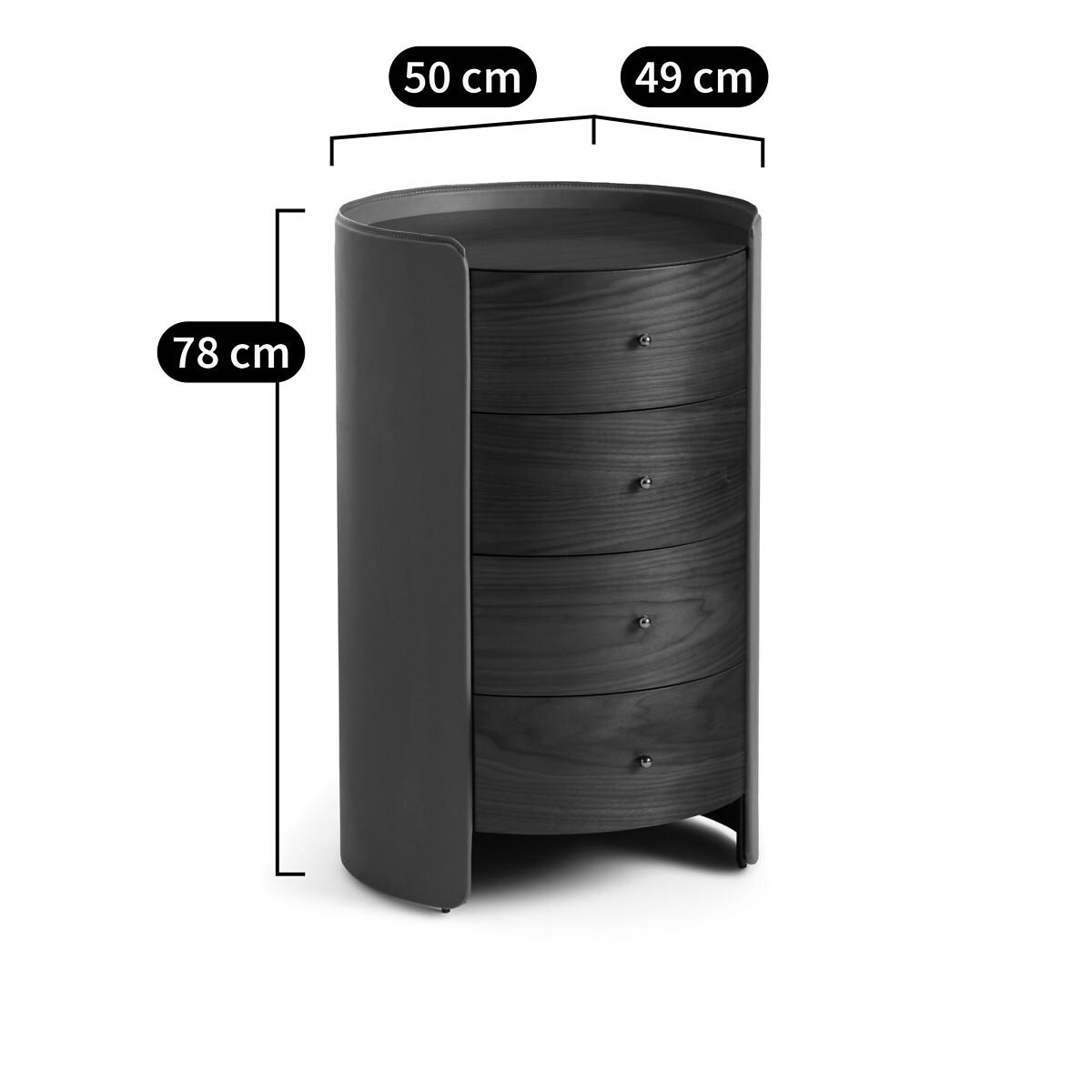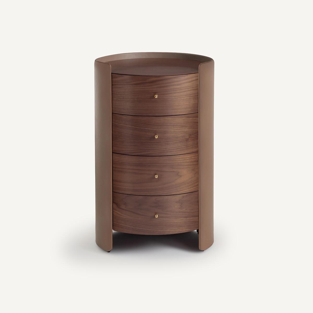 The Firmo XL bedside table with drawers in walnut and leather takes inspiration from 50s design with its vintage curves. Its walls, sheathed in genuine Italian leather, offer an elegant contrast with the walnut veneer of the drawers. Product Details • MDF structure • Sides covered with genuine Italian leather (cowhide, corrected grain, aniline finish, chrome tanning) • 4 drawers in walnut veneered MDF with nitrocellulose finish • Smooth soft-closing system • Gold-coloured metal buttons. Quality Info German brand hardware: reliable, discreet and functional. These accessories ensure the longevity of your product. Dimensions. Overall • Width: 50cm • Height: 78cm • Depth: 49cm. Usable space • Drawers : L34 x H7 x D31cm. Delivery: • Sold pre-assembled..../../RTXT_WEB/bull.jpg" />Note! Please check that all access points are large enough to accommodate your delivery (doors, stairs, lifts). • WOOD FROM SUSTAINABLY MANAGED FORESTS. FSC® certified wood comes from forests that are environmentally, socially and economically well managed. Dimensions and weight of package: • L58.5 x H86 x D58.5cm • 41kg
