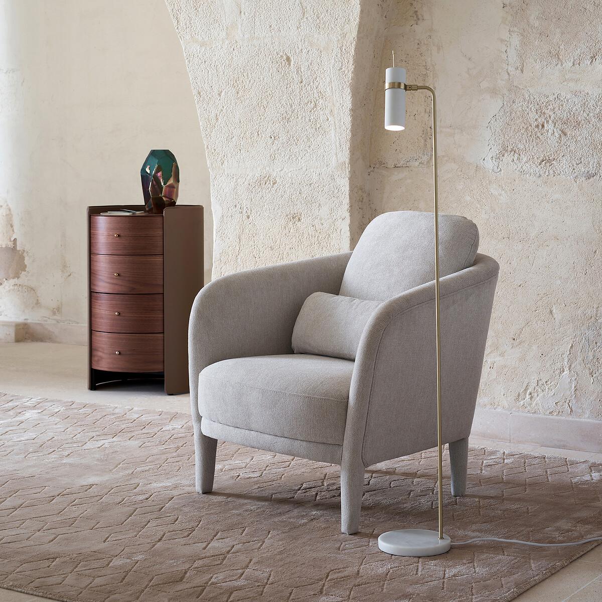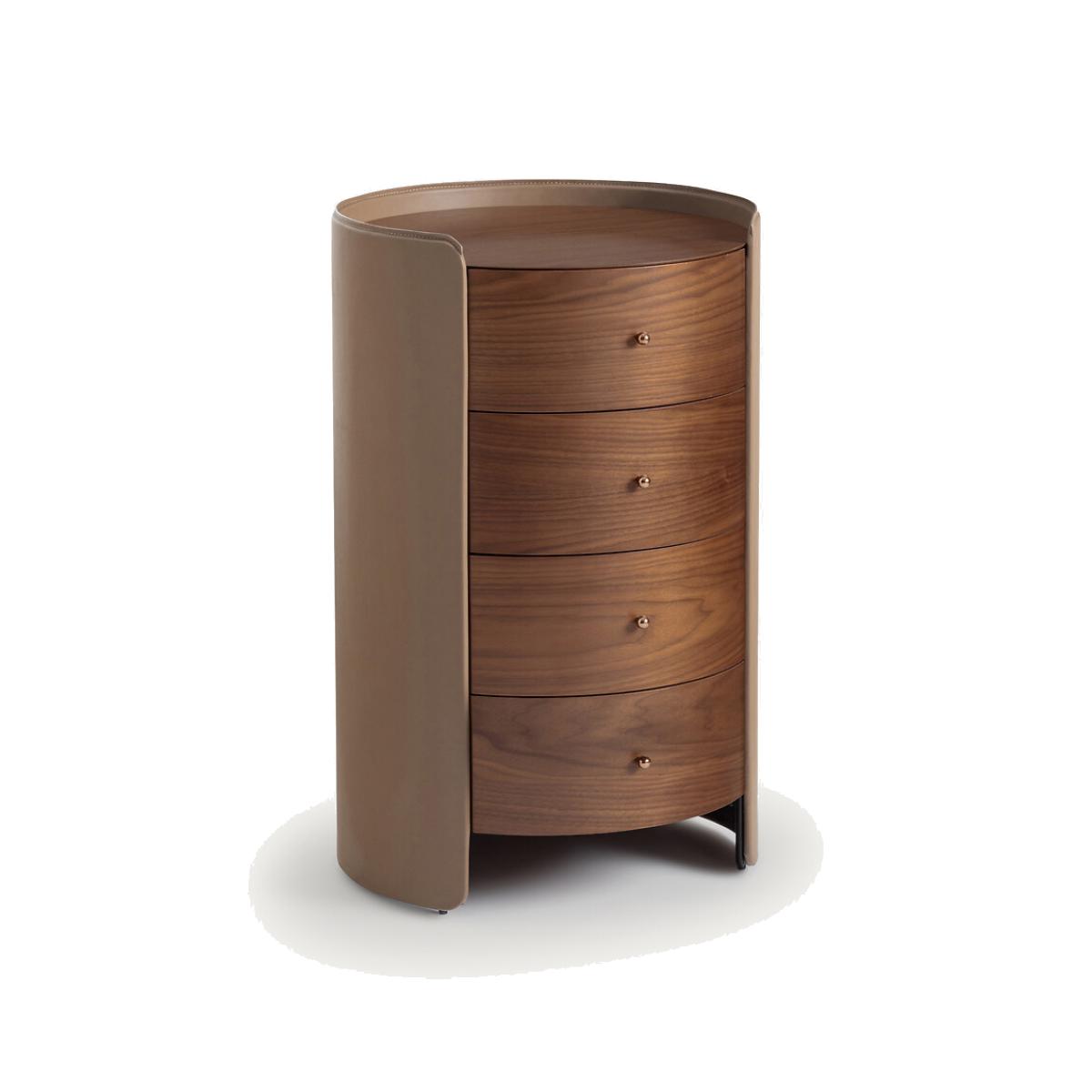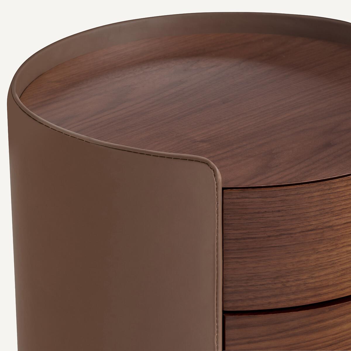 The Firmo XL bedside table with drawers in walnut and leather takes inspiration from 50s design with its vintage curves. Its walls, sheathed in genuine Italian leather, offer an elegant contrast with the walnut veneer of the drawers. Product Details • MDF structure • Sides covered with genuine Italian leather (cowhide, corrected grain, aniline finish, chrome tanning) • 4 drawers in walnut veneered MDF with nitrocellulose finish • Smooth soft-closing system • Gold-coloured metal buttons. Quality Info German brand hardware: reliable, discreet and functional. These accessories ensure the longevity of your product. Dimensions. Overall • Width: 50cm • Height: 78cm • Depth: 49cm. Usable space • Drawers : L34 x H7 x D31cm. Delivery: • Sold pre-assembled..../../RTXT_WEB/bull.jpg" />Note! Please check that all access points are large enough to accommodate your delivery (doors, stairs, lifts). • WOOD FROM SUSTAINABLY MANAGED FORESTS. FSC® certified wood comes from forests that are environmentally, socially and economically well managed. Dimensions and weight of package: • L58.5 x H86 x D58.5cm • 41kg