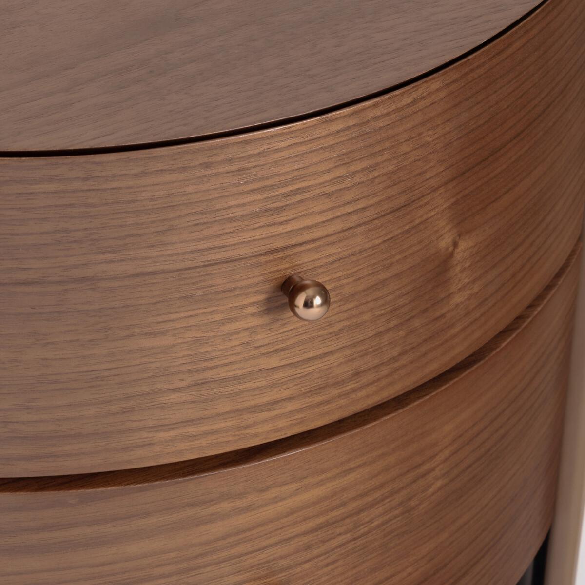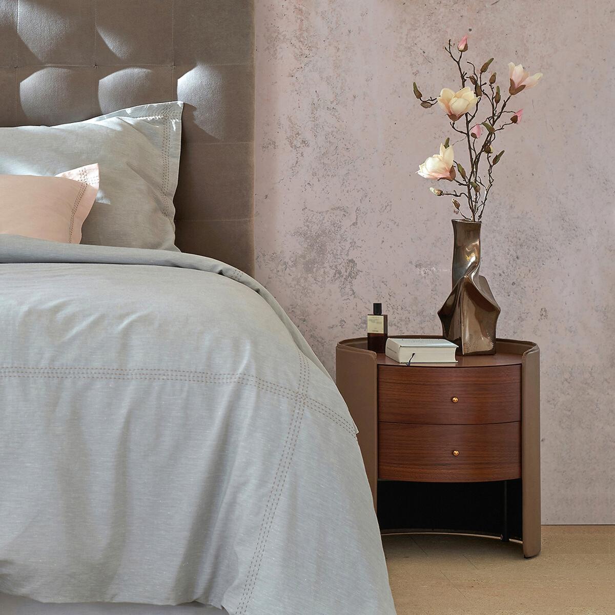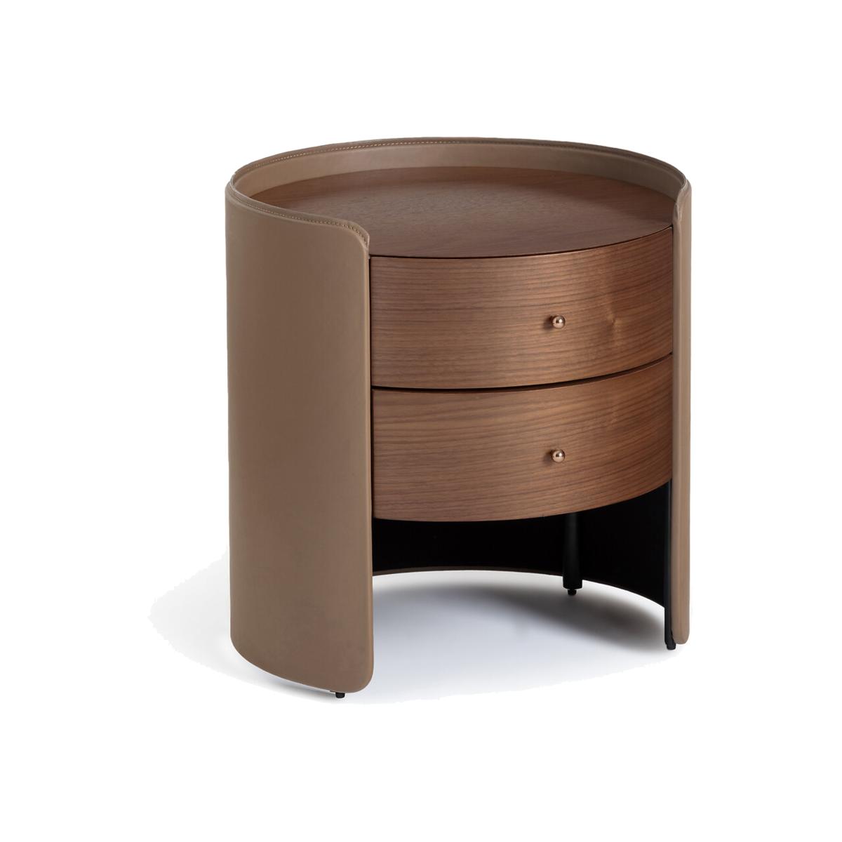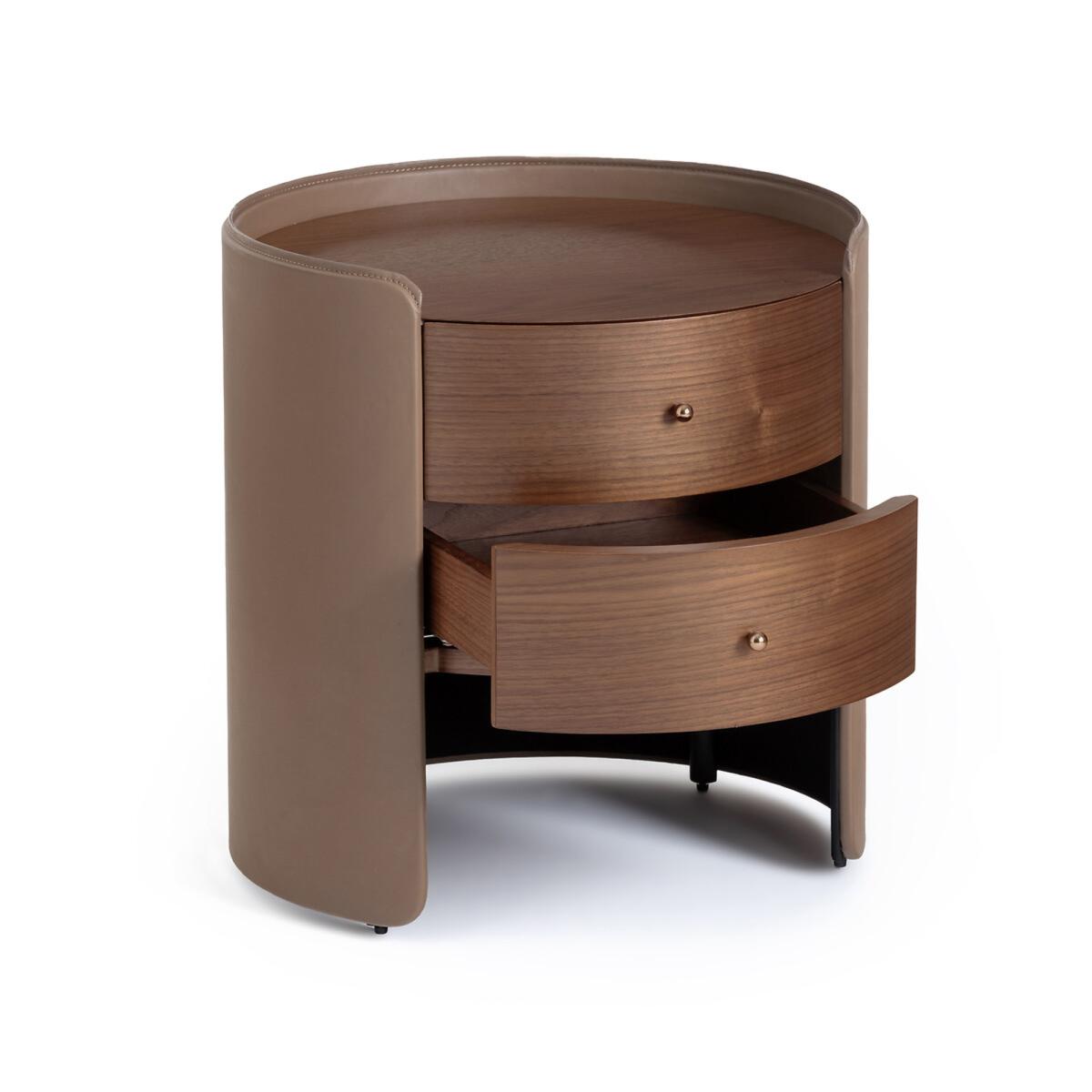 The Firmo walnut and leather bedside table takes inspiration from 50s design with its vintage curves.
