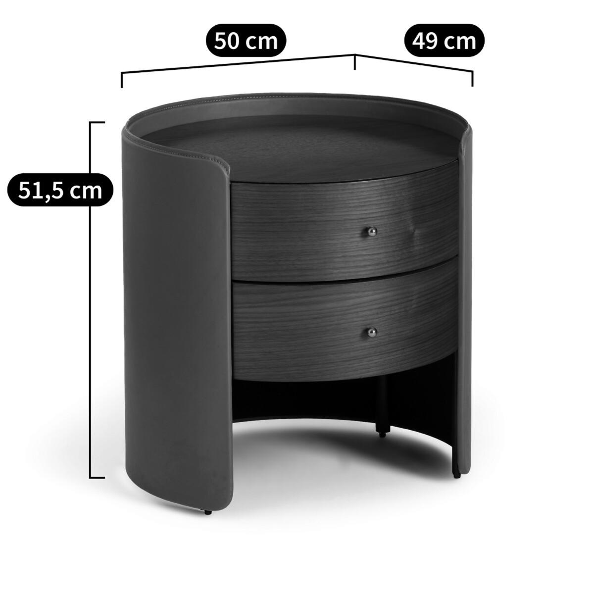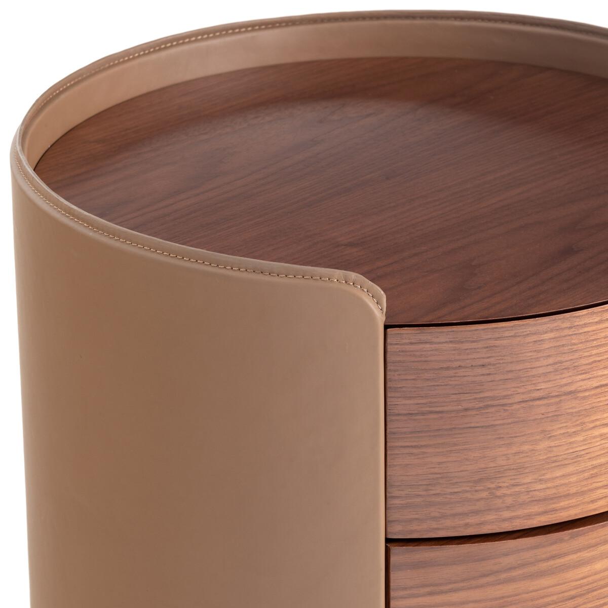 I love this bedside table for its warm walnut finish combined with leather accents, which adds a touch of sophistication while staying versatile. It works particularly well in contemporary or mid-century-inspired interiors, where natural textures and sleek forms are key. For styling, consider pairing it with neutral bedding and minimalist accessories to let the wood and leather stand out, or add a pop of colour through decorative objects or a statement lamp on top. Its compact size makes it perfect for smaller bedrooms, and the rounded shape offers a softer aesthetic that complements both modern and eclectic schemes. Practical tip: keep a small tray or organiser on top to keep the surface tidy without disrupting its clean look.