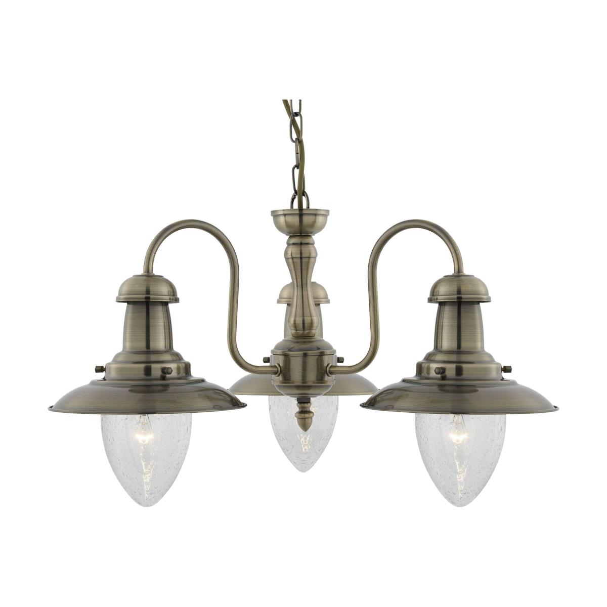 This Fisherman II Antique Brass metal 3 light pendant with oval clear seeded glass features three sturdy shades attached to the central fitting with attractive curved arms. The three industrial-inspired shades have a Antique finish, with rounded edges and oval seeded glass shades which provides a stylish water droplet effect. This classic 3 light pendant will look at home in any traditional living space.