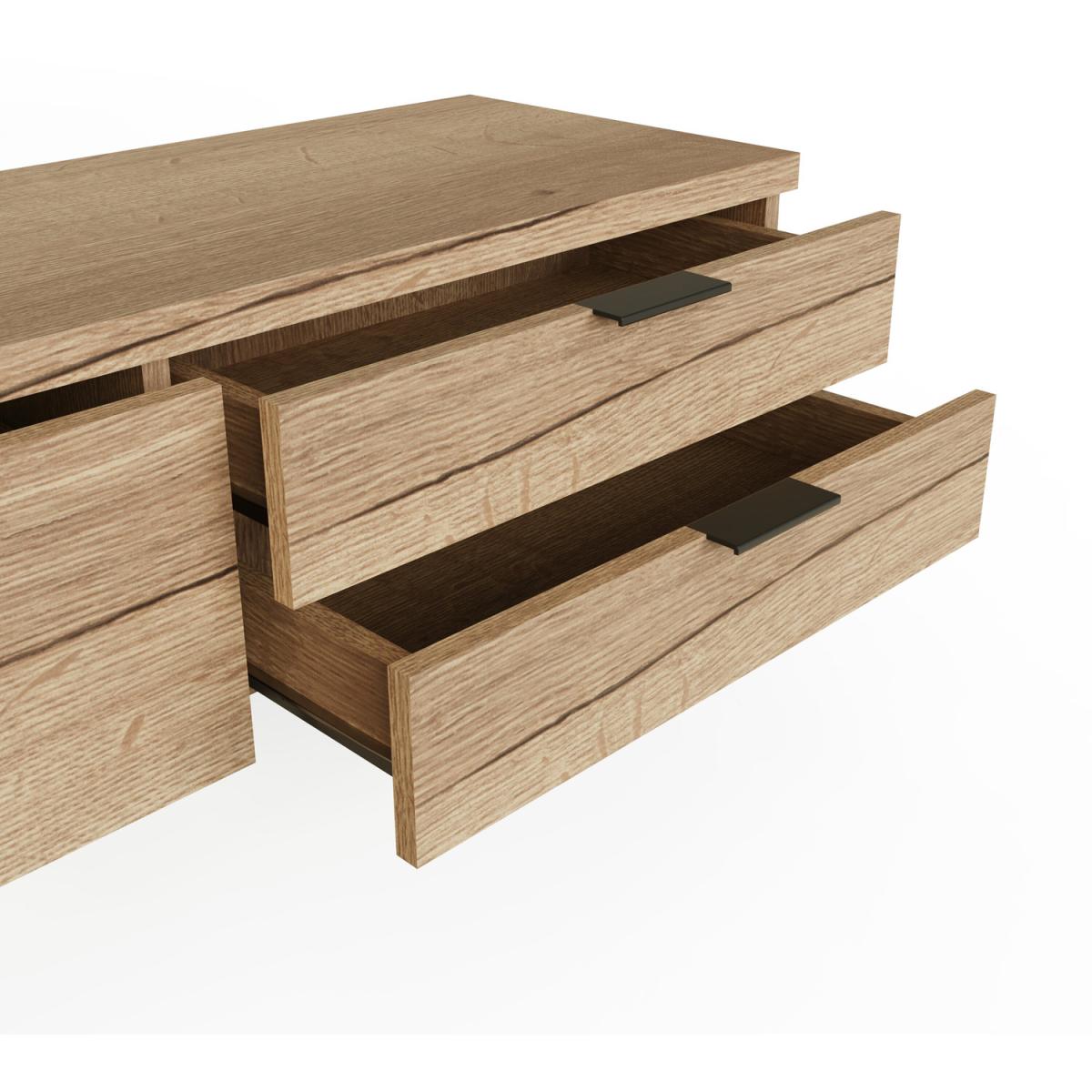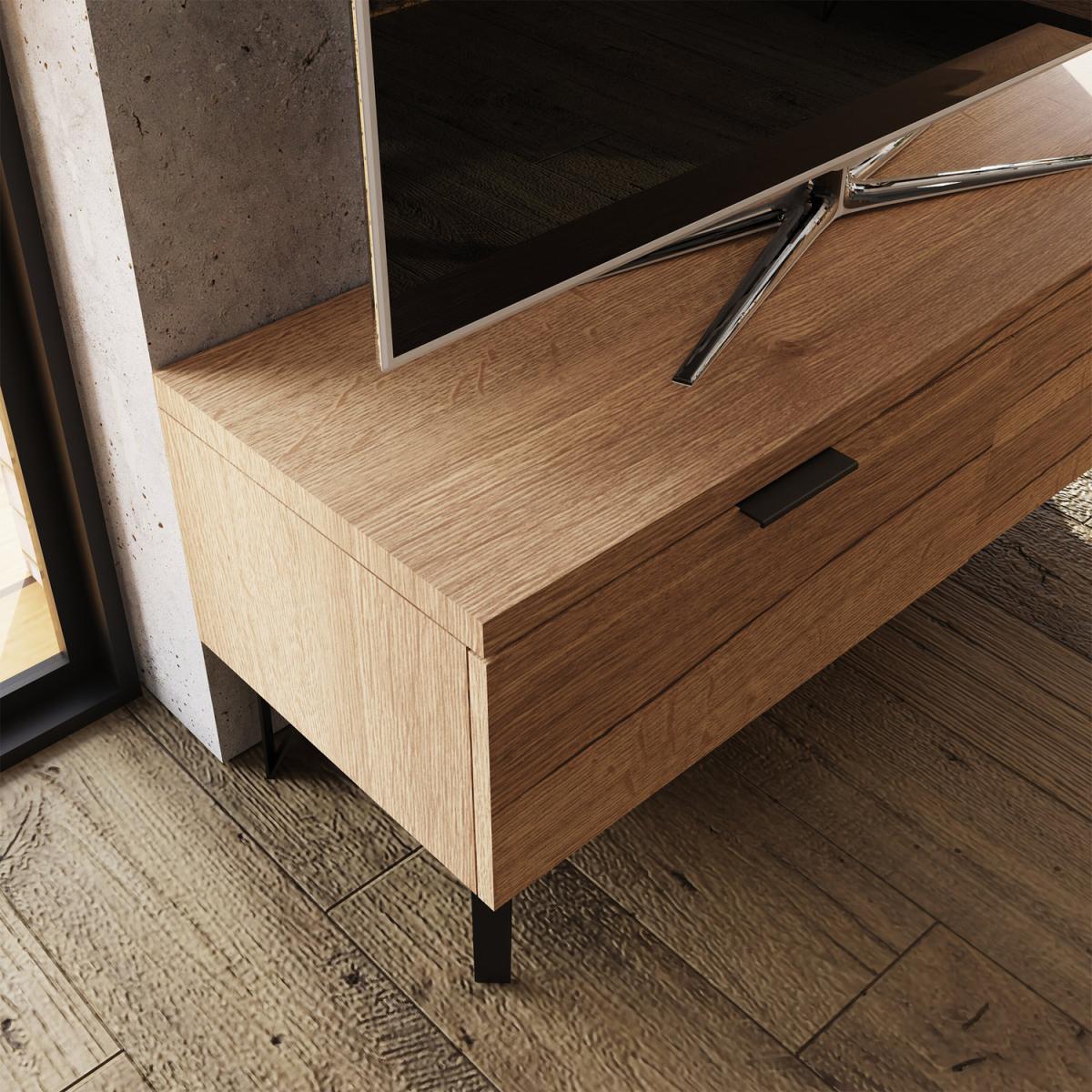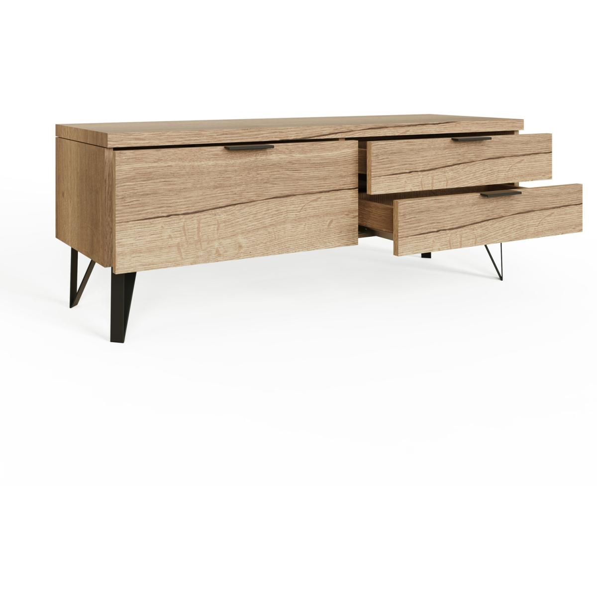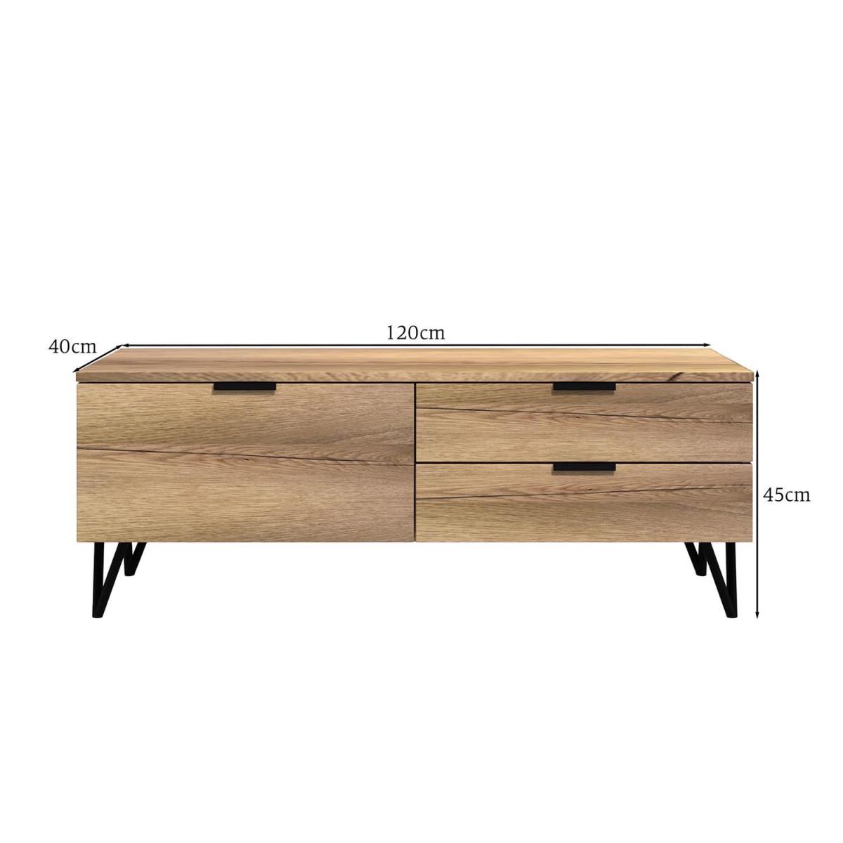 Introducing the Fisso Small TV Unit in Cracked Oak, a piece that merges functionality with aesthetic appeal. This unit is designed to be the centrepiece of your living room, ensuring that your TV, media devices, and other electronics are organised and accessible. The laminated MDF construction ensures durability, while its cracked oak finish adds a rustic touch. Perfect for those who love to binge-watch their favourite shows or enjoy movie nights with family and friends. Ditch those toolbox blues, assembling this piece is a breeze. Each panel simply clicks together using a patented hook and groove system, eliminating fiddly hardware and so much stronger too!Click together in less than half the time of standard flat-pack. Cracked oak veneer finish, capturing the detailed elegance of oak wood aesthetics. Contemporary black handles and legs that add a modern flair. The 3 spacious drawers offer ample storage for CDs, DVDs, consoles and media accessories. Flat Pack - Easy DIY Quick Click Assembly - Instructions & Fittings Provided. Dimensions: H 45 x W 120 x D 40 cm