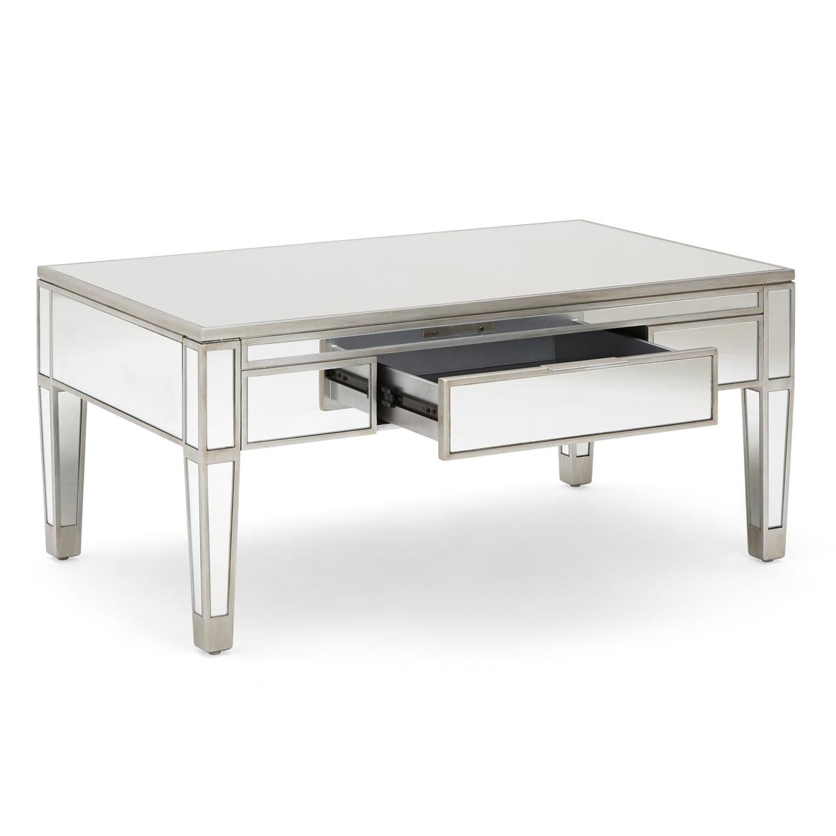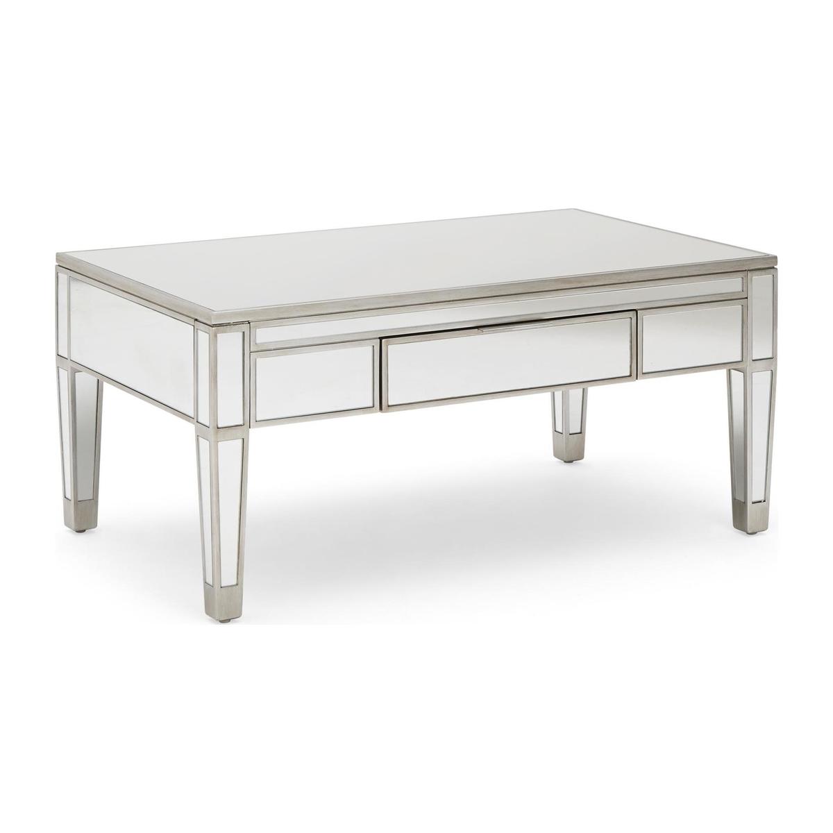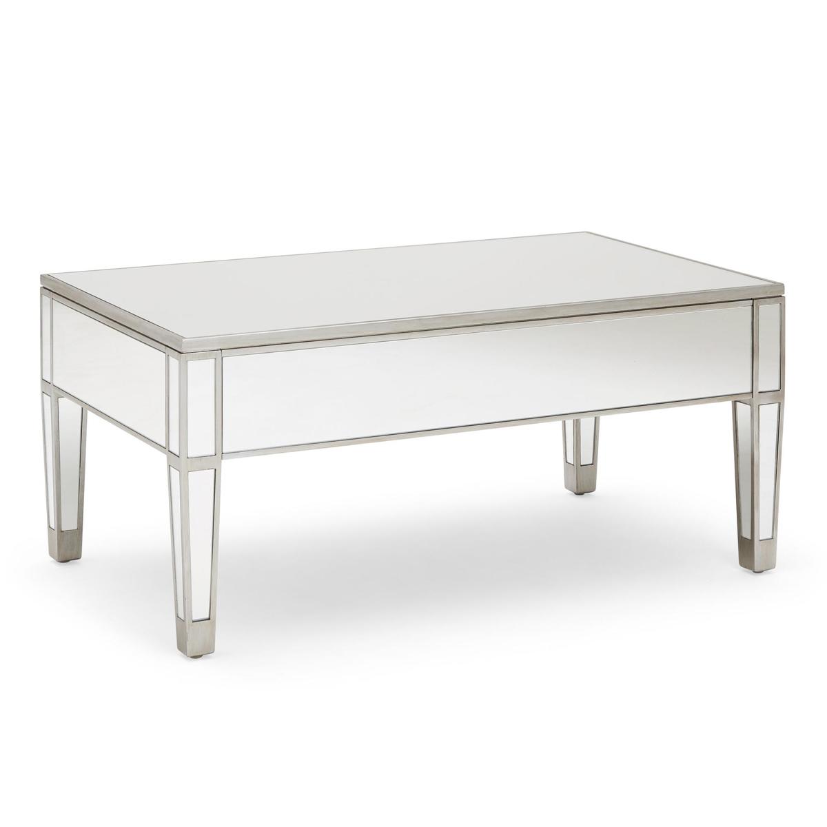 Dunelm Exclusive - Designed and Developed by Dunelm. Designed with a striking and eye-catching style, the Fitzgerald range features a contemporary mirrored glass and a pewter painted frame. Designed with contemporary metal handles, this range will provide an ample storage space whilst adding a touch of opulence and glamour to any room. The Fitzgerald coffee table features a wide, sleek style with a stunning brushed wooden trim and small tapered legs made from solid wood. Supplied with one smooth sliding drawer for extra storage space, this coffee table comes partly-assembled and would look stunning in a host of living spaces.