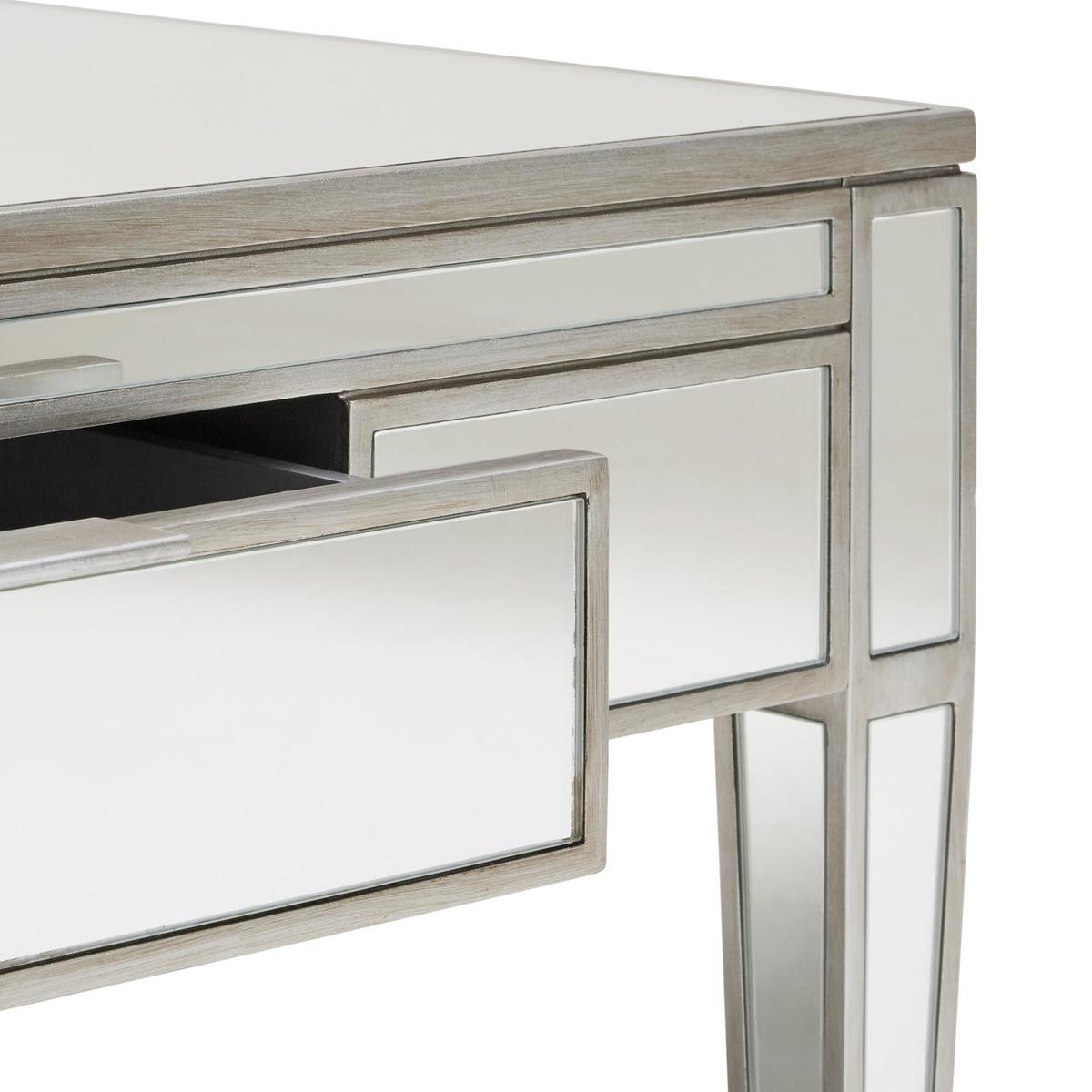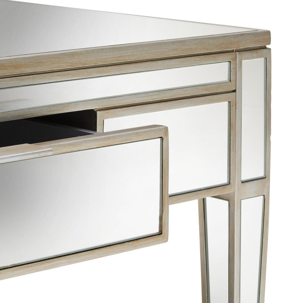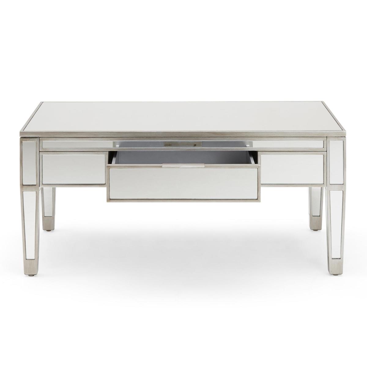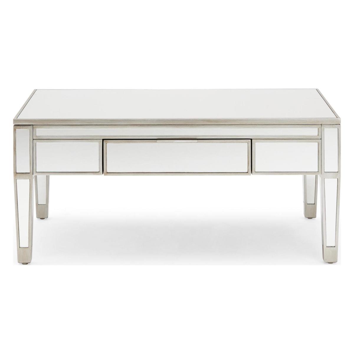 Dunelm Exclusive - Designed and Developed by Dunelm. Designed with a striking and eye-catching style, the Fitzgerald range features a contemporary mirrored glass and a pewter painted frame. Designed with contemporary metal handles, this range will provide an ample storage space whilst adding a touch of opulence and glamour to any room. The Fitzgerald coffee table features a wide, sleek style with a stunning brushed wooden trim and small tapered legs made from solid wood. Supplied with one smooth sliding drawer for extra storage space, this coffee table comes partly-assembled and would look stunning in a host of living spaces.